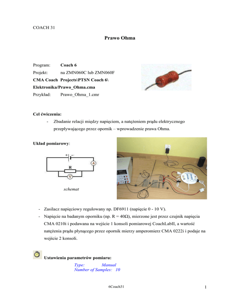 COACH 31 Prawo Ohma Program: Coach 6 Projekt: na ZMN060C lub ZMN060F CMA Coach Projects\PTSN Coach 6\ Elektronika/Prawo_Ohma.cma Przykład: Prawo_Ohma_1.cmr Cel ćwiczenia: - Zbadanie relacji między napięciem, a natęŜeniem prądu elektrycznego przepływającego przez opornik – wprowadzenie prawa Ohma. Układ pomiarowy: schemat - Zasilacz napięciowy regulowany np. DF6911 (napięcie 0 - 10 V). - Napięcie na badanym oporniku (np. R = 40Ω), mierzone jest przez czujnik napięcia CMA 0210i i podawana na wejście 1 konsoli pomiarowej CoachLabII, a wartość natęŜenia prądu płynącego przez opornik mierzy amperomierz CMA 0222i i podaje na wejście 2 konsoli. Ustawienia parametrów pomiaru: Type: Manual Number of Samples: 10 6Coach31 1 Pomiar: Nacisnąć zielony przycisk "start" (F9),. Ustawić Ŝądaną wartość napięcia "U" podawanego przez zasilacz na opornik. Pomiar wykonywany jest w momencie naciśnięcia przycisku "manual start" (F8). Pomiary moŜna powtórzyć dla innych oporników. T - uwagi techniczne: Ze względu na róŜne wartości U (napięcia) dla kaŜdej serii pomiarowej, nie moŜna wykorzystać opcji "copy column" do porównywania wyników tych serii. Trzeba skorzystać z opcji "Import background graph ...". Wyniki pomiarów dla opornika naleŜy zapisać - "Save result as ...", a następnie wczytać poprzez "Import background graph ..." dla diagramu 3 i 4 wybierając jako oś poziomą "U" a pionową odpowiednio "I" i "R". Przykład: SpostrzeŜenia i wnioski: Punkty eksperymentalne na wykresie zaleŜności natęŜenia prądu elektrycznego płynącego przez opornik I od przyłoŜonego napięcia U układają się wzdłuŜ linii prostej. Dopasowując prostą do wyników eksperymentalnych moŜna pokazać, Ŝe przechodzi ona przez początek układu współrzędnych, a więc natęŜenie prądu elektrycznego jest proporcjonalne do przyłoŜonego napięcia I~U 6Coach31 2 Współczynnik proporcjonalności jest charakterystyczny dla danego opornika I = const . U Odwrotność tego współczynnika jest nazywana oporem elektrycznym i oznaczany literą R. R= U I PowyŜszy wzór jest matematycznym zapisem prawa Ohma, które mówi, Ŝe stosunek napięcia przyłoŜonego do końców przewodnika do natęŜenia prądu płynącego przez przewodnik jest wielkością stałą dla danego przewodnika, niezaleŜną od napięcia i natęŜenia prądu. Jednostką oporu elektrycznego jest 1Ω, jest to opór elektryczny takiego przewodnika, przez który pod napięciem 1V płynie prąd elektryczny o natęŜeniu 1A. 1Ω = 1V 1A 6Coach31 3