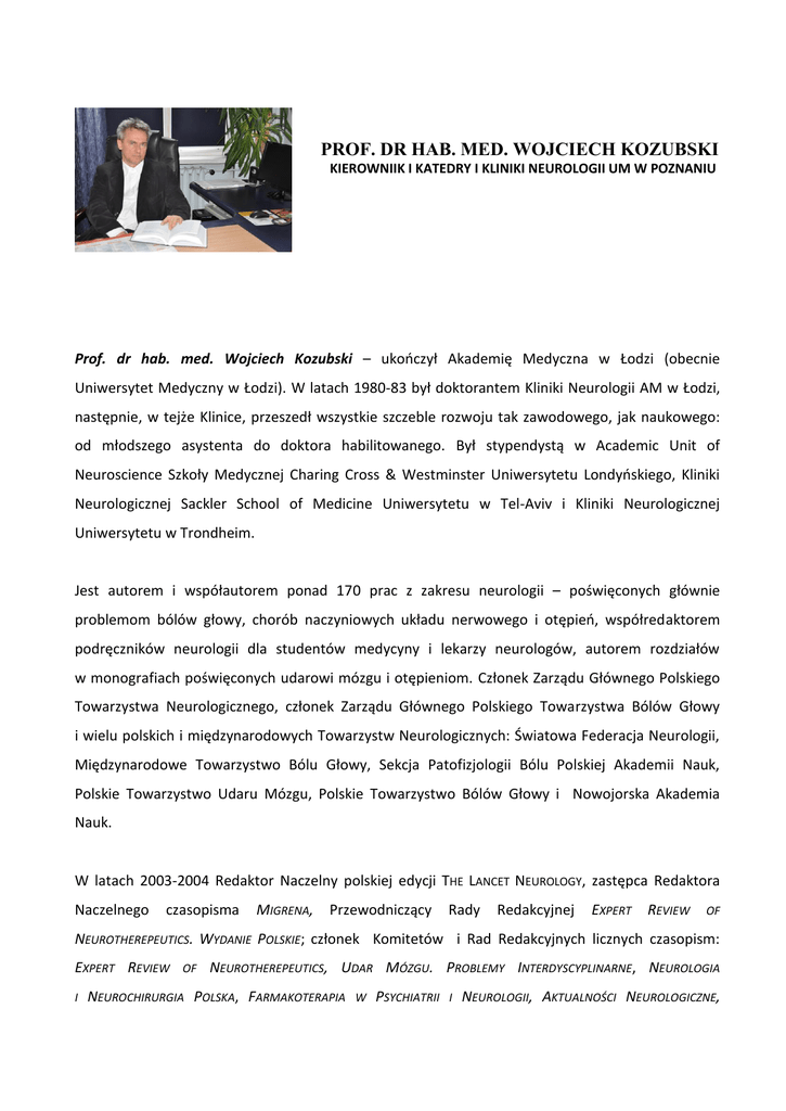 PROF. DR HAB. MED. WOJCIECH KOZUBSKI KIEROWNIIK I KATEDRY I KLINIKI NEUROLOGII UM W POZNANIU Prof. dr hab. med. Wojciech Kozubski – ukończył Akademię Medyczna w Łodzi (obecnie Uniwersytet Medyczny w Łodzi). W latach 1980-83 był doktorantem Kliniki Neurologii AM w Łodzi, następnie, w tejże Klinice, przeszedł wszystkie szczeble rozwoju tak zawodowego, jak naukowego: od młodszego asystenta do doktora habilitowanego. Był stypendystą w Academic Unit of Neuroscience Szkoły Medycznej Charing Cross & Westminster Uniwersytetu Londyńskiego, Kliniki Neurologicznej Sackler School of Medicine Uniwersytetu w Tel-Aviv i Kliniki Neurologicznej Uniwersytetu w Trondheim. Jest autorem i współautorem ponad 170 prac z zakresu neurologii – poświęconych głównie problemom bólów głowy, chorób naczyniowych układu nerwowego i otępień, współredaktorem podręczników neurologii dla studentów medycyny i lekarzy neurologów, autorem rozdziałów w monografiach poświęconych udarowi mózgu i otępieniom. Członek Zarządu Głównego Polskiego Towarzystwa Neurologicznego, członek Zarządu Głównego Polskiego Towarzystwa Bólów Głowy i wielu polskich i międzynarodowych Towarzystw Neurologicznych: Światowa Federacja Neurologii, Międzynarodowe Towarzystwo Bólu Głowy, Sekcja Patofizjologii Bólu Polskiej Akademii Nauk, Polskie Towarzystwo Udaru Mózgu, Polskie Towarzystwo Bólów Głowy i Nowojorska Akademia Nauk. W latach 2003-2004 Redaktor Naczelny polskiej edycji THE LANCET NEUROLOGY, zastępca Redaktora Naczelnego czasopisma MIGRENA, Przewodniczący Rady Redakcyjnej EXPERT REVIEW OF NEUROTHEREPEUTICS. WYDANIE POLSKIE; członek Komitetów i Rad Redakcyjnych licznych czasopism: EXPERT REVIEW I OF NEUROTHEREPEUTICS, UDAR MÓZGU. PROBLEMY INTERDYSCYPLINARNE, NEUROLOGIA NEUROCHIRURGIA POLSKA, FARMAKOTERAPIA W PSYCHIATRII I NEUROLOGII, AKTUALNOŚCI NEUROLOGICZNE, NEUROLOGIA I PSYCHIATRIA. TWÓJ MAGAZYN MEDYCZNY, FARMAKOTERAPIA NADCIŚNIENIA TĘTNICZEGO I CHORÓB WSPÓŁISTNIEJĄCYCH i POLSKI PRZEGLĄD NEUROLOGICZNY. Od 1997 r. - kierownik Katedry i Kliniki Neurologii Akademii Medycznej im. K. Marcinkowskiego w Poznaniu; specjalista wojewódzki z zakresu neurologii w Wielkopolsce.