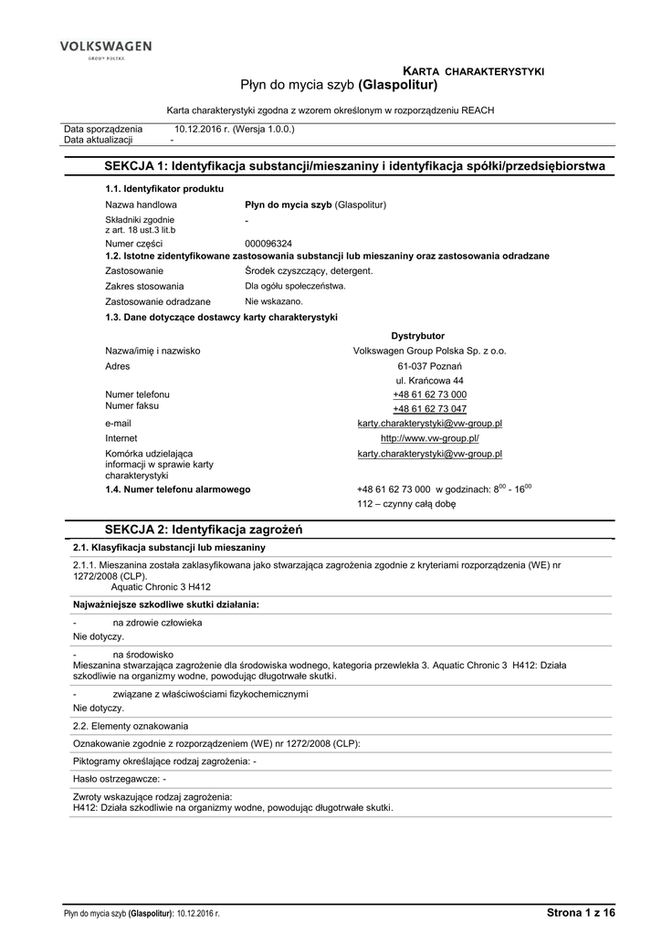 KARTA CHARAKTERYSTYKI Płyn do mycia szyb (Glaspolitur) Karta charakterystyki zgodna z wzorem określonym w rozporządzeniu REACH Data sporządzenia Data aktualizacji 10.12.2016 r. (Wersja 1.0.0.) - SEKCJA 1: Identyfikacja substancji/mieszaniny i identyfikacja spółki/przedsiębiorstwa 1.1. Identyfikator produktu Nazwa handlowa Płyn do mycia szyb (Glaspolitur) Składniki zgodnie z art. 18 ust.3 lit.b - Numer części 000096324 1.2. Istotne zidentyfikowane zastosowania substancji lub mieszaniny oraz zastosowania odradzane Zastosowanie Środek czyszczący, detergent. Zakres stosowania Dla ogółu społeczeństwa. Zastosowanie odradzane Nie wskazano. 1.3. Dane dotyczące dostawcy karty charakterystyki Dystrybutor Nazwa/imię i nazwisko Volkswagen Group Polska Sp. z o.o. 61-037 Poznań ul. Krańcowa 44 Adres Numer telefonu Numer faksu e-mail +48 61 62 73 000 +48 61 62 73 047 [email protected] Internet Komórka udzielająca informacji w sprawie karty charakterystyki 1.4. Numer telefonu alarmowego http://www.vw-group.pl/ [email protected] +48 61 62 73 000 w godzinach: 800 - 1600 112 – czynny całą dobę SEKCJA 2: Identyfikacja zagrożeń 2.1. Klasyfikacja substancji lub mieszaniny 2.1.1. Mieszanina została zaklasyfikowana jako stwarzająca zagrożenia zgodnie z kryteriami rozporządzenia (WE) nr 1272/2008 (CLP). Aquatic Chronic 3 H412 Najważniejsze szkodliwe skutki działania: na zdrowie człowieka Nie dotyczy. na środowisko Mieszanina stwarzająca zagrożenie dla środowiska wodnego, kategoria przewlekła 3. Aquatic Chronic 3 H412: Działa szkodliwie na organizmy wodne, powodując długotrwałe skutki. - związane z właściwościami fizykochemicznymi Nie dotyczy. 2.2. Elementy oznakowania Oznakowanie zgodnie z rozporządzeniem (WE) nr 1272/2008 (CLP): Piktogramy określające rodzaj zagrożenia: Hasło ostrzegawcze: Zwroty wskazujące rodzaj zagrożenia: H412: Działa szkodliwie na organizmy wodne, powodując długotrwałe skutki. Płyn do mycia szyb (Glaspolitur): 10.12.2016 r. Strona 1 z 16 KARTA CHARAKTERYSTYKI Płyn do mycia szyb (Glaspolitur) SEKCJA 2: Identyfikacja zagrożeń Zwroty wskazujące środki ostrożności: P101: W razie konieczności zasięgnięcia porady lekarza, należy pokazać pojemnik lub etykietę. P102: Chronić przed dziećmi. P273: Unikać uwolnienia do środowiska. P501: Zawartość/pojemnik usuwać na składowiska odpadów niebezpiecznych. Informacje uzupełniające o zagrożeniach: Etykieta powinna zawierać identyfikator produktu, o którym mowa w art. 18 rozp. CLP oraz nazwę, adres i telefon dostawcy danej mieszaniny. Dane identyfikujące wszystkie substancje w mieszaninie , które decydują o jej zaklasyfikowaniu zgodnie z Art. 18 pkt. 3b. Nie dotyczy EUH208 Zawiera 1,2-Benzoizotiazol-3(2H)-on, 2-metylo-2H-izotiazol-3-on, 1-Metylo 4-(1-metyloetenylo) cykloheksen. Może powodować wystąpienie reakcji alergicznej. Mieszanina zawiera < 5% niejonowe substancje powierzchniowo czynne 2.3. Inne zagrożenia 2.3.1 Ocena PBT lub vPvB zgodnie z zał. XIII REACH – substancje zawarte w mieszaninie nie zostały zakwalifikowane jako PBT lub vPvB. Kryteria PBT i vPvB zawarte są w Aneksie XIII REACH. 2.3.2. Informacje dotyczące innych zagrożeń, które nie powodują zaklasyfikowania, a które mogą przyczynić się do ogólnych zagrożeń powodowanych przez mieszaninę. Nie dotyczy. SEKCJA 3: Skład/informacja o składnikach 3.1.Substancje Nie dotyczy. Spis substancji w mieszaninie: a) Substancje stanowiące zagrożenie dla zdrowia lub środowiska: Węglowodory, C9-C10, n-alkany, izoalkany, cykliczne, <2% aromatyczne: Zawartość: Nr CAS: Nr WE: Nr indeksowy: Nr rejestracji: Klasyfikacja substancji zgodnie z rozporządzeniem (WE) nr 1272/2008: Poli(oksy-1,2-etanediil), α-(1-oksooktadecen-1-ylo)-ω-[(1-oksooktadecen-1ylo)oksy]- : Zawartość: Nr CAS: Nr WE: Nr rejestracji: Nr indeksowy Klasyfikacja substancji zgodnie z rozporządzeniem (WE) nr 1272/2008: Propan-2-ol Zawartość: Nr CAS: Nr WE: Nr indeksowy: Nr rejestracji: Klasyfikacja substancji zgodnie z rozporządzeniem (WE) nr 1272/2008: Eter n-propylowy glikolu propylenowego: Zawartość: Nr CAS: Płyn do mycia szyb (Glaspolitur): 10.12.2016 r. ≥ 10 - < 20% Nie zaszeregowane 01-2119471843-32 Flam. Liq. 3 H226 STOT SE 3 H336 Asp. Tox. 1 H304 Aquatic Chronic 3 H412 ≥1 - < 5% 52668-97-0 610-881-9 Skin Irrit. 2 H315 > 1 - < 3% 67-63-0 200-661-7 603-117-00-0 01-2119457558-25-xxxx Flam. Liq. 2 H225 STOT SE 3 H336 Eye Irrit. 2 H319 > 1 - <3% 1569-01-3 Strona 2 z 16 KARTA CHARAKTERYSTYKI Płyn do mycia szyb (Glaspolitur) SEKCJA 3: Skład/informacja o składnikach Nr WE: Nr indeksowy: Nr rejestracji: Klasyfikacja substancji zgodnie z rozporządzeniem (WE) nr 1272/2008: (R) - p- Menta-1,8-dien (1-Metylo 4-(1-metyloetenylo) cykloheksen): Zawartość: Nr CAS: Nr WE: Nr rejestracji: Klasyfikacja substancji zgodnie z rozporządzeniem (WE) nr 1272/2008: 1,2-Benzoizotiazol-3(2H)-on: Zawartość: Nr CAS: Nr WE: Nr indeksowy: Nr rejestracji: Klasyfikacja substancji zgodnie z rozporządzeniem (WE) nr 1272/2008: 2-metylo-2H-izotiazol-3-on: Zawartość: Nr CAS: Nr WE: Nr indeksowy: Nr rejestracji: Klasyfikacja substancji zgodnie z rozporządzeniem (WE) nr 1272/2008: 216-372-4 01-2119474443-37-xxxx Flam. Liq. 3 H226 Eye Irrit. 2 H319 ≥ 0,25 - < 1% 5989-27-5 227-813-5 01-2119529223-47-xxxx Flam. Liq. 3 H226 Skin Irrit. 2 H315 Skin Sens. 1B H317 Asp. Tox. 1 H304 Aquatic Acute 1 H400 Aquatic Chronic 1 H410 < 0,05% 2634-33-5 220-120-9 613-088-00-6 Acute Tox. 4; H302 Skin Irrit. 2; H315 Eye Dam. 1; H318 Skin Sens. 1A; H317 Aquatic Acute 1; H400 < 0,01% 2682-20-4 220-239-6 Acute Tox. 3; H301 Acute Tox. 2; H330 Acute Tox. 3; H311 Skin Corr. 1B; H314 Eye Dam. 1; H318 Skin Sens. 1A; H317 Aquatic Acute 1; H400 Aquatic Chronic 1 H410 b) Substancje, dla których istnieją wspólnotowe najwyższe dopuszczalne stężenia w środowisku pracy, które nie zostały zawarte w lit. a): Wszystkie substancje dla których istnieją wspólnotowe 