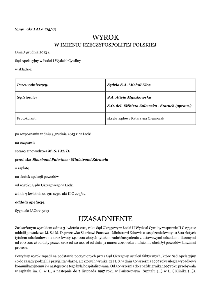 Sygn. akt I ACa 715/13 WYROK W IMIENIU RZECZYPOSPOLITEJ POLSKIEJ Dnia 3 grudnia 2013 r. Sąd Apelacyjny w Łodzi I Wydział Cywilny w składzie: Przewodniczący: Sędzia S.A. Michał Kłos Sędziowie: S.A. Alicja Myszkowska S.O. del. Elżbieta Zalewska - Statuch (spraw.) Protokolant: st.sekr.sądowy Katarzyna Olejniczak po rozpoznaniu w dniu 3 grudnia 2013 r. w Łodzi na rozprawie sprawy z powództwa M. S. i M. D. przeciwko Skarbowi Państwa - Ministrowi Zdrowia o zapłatę na skutek apelacji powodów od wyroku Sądu Okręgowego w Łodzi z dnia 3 kwietnia 2013r. sygn. akt II C 273/12 oddala apelację. Sygn. akt lACa 715/13 UZASADNIENIE Zaskarżonym wyrokiem z dnia 3 kwietnia 2013 roku Sąd Okręgowy w Łodzi II Wydział Cywilny w sprawie II C 273/12 oddalił powództwo M. S. i M. D. przeciwko Skarbowi Państwa - Ministrowi Zdrowia o zasądzenie kwoty 10 800 złotych tytułem odszkodowania oraz kwoty 140 000 złotych tytułem zadośćuczynienia z ustawowymi odsetkami liczonymi od 100 000 zł od daty pozwu oraz od 40 000 zł od dnia 31 marca 2010 roku a także nie obciążył powodów kosztami procesu. Powyższy wyrok zapadł na podstawie poczynionych przez Sąd Okręgowy ustaleń faktycznych, które Sąd Apelacyjny co do zasady podzielił i przyjął za własne, a z których wynika, że H. S. w dniu 30 września 1997 roku uległa wypadkowi komunikacyjnemu i w następstwie tego była hospitalizowana. Od 30 września do 1 października 1997 roku przebywała w szpitalu im. S. w Ł., a następnie do 7 listopada 1997 roku w Państwowym Szpitalu (...) w Ł. ( Klinika (...)). W obu Szpitalach miała wykonywane badania laboratoryjne i podawane leki drogą dożylną Wykonane w dniu 2 października 1997 roku i 3 października 1997 roku próby wątrobowe były prawidłowe. Natomiast próby wątrobowe powtórzone w dniu 19 października 1997 roku były lekko podwyższone. Krwi ani preparatów krwiopochodnych H. S. nie otrzymywała. Po opuszczeniu Kliniki (...) w dniu 12 stycznia 1998 roku trafiła do Szpitala im. (...) w związku z wystąpieniem zażółcenia skóry. Pierwsze dolegliwości pojawiły się cztery dni wcześniej (objawy dyspeptyczne, osłabienie i narastające zażółcenie powłok ciała). Przebieg choroby był dość lekki, ze średniego stopnia uszkodzeniem miąższu wątroby oraz niezbyt nasilonym zażółceniem skóry. Po kilku dniach pobytu H. S. nie zgłaszała dolegliwości. W trakcie pobytu pacjentki w szpitalu nie odnotowano obniżonej wydolności wątroby i zagrożenia śpiączką wątrobową. H. S. do domu wypisano z rozpoznaniem wirusowego zapalenia wątroby typu C, półpaścem międzyżebrowym, stanem po urazie mózgu, z próbami wątrobowymi, mającymi tendencje ku normalizacji i zaleceniem kontroli w Poradni Chorób Wątroby. Zgodnie z zaleceniami H. S. systematycznie zgłaszała się do Poradni Chorób Wątroby - próby wątrobowe były w normie. W badaniu wykonanym w dniu 1 października 1998 roku stwierdzono obecność HCV - RNA, co świadczyło o utrzymywaniu się obecności wirusa w surowicy krwi, pomimo braku biochemicznych cech zapalenia wątroby. W związku z powyższym w dniu 8 czerwca 1998 roku H. S. wniosła pozew przeciwko Akademii Medycznej w Ł. Klinice (...) i Gminie Ł. - Szpitalowi (...) w Ł., domagając się zasądzenia solidarnie od pozwanych kwoty 25 000 złotych tytułem zadośćuczynienia za uszczerbek na zdrowiu, związany z zakażeniem wirusem żółtaczki typu C, kwoty 2 400 złotych jako odszkodowania z tytułu kosztów diety i zakupu leków, kwoty 200 złotych z tytułu dodatkowego wyżywienia przez cały pobyt w szpitalu. Sprawa prowadzona była za numerem II C 1345/98 i ostatecznie stronę pozwaną oznaczono jako: Skarb Państwa Wojewoda i Minister Zdrowia i Opieki Społecznej oraz Gmina Ł. - Prezydent Miasta Ł.. Wyrokiem z dnia 17 kwietnia 2000 roku Sąd Okręgowy w Łodzi zasądził na rzecz H. S. od Skarbu Państwa - Ministra Zdrowia i Opieki Społecznej kwotę 20 000 zł tytułem zadośćuczynienia z odsetkami, kwotę 2 220 złotych tytułem kosztów diety i leczenia z odsetkami, kwotę 6440 złotych tytułem zwrotu kosztów procesu oraz oddalił powództwo w pozostałej części. W uzasadnieniu Sąd wskazał, że prawdopodobnymi źródłami zakażenia musiały być zaniedbania personelu medycznego w przestrzeganiu zasad reżimu sanitarno - epidemiologicznego od czasu pobytu i badań powódki w szpitalach. Zostało ustalone, że najbardziej prawdopodobnym źródłem zakażenia był pobyt H. S. w Klinice (...) w Ł.. W konsekwencji Sąd przyjął ostatecznie odpowiedzialność Ministra Zdrowia i Opieki Społecznej, bowiem (...) Akademii Medycznej w Ł. utracił legitymację procesową bierną - przekształcił się w samodzielny publiczny zakład opieki zdrowotnej, który nie odpowiadał za zobowiązania Skarbu Państwa. Ustalając wysokość zadośćuczynienia na poziomie 20 000 zł Sąd wziął pod uwagę wiek powódki, rodzaj zakażenia wirusem - żółtaczka wszczepienna typu C, rozwinięcie się u powódki przewlekłego zapalenia wątroby w formie mało aktywnej, trwały charakter powstałych zmian, 20 - 25 % trwały uszczerbek na zdrowiu, przeciwwskazania do ewentualnego zastosowania Interferonu i Ribawiryny, które u części chorych powodują wyleczenie lub poprawę, pewne ograniczenia życia codziennego, związane z koniecznością okresowego stosowania diety, konieczność pozostawania pod stałą opieką lekarską, dość lekki i typowy przebieg choroby ze średniego stopnia uszkodzeniem miąższu wątroby oraz niezbyt nasilonym zażółceniem skóry. Sąd uwzględnił również żądanie powódki związane z kosztami leczenia i diety wynikającej z zakażenia. Z kolejnym pozwem H. S. wystąpiła w 2001 roku, dochodząc roszczeń odszkodowawczych związanych z wirusowym zapaleniem wątroby typu C w sprawie o sygnaturze akt I C 332/01, jaka toczyła się przed Sądem Rejonowym dla Łodzi - Śródmieścia w Łodzi. Pozew zosta