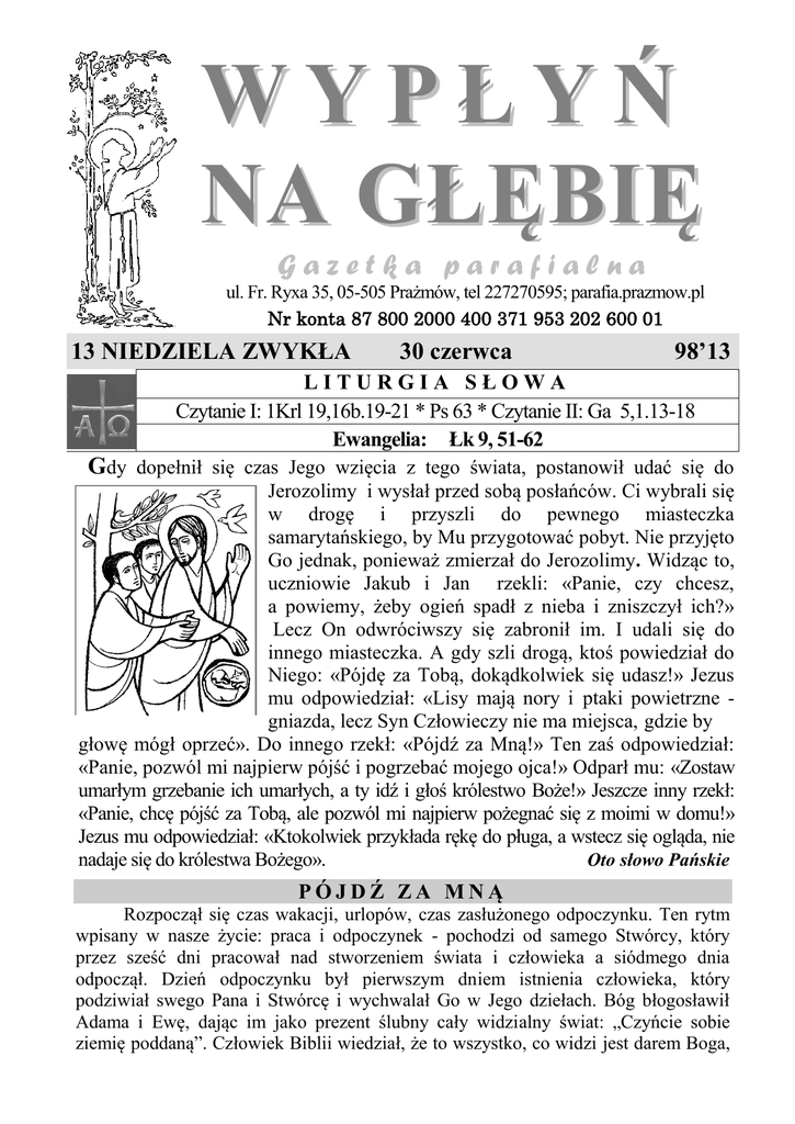 WYPŁYŃ NA GŁĘBIĘ Gazetka parafialna ul. Fr. Ryxa 35, 05-505 Prażmów, tel 227270595; parafia.prazmow.pl Nr konta 87 800 2000 400 371 953 202 600 01 13 NIEDZIELA ZWYKŁA 30 czerwca 98’13 LITURGIA SŁOWA Czytanie I: 1Krl 19,16b.19-21 * Ps 63 * Czytanie II: Ga 5,1.13-18 Ewangelia: Łk 9, 51-62 Gdy dopełnił się czas Jego wzięcia z tego świata, postanowił udać się do Jerozolimy i wysłał przed sobą posłańców. Ci wybrali się w drogę i przyszli do pewnego miasteczka samarytańskiego, by Mu przygotować pobyt. Nie przyjęto Go jednak, ponieważ zmierzał do Jerozolimy. Widząc to, uczniowie Jakub i Jan rzekli: «Panie, czy chcesz, a powiemy, żeby ogień spadł z nieba i zniszczył ich?» Lecz On odwróciwszy się zabronił im. I udali się do innego miasteczka. A gdy szli drogą, ktoś powiedział do Niego: «Pójdę za Tobą, dokądkolwiek się udasz!» Jezus mu odpowiedział: «Lisy mają nory i ptaki powietrzne gniazda, lecz Syn Człowieczy nie ma miejsca, gdzie by głowę mógł oprzeć». Do innego rzekł: «Pójdź za Mną!» Ten zaś odpowiedział: «Panie, pozwól mi najpierw pójść i pogrzebać mojego ojca!» Odparł mu: «Zostaw umarłym grzebanie ich umarłych, a ty idź i głoś królestwo Boże!» Jeszcze inny rzekł: «Panie, chcę pójść za Tobą, ale pozwól mi najpierw pożegnać się z moimi w domu!» Jezus mu odpowiedział: «Ktokolwiek przykłada rękę do pługa, a wstecz się ogląda, nie nadaje się do królestwa Bożego». Oto słowo Pańskie PÓJDŹ ZA MNĄ Rozpoczął się czas wakacji, urlopów, czas zasłużonego odpoczynku. Ten rytm wpisany w nasze życie: praca i odpoczynek - pochodzi od samego Stwórcy, który przez sześć dni pracował nad stworzeniem świata i człowieka a siódmego dnia odpoczął. Dzień odpoczynku był pierwszym dniem istnienia człowieka, który podziwiał swego Pana i Stwórcę i wychwalał Go w Jego dziełach. Bóg błogosławił Adama i Ewę, dając im jako prezent ślubny cały widzialny świat: „Czyńcie sobie ziemię poddaną”. Człowiek Biblii wiedział, że to wszystko, co widzi jest darem Boga, znakiem jego pierwotnego błogosławieństwa. W przeciwieństwie do pogan nie ubóstwiał widzialnego świata lecz uwielbiał Boga, który jest Stwórcą nieba i ziemi. Bardzo trafnie ten stan oddaje modlitwa trzech młodzieńców z księgi Daniela. Zostali skazani na śmierć dlatego, że nie oddali pokłonu złotemu posągowi, który kazał wykonać król Nabuchodonozor. Wrzuceni do pieca hutniczego na okrutną śmierć śpiewali hymn uwielbienia: „Błogosławcie Pana wszystkie dzieła Pańskie, chwalcie Go i wywyższajcie na wieki”. I tu następuje wyliczanie wszystkich dzieł, które swym istnieniem błogosławią Stwórcę: „Aniołowie Pańscy, niebiosa, wszystkie potęgi, słonce i księżyc, gwiazdy na niebie, deszcze i rosy, wichry niebieskie, ogień i żar, upał i chłód, rosy i szrony, mrozy i zimna, lody i śniegi, dnie i noce, światło i ciemności, błyskawice i chmury, góry i pagórki, wszelkie rośliny na ziemi, źródła wodne, morza i rzeki, wieloryby i morskie stworzenia, wszelkie ptaki powietrzne, dzikie zwierzęta i trzody”. I wreszcie ukoronowanie całego stworzenia: „synowie ludzcy, domu Izraela, słudzy Pańscy, święci i pokornego serca chwalcie Go i wywyższajcie na wieki” (por. Dn 3, 57-58). To ciekawe, że w obliczu niesprawiedliwej śmierci młodzieńcy nie złorzeczą na swój los, nie przeklinają oprawców lecz wychwalają Pana. Nie wpatrują się w zło tego świata lecz w łaskę Dobrego Boga. Jak wiemy zostali cudownie ocaleni przed śmiercią w płomieniach. Ta modlitwa jest drogowskazem dla wszystkich wierzących. Święty Maksymilian w obozie koncentracyjnym wraz z grupą skazanych na śmierć głodową modlił się i wychwalał Pana przez kilkanaście dni powolnego umierania w okrutnych cierpieniach. Nie zostali cudownie przywróceni do życia ziemskiego ale zostali cudowanie ocaleni przed śmiercią wieczną. Niedziela to dzień dziękczynienia i uwielbienia Boga za wielkie rzeczy, które nam uczynił. Chcemy wpatrywać się w światło Jego łaski i otwierać serca na moc Słowa, które oczyszcza i uświęca nasze dusze. Święty Jan zapisał, że gdy Judasz opuścił pierwszą Eucharystię i wyszedł z wieczernika – była noc. Judasz opuścił rozświetloną łaską wspólnotę apostołów zgromadzoną wokół Jezusa i wyszedł w ciemność grzechu i kłamstwa. Warto zauważyć, że pozostali w wieczerniku uczniowie nie rzucili się do okien, by patrzeć w ciemność za Judaszem lecz pozostali w kręgu światła – przy Chrystusie. Punktem odniesienie nie jest ciemność zła i grzechu lecz światło łaski i prawdy. Świat naznaczony złem kusi nas, byśmy kontemplowali ciemność. Środki przekazu prześcigają się ukazywaniu ciemności zła i grzechu. Często próbuje się nam wmówić, że ewangelia Judasza jest bardziej atrakcyjna niż Dobra Nowina o Jezusie Chrystusie, który przeszedł przez życie dobrze czyniąc i uzdrawiając wszystkich, którzy byli pod władzą diabła. W dzisiejszej Ewangelii widzimy Jezusa wędrującego do Jerozolimy, aby dopełnić dzieła zbawczego. Jedno z miasteczek samarytańskich nie udzieliło gościny Jezusowi i Jego uczniom. Jak widzimy napięcia w Ziemi Świętej są cechą charakterystyczną nie tylko obecnego czasu. Jakub i Jan są oburzeni taką postawą Samarytan. Przecież Jezus i uczniowie nic złego nie czynią, są pobożnymi pielgrzymami w drodze do święto miasta. Nie mieszają się do polityki. Wraz ze swym Mistrzem są apostołami pokoju i miłości. I z tego świętego oburzenia rodzi się pragnienie zrobienia natychmiastowego porządku. Jakub i Jan czują w sobie wielką moc i gorliwość apostolską. Pamiętali niedawną wyprawę misyjną, gdy Pan ich rozesłał po dwóch dając im moc nad duchami nieczystymi i władzę uzdrawiania. Może warto użyć teraz tej mocy, by wyplenić z ziemi niespr