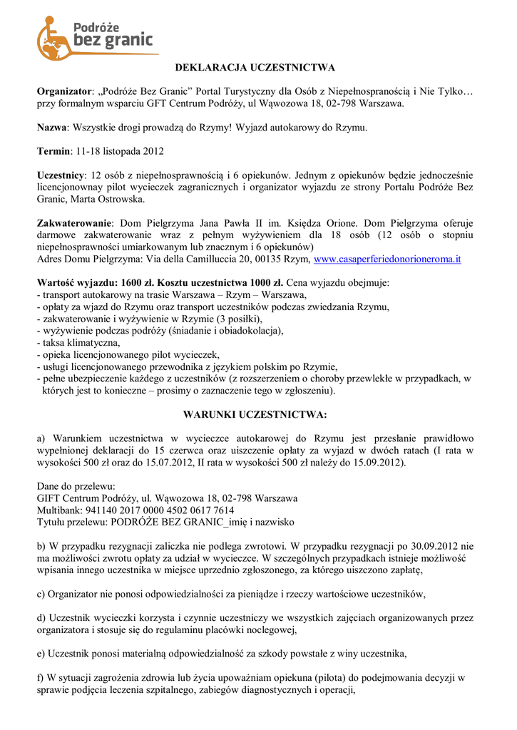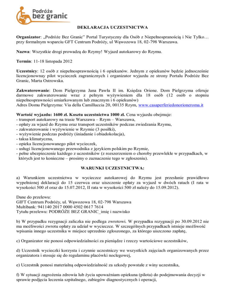 DEKLARACJA UCZESTNICTWA Organizator: „Podróże Bez Granic” Portal Turystyczny dla Osób z Niepełnospranością i Nie Tylko… przy formalnym wsparciu GFT Centrum Podróży, ul Wąwozowa 18, 02-798 Warszawa. Nazwa: Wszystkie drogi prowadzą do Rzymy! Wyjazd autokarowy do Rzymu. Termin: 11-18 listopada 2012 Uczestnicy: 12 osób z niepełnosprawnością i 6 opiekunów. Jednym z opiekunów będzie jednocześnie licencjonownay pilot wycieczek zagranicznych i organizator wyjazdu ze strony Portalu Podróże Bez Granic, Marta Ostrowska. Zakwaterowanie: Dom Pielgrzyma Jana Pawła II im. Księdza Orione. Dom Pielgrzyma oferuje darmowe zakwaterowanie wraz z pełnym wyżywieniem dla 18 osób (12 osób o stopniu niepełnosprawności umiarkowanym lub znacznym i 6 opiekunów) Adres Domu Pielgrzyma: Via della Camilluccia 20, 00135 Rzym, www.casaperferiedonorioneroma.it Wartość wyjazdu: 1600 zł. Kosztu uczestnictwa 1000 zł. Cena wyjazdu obejmuje: - transport autokarowy na trasie Warszawa – Rzym – Warszawa, - opłaty za wjazd do Rzymu oraz transport uczestników podczas zwiedzania Rzymu, - zakwaterowanie i wyżywienie w Rzymie (3 posiłki), - wyżywienie podczas podróży (śniadanie i obiadokolacja), - taksa klimatyczna, - opieka licencjonowanego pilot wycieczek, - usługi licencjonowanego przewodnika z językiem polskim po Rzymie, - pełne ubezpieczenie każdego z uczestników (z rozszerzeniem o choroby przewlekłe w przypadkach, w których jest to konieczne – prosimy o zaznaczenie tego w zgłoszeniu). WARUNKI UCZESTNICTWA: a) Warunkiem uczestnictwa w wycieczce autokarowej do Rzymu jest przesłanie prawidłowo wypełnionej deklaracji do 15 czerwca oraz uiszczenie opłaty za wyjazd w dwóch ratach (I rata w wysokości 500 zł oraz do 15.07.2012, II rata w wysokości 500 zł należy do 15.09.2012). Dane do przelewu: GIFT Centrum Podróży, ul. Wąwozowa 18, 02-798 Warszawa Multibank: 941140 2017 0000 4502 0617 7614 Tytułu przelewu: PODRÓŻE BEZ GRANIC_imię i nazwisko b) W przypadku rezygnacji zaliczka nie podlega zwrotowi. W przypadku rezygnacji po 30.09.2012 nie ma możliwości zwrotu opłaty za udział w wycieczce. W szczególnych przypadkach istnieje możliwość wpisania innego uczestnika w miejsce uprzednio zgłoszonego, za którego uiszczono zapłatę, c) Organizator nie ponosi odpowiedzialności za pieniądze i rzeczy wartościowe uczestników, d) Uczestnik wycieczki korzysta i czynnie uczestniczy we wszystkich zajęciach organizowanych przez organizatora i stosuje się do regulaminu placówki noclegowej, e) Uczestnik ponosi materialną odpowiedzialność za szkody powstałe z winy uczestnika, f) W sytuacji zagrożenia zdrowia lub życia upoważniam opiekuna (pilota) do podejmowania decyzji w sprawie podjęcia leczenia szpitalnego, zabiegów diagnostycznych i operacji, DANE UCZESTNIKA: Imiona: Nazwisko: Data urodzenia: Miejsce urodzenia: PESEL: Dowód osobisty (paszport): Wydany przez: Data ważności dokumentu: Adres zameldowania: Rodzaj i stopień niepełnosprawności: Kontakt telefoniczny: e-mail: w razie konieczności powiadomić: Deklaruję moje uczestnictwo w wycieczce do Rzymu i zobowiązuję się do wpłaty zaliczki w kwocie 500 zł do dnia 15.07.2012, pozostałą część tj. 500 zł do dnia 15.09.2012 Oświadczam, że zapoznałem/am się z regulaminem i warunkami wyjazdu. Jednocześnie oświadczam, że stan zdrowia pozwala mi na udział w tej wycieczce. Oświadczam, iż potrzebuję ubezpieczenie z rozszerzeniem o choroby przewlekłe: TAK / NIE. ZGODA NA PRZETWARZANIE DANYCH OSOBOWYCH Oświadczam, że wyrażam zgodę na przetwarzanie podanych przeze mnie danych osobowych do wszystkich celów związanych ze złożoną przeze mnie deklaracją, zgodnie z Ustawą o ochronie danych osobowych z 29.08.1997r. (Dz. U. Nr 133 poz. 883 z 1997r.) Podpis uczestnika: Miejscowość i data: