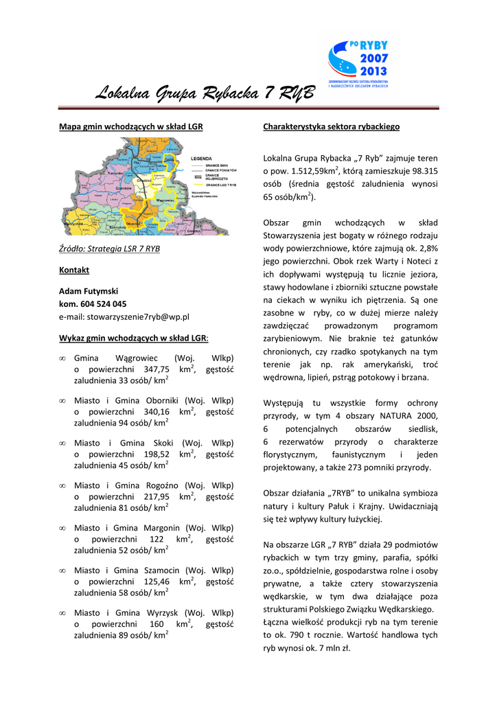 Lokalna Grupa Rybacka 7 RYB Charakterystyka sektora rybackiego Mapa gmin wchodzących w skład LGR Lokalna Grupa Rybacka „7 Ryb” zajmuje teren o pow. 1.512,59km2, którą zamieszkuje 98.315 osób (średnia gęstość zaludnienia wynosi 65 osób/km2). Źródło: Strategia LSR 7 RYB Kontakt Adam Futymski kom. 604 524 045 e-mail: [email protected] Wykaz gmin wchodzących w skład LGR: • Gmina Wągrowiec (Woj. o powierzchni 347,75 km2, zaludnienia 33 osób/ km2 • Miasto i Gmina Oborniki (Woj. Wlkp) o powierzchni 340,16 km2, gęstość zaludnienia 94 osób/ km2 • Miasto i Gmina Skoki (Woj. Wlkp) o powierzchni 198,52 km2, gęstość zaludnienia 45 osób/ km2 • Miasto i Gmina Rogoźno (Woj. Wlkp) o powierzchni 217,95 km2, gęstość zaludnienia 81 osób/ km2 • Miasto i Gmina Margonin (Woj. Wlkp) o powierzchni 122 km2, gęstość zaludnienia 52 osób/ km2 Wlkp) gęstość • Miasto i Gmina Szamocin (Woj. Wlkp) o powierzchni 125,46 km2, gęstość zaludnienia 58 osób/ km2 • Miasto i Gmina Wyrzysk (Woj. Wlkp) o powierzchni 160 km2, gęstość zaludnienia 89 osób/ km2 Obszar gmin wchodzących w skład Stowarzyszenia jest bogaty w różnego rodzaju wody powierzchniowe, które zajmują ok. 2,8% jego powierzchni. Obok rzek Warty i Noteci z ich dopływami występują tu licznie jeziora, stawy hodowlane i zbiorniki sztuczne powstałe na ciekach w wyniku ich piętrzenia. Są one zasobne w ryby, co w dużej mierze należy zawdzięczać prowadzonym programom zarybieniowym. Nie braknie też gatunków chronionych, czy rzadko spotykanych na tym terenie jak np. rak amerykański, troć wędrowna, lipień, pstrąg potokowy i brzana. Występują tu wszystkie formy ochrony przyrody, w tym 4 obszary NATURA 2000, 6 potencjalnych obszarów siedlisk, 6 rezerwatów przyrody o charakterze florystycznym, faunistycznym i jeden projektowany, a także 273 pomniki przyrody. Obszar działania „7RYB” to unikalna symbioza natury i kultury Pałuk i Krajny. Uwidaczniają się też wpływy kultury łużyckiej. Na obszarze LGR „7 RYB” działa 29 podmiotów rybackich w tym trzy gminy, parafia, spółki zo.o., spółdzielnie, gospodarstwa rolne i osoby prywatne, a także cztery stowarzyszenia wędkarskie, w tym dwa działające poza strukturami Polskiego Związku Wędkarskiego. Łączna wielkość produkcji ryb na tym terenie to ok. 790 t rocznie. Wartość handlowa tych ryb wynosi ok. 7 mln zł. Lokalna Grupa Rybacka 7 RYB Podział środków finansowych na dwuletnie okresy: • I okres – lata 2010-2011- planuje się wykorzystanie 10.440.000 zł, • II okres – lata 2012-2013- planuje się wykorzystanie 11.470.000 zł, • III okres – lata 2014-2015- planuje się wykorzystanie 1.587.285 zł. Źródło: fot. Paweł Dykban, MiG Skoki Budżet Planowany budżet LGR na lata 2010-2015 to 23.497.285 zł , w tym : • 37 % środków przeznaczono na Wzmocnienie konkurencyjności i utrzymanie atrakcyjności obszarów zależnych od rybactwa, • 17 % środków przeznaczono na Restrukturyzację i reorientację działalności gospodarczej oraz dywersyfikacja zatrudnienia osób mających pracę związaną z sektorem rybactwa w drodze tworzenia dodatkowych miejsc pracy poza tym sektorem • 18% środków przeznaczono na Podnoszenie wartości produktów rybactwa, rozwój usług na rzecz społeczności zamieszkującej obszary zależne od rybactwa • 19% środków przeznaczono na Ochronę środowiska i dziedzictwa przyrodniczego na obszarach zależnych od rybactwa w celu utrzymania jego atrakcyjności oraz przywracania potencjału produkcyjnego sektora rybactwa w przypadku jego zniszczenia w wyniku klęski żywiołowej • 7% środków przeznaczono na Funkcjonowanie LGR oraz nabywanie umiejętności i aktywizację lokalnych społeczności • 2% środków przeznaczono na Wsparcie na rzecz współpracy międzyregionalnej i międzynarodowej Cele i działania Cel ogólny 1 to Poprawa warunków życia na obszarze objętym LSROR Cele szczegółowe: • Poprawa łady i funkcjonalności przestrzeni publicznej, • Poprawa atrakcyjnych możliwości spędzania czasu wolnego, • Wzbogacenie oferty sektora usług dla ludności, • Integracja mieszkańców i wzmocnienie tożsamości lokalnej, Cel ogólny 2 to Wzrost znaczenia sektora rybackiego w gospodarce obszaru 7 RYB Cele szczegółowe: • Poprawa warunków wodnośrodowiskowych prowadzenia działalności w sektorze rybackim, • Skuteczny marketing produktów rybactwa, • Dywersyfikacja dochodów gospodarstw rybackich i tworzenie nowych miejsc pracy poza sektorem rybackim. Cel ogólny 3 to Rozwój turystyki i rekreacji Cele szczegółowe: • Rozbudowa infrastruktury turystycznorekreacyjnej, • Rozwój usług turystycznorekreacyjnych, • Ochrona zasobów przyrodniczych, • Promocja walorów turystyczno – rekreacyjnych. Lokalna Grupa Rybacka 7 RYB W ramach środka „Żyć wygodnie, ciekawie i zdrowo na obszarze 7 RYB” (cel ogólny 1) przewiduje się wsparcie działań polegających m.in. na: • adaptacji i wyposażeniu miejsc, w których będą świadczone usługi dostępu do sieci Internet, • rewitalizacji miejscowości, • organizowaniu kół zainteresowań dla dzieci i młodzieży, • podejmowaniu i rozwoju działalności gospodarczej, • renowacji, zabezpieczeniu i oznakowaniu kąpielisk. W ramach środka „Zagłębie rybackie Wielkopolski” (cel ogólny 2) przewiduje się wsparcie działań polegających m.in. na: • tworzeniu i rozwoju alternatywnych systemów sprzedaży bezpośredniej produktów rybactwa, • zachowaniu różnorodności biologicznej i chronionych gatunków ryb lub innych organizmów wodnych, W ramach środka „Zdrowy odpoczynek i niezapomniane wrażenia na obszarze 7 RYB” (cel ogólny 3) przewiduje się wsparcie działań polegających m.in. na: • remoncie, odbudowie lub przebudowie obiektów wpisanych do rejestru zabytków lub objętych wojewódzką ewidencją zabytków, • budowie, remoncie lub przebudowie małej infrastrukt