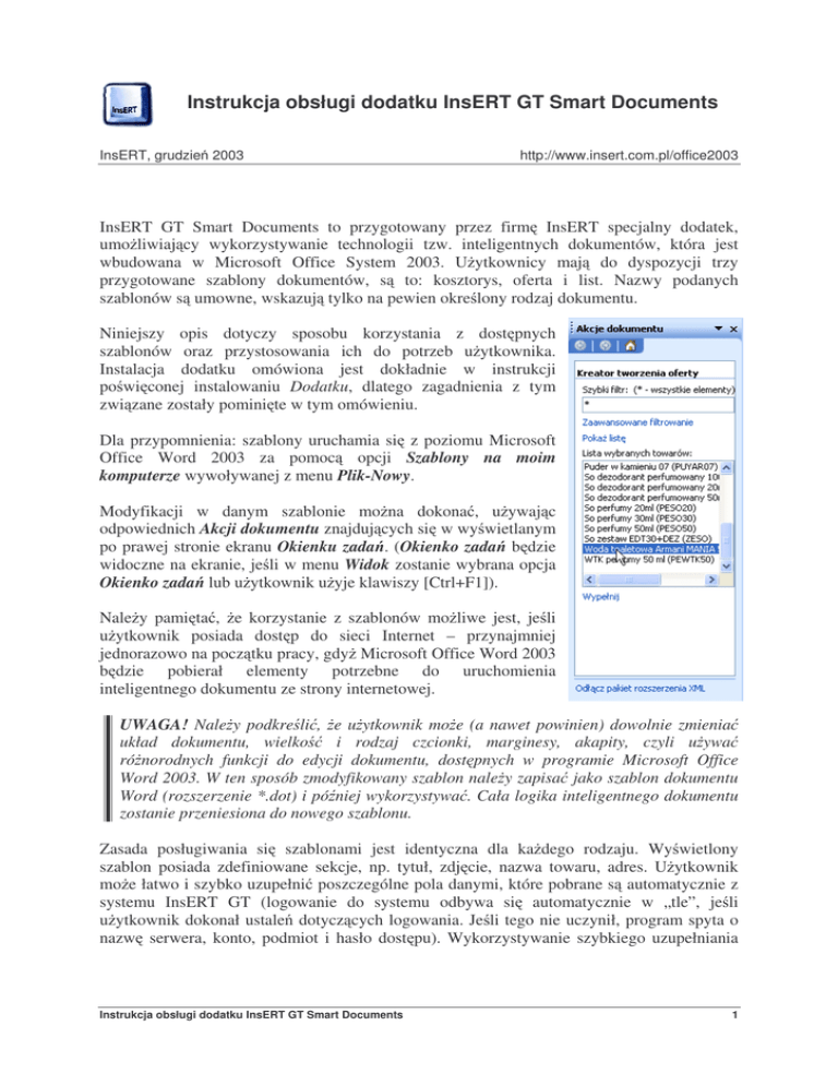 Instrukcja obsługi dodatku InsERT GT Smart Documents InsERT, grudzie 2003 http://www.insert.com.pl/office2003 InsERT GT Smart Documents to przygotowany przez firm InsERT specjalny dodatek, umo liwiaj cy wykorzystywanie technologii tzw. inteligentnych dokumentów, która jest wbudowana w Microsoft Office System 2003. U ytkownicy maj do dyspozycji trzy przygotowane szablony dokumentów, s to: kosztorys, oferta i list. Nazwy podanych szablonów s umowne, wskazuj tylko na pewien okre lony rodzaj dokumentu. Niniejszy opis dotyczy sposobu korzystania z dost pnych szablonów oraz przystosowania ich do potrzeb u ytkownika. Instalacja dodatku omówiona jest dokładnie w instrukcji po wi conej instalowaniu Dodatku, dlatego zagadnienia z tym zwi zane zostały pomini te w tym omówieniu. Dla przypomnienia: szablony uruchamia si z poziomu Microsoft Office Word 2003 za pomoc opcji Szablony na moim komputerze wywoływanej z menu Plik-Nowy. Modyfikacji w danym szablonie mo na dokona , u ywaj c odpowiednich Akcji dokumentu znajduj cych si w wy wietlanym po prawej stronie ekranu Okienku zada . (Okienko zada b dzie widoczne na ekranie, je li w menu Widok zostanie wybrana opcja Okienko zada lub u ytkownik u yje klawiszy [Ctrl+F1]). Nale y pami ta , e korzystanie z szablonów mo liwe jest, je li u ytkownik posiada dost p do sieci Internet – przynajmniej jednorazowo na pocz tku pracy, gdy Microsoft Office Word 2003 b dzie pobierał elementy potrzebne do uruchomienia inteligentnego dokumentu ze strony internetowej. UWAGA! Nale y podkre li , e u ytkownik mo e (a nawet powinien) dowolnie zmienia układ dokumentu, wielko i rodzaj czcionki, marginesy, akapity, czyli u ywa ró norodnych funkcji do edycji dokumentu, dost pnych w programie Microsoft Office Word 2003. W ten sposób zmodyfikowany szablon nale y zapisa jako szablon dokumentu Word (rozszerzenie *.dot) i pó niej wykorzystywa . Cała logika inteligentnego dokumentu zostanie przeniesiona do nowego szablonu. Zasada posługiwania si szablonami jest identyczna dla ka dego rodzaju. Wy wietlony szablon posiada zdefiniowane sekcje, np. tytuł, zdj cie, nazwa towaru, adres. U ytkownik mo e łatwo i szybko uzupełni poszczególne pola danymi, które pobrane s automatycznie z systemu InsERT GT (logowanie do systemu odbywa si automatycznie w „tle”, je li u ytkownik dokonał ustale dotycz cych logowania. Je li tego nie uczynił, program spyta o nazw serwera, konto, podmiot i hasło dost pu). Wykorzystywanie szybkiego uzupełniania Instrukcja obsługi dodatku InsERT GT Smart Documents 1 danych zgromadzonych w innych systemach jest typowe dla technologii inteligentnych dokumentów. Ustawienie kursora w danej sekcji szablonu dokumentu powoduje udost pnienie odpowiedniej akcji, np. sekcja przeznaczona na dane adresowe kontrahenta udost pni akcj Dane klienta. Instrukcja obsługi dodatku InsERT GT Smart Documents 2 Szablon kosztorysu Pierwszym dost pnym szablonem przygotowanym przez InsERT jest Kosztorys. Jak ju wspomniano, ka d z sekcji znajduj cych si w szablonie mo na zmieni (dotyczy to tak e grafiki i tytułu Kosztorys, który mo na zmieni np. na Zamówienie). W Okienku zada zawarte s funkcje (akcje) zwi zane z aktualnie wskazan przez u ytkownika sekcj szablonu (w tym wypadku sekcje dotycz danych klienta oraz towaru lub usługi). W Okienku zada pojawi si tak e filtr. Przy obszernych zbiorach danych kartotekowych „ ci ganie” wszystkich danych trwałoby bardzo długo, niewygodne byłoby równie ich przegl danie na li cie, dlatego warto zaw zi zakres przedstawianych danych, stosuj c filtr. Wystarczy w pole Szybki filtr wpisa np. pocz tkowe litery lub wykorzysta funkcj Zaawansowane filtrowanie, która uruchamia pomocnicze okno Parametry filtra, umo liwiaj ce dokonanie odpowiednich ustawie . Instrukcja obsługi dodatku InsERT GT Smart Documents 3 Znak * w polu Filtr wskazuje, e brane b d pod uwag wszystkie elementy z danej kartoteki (w tym wypadku kontrahentów lub towarów). Dane z kartoteki przedstawiane s w postaci listy, któr nale y najpierw aktywowa za pomoc opcji Poka list . Wskazanie danego zapisu na li cie spowoduje, e pozostałe pola w Okienku zada zostan odpowiednio uzupełnione. Nale y pami ta , e warunkiem automatycznego wprowadzenia odpowiednich danych jest obecno ich w systemie InsERT GT (je li w danych wybranego kontrahent nie ma np. informacji o osobie, z któr nale y si kontaktowa , wówczas dane takie nie b d mogły by pobrane z kartoteki i nale y uzupełni je r cznie, wpisuj c je w cz ci Osoba kontaktowa). W przypadku towaru nale y dodatkowo okre li ilo (domy lnie uzupełniana jest cena jednostkowa), by program wyliczył ostateczn warto . Wszystkie uzupełnione automatycznie dane mo na oczywi cie modyfikowa . W dolnej cz ci Okienka zada znajduj si funkcje umo liwiaj ce zarz dzanie danymi w szablonie: Wstaw – powoduje wprowadzenie do szablonu danych kontrahenta na podstawie pól z Okienka zada (nazwy pełnej, danych adresowych, osoby kontaktowej); powoduje dodanie do szablonu wybranego towaru, usługi lub kompletu na podstawie danych z pól z Okienka zada (nazwa, ilo , jednostka miary, cena, warto ). Zmie – wprowadza zmiany do szablonu na podstawie modyfikacji dokonanych w polach z Okienka zada . Aktualizuj – aktualizuje dane na podstawie zmian wprowadzonych w pola Okienka zada (np. je li u ytkownik zmienił ilo wybranego towaru, wówczas po naci ni ciu funkcji Aktualizuj zostanie zmieniona warto dokumentu (na podstawie ceny jednostkowej), powtórne naci niecie funkcji Aktualizuj zaktualizuje dane w szablonie). Usu – usuwa wskazany w dokumencie towar. Szablon kosztorysu jest najbardziej rozbudowanych szablonem dodatku InsERT GT Smart Documents, dlatego najbardziej nadaje si do zastosowania ciekawych przeróbek. Na jego podstawie łatwo mo na bowiem stworzy elegancki szablon oferty, zamówienia, wyceny robocizny, a nawet faktury (np. faktury pro forma). Zach camy szczególnie do pełnej modyfikacji jego szaty graficznej i układu tego sz