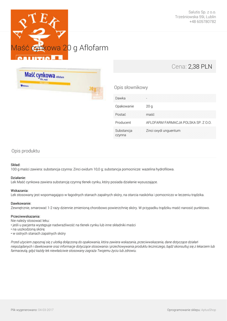 Salutis Sp. z o.o. Trześniowska 59i, Lublin +48 605780782 Maść cynkowa 20 g Aflofarm Cena: 2,38 PLN Opis słownikowy Dawka - Opakowanie 20 g Postać maść Producent AFLOFARM FARMACJA POLSKA SP. Z O.O. Substancja czynna Zinci oxydi unguentum Opis produktu Skład: 100 g maści zawiera: substancja czynna: Zinci oxidum 10,0 g; substancja pomocnicze: wazelina hydrofilowa. Działanie: Lek Maść cynkowa zawiera substancję czynną tlenek cynku, który posiada działanie wysuszające. Wskazania: Lek stosowany jest wspomagająco w łagodnych stanach zapalnych skóry, na otarcia naskórka i pomocniczo w leczeniu trądzika. Dawkowanie: Zewnętrznie, smarować 1-2 razy dziennie zmienioną chorobowo powierzchnię skóry. W przypadku trądziku maść nanosić punktowo. Przeciwwskazania: Nie należy stosować leku: • jeśli u pacjenta występuje nadwrażliwość na tlenek cynku lub inne składniki maści • na uszkodzoną skórę • w ostrych stanach zapalnych skóry Przed użyciem zapoznaj się z ulotką dołączoną do opakowania, która zawiera wskazania, przeciwwskazania, dane dotyczące działań niepożądanych i dawkowanie oraz informacje dotyczące stosowania i przechowywania produktu leczniczego, bądź skonsultuj się z lekarzem lub farmaceutą, gdyż każdy lek niewłaściwie stosowany zagraża Twojemu życiu lub zdrowiu. Plik wygenerowano: 04-03-2017 Powered by TCPDF (www.tcpdf.org) Oprogramowanie sklepu: AptusShop
