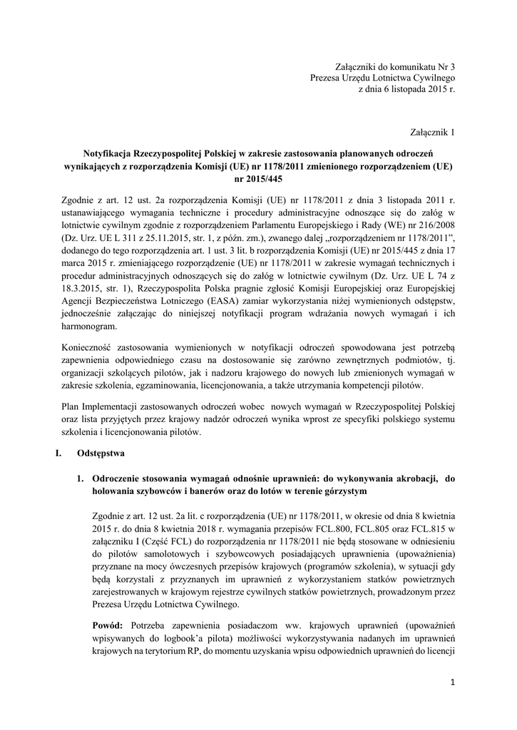 Załączniki do komunikatu Nr 3 Prezesa Urzędu Lotnictwa Cywilnego z dnia 6 listopada 2015 r. Załącznik 1 Notyfikacja Rzeczypospolitej Polskiej w zakresie zastosowania planowanych odroczeń wynikających z rozporządzenia Komisji (UE) nr 1178/2011 zmienionego rozporządzeniem (UE) nr 2015/445 Zgodnie z art. 12 ust. 2a rozporządzenia Komisji (UE) nr 1178/2011 z dnia 3 listopada 2011 r. ustanawiającego wymagania techniczne i procedury administracyjne odnoszące się do załóg w lotnictwie cywilnym zgodnie z rozporządzeniem Parlamentu Europejskiego i Rady (WE) nr 216/2008 (Dz. Urz. UE L 311 z 25.11.2015, str. 1, z późn. zm.), zwanego dalej „rozporządzeniem nr 1178/2011”, dodanego do tego rozporządzenia art. 1 ust. 3 lit. b rozporządzenia Komisji (UE) nr 2015/445 z dnia 17 marca 2015 r. zmieniającego rozporządzenie (UE) nr 1178/2011 w zakresie wymagań technicznych i procedur administracyjnych odnoszących się do załóg w lotnictwie cywilnym (Dz. Urz. UE L 74 z 18.3.2015, str. 1), Rzeczypospolita Polska pragnie zgłosić Komisji Europejskiej oraz Europejskiej Agencji Bezpieczeństwa Lotniczego (EASA) zamiar wykorzystania niżej wymienionych odstępstw, jednocześnie załączając do niniejszej notyfikacji program wdrażania nowych wymagań i ich harmonogram. Konieczność zastosowania wymienionych w notyfikacji odroczeń spowodowana jest potrzebą zapewnienia odpowiedniego czasu na dostosowanie się zarówno zewnętrznych podmiotów, tj. organizacji szkolących pilotów, jak i nadzoru krajowego do nowych lub zmienionych wymagań w zakresie szkolenia, egzaminowania, licencjonowania, a także utrzymania kompetencji pilotów. Plan Implementacji zastosowanych odroczeń wobec nowych wymagań w Rzeczypospolitej Polskiej oraz lista przyjętych przez krajowy nadzór odroczeń wynika wprost ze specyfiki polskiego systemu szkolenia i licencjonowania pilotów. I. Odstępstwa 1. Odroczenie stosowania wymagań odnośnie uprawnień: do wykonywania akrobacji, do holowania szybowców i banerów oraz do lotów w terenie górzystym Zgodnie z art. 12 ust. 2a lit. c rozporządzenia (UE) nr 1178/2011, w okresie od dnia 8 kwietnia 2015 r. do dnia 8 kwietnia 2018 r. wymagania przepisów FCL.800, FCL.805 oraz FCL.815 w załączniku I (Część FCL) do rozporządzenia nr 1178/2011 nie będą stosowane w odniesieniu do pilotów samolotowych i szybowcowych posiadających uprawnienia (upoważnienia) przyznane na mocy ówczesnych przepisów krajowych (programów szkolenia), w sytuacji gdy będą korzystali z przyznanych im uprawnień z wykorzystaniem statków powietrznych zarejestrowanych w krajowym rejestrze cywilnych statków powietrznych, prowadzonym przez Prezesa Urzędu Lotnictwa Cywilnego. Powód: Potrzeba zapewnienia posiadaczom ww. krajowych uprawnień (upoważnień wpisywanych do logbook’a pilota) możliwości wykorzystywania nadanych im uprawnień krajowych na terytorium RP, do momentu uzyskania wpisu odpowiednich uprawnień do licencji 1 Part-FCL, zgodnie z wymaganiami rozporządzenia (UE) 1178/2011, czyli najpóźniej do dnia 8 kwietnia 2018 r. 2. Odroczenie stosowania wymagań posiadania wpisu uprawnień instruktora lotów w terenie górzystym - MI Zgodnie z art. 12 ust. 2a lit. d rozporządzenia (UE) nr 1178/2011, w okresie od dnia 8 kwietnia 2015 r. do dnia 8 kwietnia 2018 r. wymagania załącznika I (Część FCL) podczęści J sekcja 10 do rozporządzenia (UE) nr 1178/2011 nie będą stosowane w odniesieniu do pilotówinstruktorów szkolących do lotów w terenie górzystym - MI. Powód: Potrzeba jednolitego zdefiniowania na poziomie wspólnotowym pojęcia „terenu górzystego” oraz „lotniska górskiego”, a także przygotowania środowiska lotniczego oraz krajowego nadzoru do ewentualnego szkolenia, egzaminowania oraz licencjonowania na uprawnienie MI na terytorium RP, wpisywanego do licencji Part-FCL zgodnie z wymaganiami rozporządzenia (UE) nr 1178/2011. II. Zgodnie z art. 12 ust. 7 rozporządzenia (UE) nr 1178/2011, Rzeczypospolita Polska niniejszym powiadamia Komisję Europejską i Europejską Agencję Bezpieczeństwa Lotniczego (EASA) o zastosowaniu powyższych odstępstw oraz przedkłada program wdrażania uwzględniający przewidywane działania przygotowany przez Prezesa Urzędu Lotnictwa Cywilnego, jako właściwy organ w Rzeczypospolitej Polskiej. III. W razie wszelkich niejasności, użyte w niniejszej notyfikacji terminy należy rozumieć zgodnie z definicjami zastosowanymi w rozporządzeniu (UE) nr 1178/2011. IV. Sporządzono w dwóch jednobrzmiących egzemplarzach, po jednym dla Pana João Aguiar Machado, Dyrektora Generalnego DG Mobilności i Transportu w Komisji Europejskiej oraz Pana Patricka Ky, Dyrektora Wykonawczego Europejskiej Agencji Bezpieczeństwa Lotniczego (EASA) – zgodnie z przepisem art. 12 ust. 7 rozporządzenia Komisji (UE) nr 1178/2011. 2 Załącznik 2 PROGRAM WDRAŻANIA ROZPORZĄDZENIA KOMISJI (UE) NR 1178/2011 ZMIENIONEGO ROZPORZĄDZENIEM (UE) NR 2015/445 I. Uprawnienia zgodnie z przepisami FCL.800 oraz FCL.805 załącznika I (Część FCL) do rozporządzenia Komisji (UE) nr 1178/2011 Do dnia 8 kwietnia 2018 r. na terytorium Rzeczypospolitej Polskiej możliwe będzie wykorzystywanie krajowych uprawnień uzyskanych (upoważnień wpisywanych do logbook’a pilota samolotowego lub szybowcowego na podstawie szkoleń odbytych zgodnie z ówczesnymi programami szkolenia) w ramach takich czynności lotniczych jak akrobacja czy holowanie szybowców i banerów. W zakresie zastosowania odstępstwa do przepisu FCL.800 w załączniku I (Część FCL) do rozporządzenia, Komisji (UE) nr 1178/2011 z dnia 3 listopada 2011 r. ustanawiającego wymagania techniczne i procedury administracyjne odnoszące się do załóg w lotnictwie cywilnym zgodnie z rozporządzeniem Parlamentu Europejskiego i Rady (WE) nr 216/2008 (Dz. Urz. UE L 311 z 25.11.2015, str. 1, z późn. zm.) powyższe należy rozumieć jako możliwość dalszego korzystania z wpisu „akrobacja 