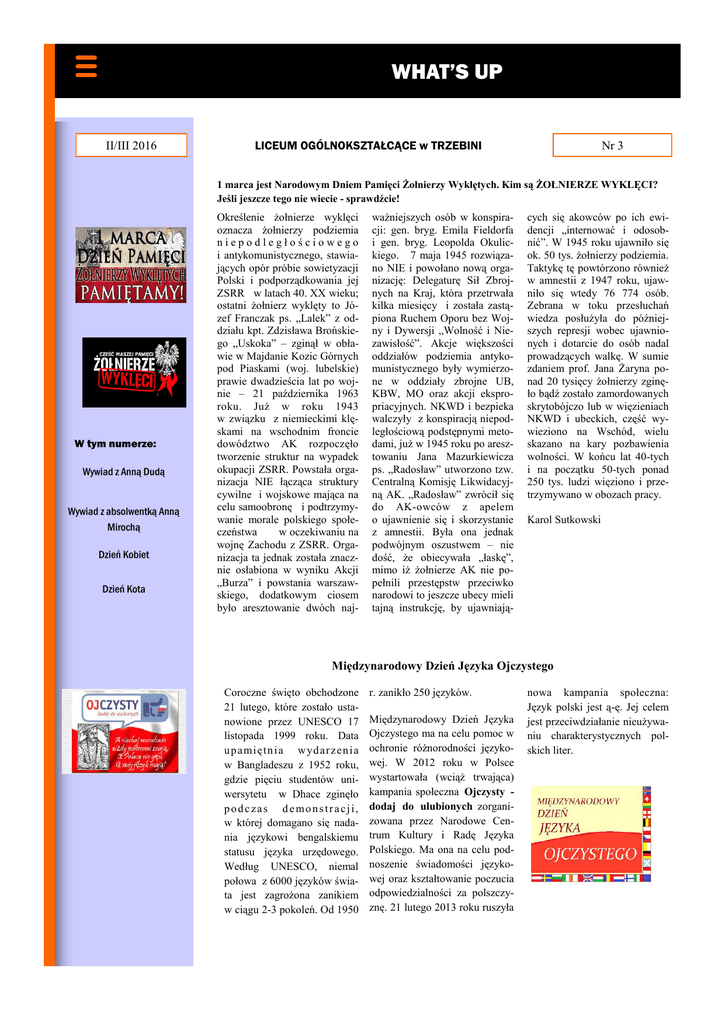 WHAT’S UP II/III 2016 LICEUM OGÓLNOKSZTAŁCĄCE w TRZEBINI Nr 3 1 marca jest Narodowym Dniem Pamięci Żołnierzy Wyklętych. Kim są ŻOŁNIERZE WYKLĘCI? Jeśli jeszcze tego nie wiecie - sprawdźcie! W tym numerze: Wywiad z Anną Dudą Wywiad z absolwentką Anną Mirochą Dzień Kobiet Dzień Kota Określenie żołnierze wyklęci oznacza żołnierzy podziemia niepodległościowego i antykomunistycznego, stawiających opór próbie sowietyzacji Polski i podporządkowania jej ZSRR w latach 40. XX wieku; ostatni żołnierz wyklęty to Józef Franczak ps. „Lalek” z oddziału kpt. Zdzisława Brońskiego „Uskoka” – zginął w obławie w Majdanie Kozic Górnych pod Piaskami (woj. lubelskie) prawie dwadzieścia lat po wojnie – 21 października 1963 roku. Już w roku 1943 w związku z niemieckimi klęskami na wschodnim froncie dowództwo AK rozpoczęło tworzenie struktur na wypadek okupacji ZSRR. Powstała organizacja NIE łącząca struktury cywilne i wojskowe mająca na celu samoobronę i podtrzymywanie morale polskiego społeczeństwa w oczekiwaniu na wojnę Zachodu z ZSRR. Organizacja ta jednak została znacznie osłabiona w wyniku Akcji „Burza” i powstania warszawskiego, dodatkowym ciosem było aresztowanie dwóch naj- ważniejszych osób w konspiracji: gen. bryg. Emila Fieldorfa i gen. bryg. Leopolda Okulickiego. 7 maja 1945 rozwiązano NIE i powołano nową organizację: Delegaturę Sił Zbrojnych na Kraj, która przetrwała kilka miesięcy i została zastąpiona Ruchem Oporu bez Wojny i Dywersji „Wolność i Niezawisłość”. Akcje większości oddziałów podziemia antykomunistycznego były wymierzone w oddziały zbrojne UB, KBW, MO oraz akcji ekspropriacyjnych. NKWD i bezpieka walczyły z konspiracją niepodległościową podstępnymi metodami, już w 1945 roku po aresztowaniu Jana Mazurkiewicza ps. „Radosław” utworzono tzw. Centralną Komisję Likwidacyjną AK. „Radosław” zwrócił się do AK-owców z apelem o ujawnienie się i skorzystanie z amnestii. Była ona jednak podwójnym oszustwem – nie dość, że obiecywała „łaskę”, mimo iż żołnierze AK nie popełnili przestępstw przeciwko narodowi to jeszcze ubecy mieli tajną instrukcję, by ujawniają- cych się akowców po ich ewidencji „internować i odosobnić”. W 1945 roku ujawniło się ok. 50 tys. żołnierzy podziemia. Taktykę tę powtórzono również w amnestii z 1947 roku, ujawniło się wtedy 76 774 osób. Zebrana w toku przesłuchań wiedza posłużyła do późniejszych represji wobec ujawnionych i dotarcie do osób nadal prowadzących walkę. W sumie zdaniem prof. Jana Żaryna ponad 20 tysięcy żołnierzy zginęło bądź zostało zamordowanych skrytobójczo lub w więzieniach NKWD i ubeckich, część wywieziono na Wschód, wielu skazano na kary pozbawienia wolności. W końcu lat 40-tych i na początku 50-tych ponad 250 tys. ludzi więziono i przetrzymywano w obozach pracy. Karol Sutkowski Międzynarodowy Dzień Języka Ojczystego Coroczne święto obchodzone 21 lutego, które zostało ustanowione przez UNESCO 17 listopada 1999 roku. Data u p a mi ę t n i a w yd a r z e n i a w Bangladeszu z 1952 roku, gdzie pięciu studentów uniwersytetu w Dhace zginęło podczas demonstracji, w której domagano się nadania językowi bengalskiemu statusu języka urzędowego. Według UNESCO, niemal połowa z 6000 języków świata jest zagrożona zanikiem w ciągu 2-3 pokoleń. Od 1950 r. zanikło 250 języków. Międzynarodowy Dzień Języka Ojczystego ma na celu pomoc w ochronie różnorodności językowej. W 2012 roku w Polsce wystartowała (wciąż trwająca) kampania społeczna Ojczysty dodaj do ulubionych zorganizowana przez Narodowe Centrum Kultury i Radę Języka Polskiego. Ma ona na celu podnoszenie świadomości językowej oraz kształtowanie poczucia odpowiedzialności za polszczyznę. 21 lutego 2013 roku ruszyła nowa kampania społeczna: Język polski jest ą-ę. Jej celem jest przeciwdziałanie nieużywaniu charakterystycznych polskich liter. Str. 2 WHAT’S UP Wywiad z Anną Dudą, nauczycielką ratownictwa medycznego w naszym liceum. Rozmawiała Marcelina Ściebur "Jednym z rodzajów szczęśliwości jest zdolność podejmowania dobrych decyzji." - Platon Dlaczego została Pani pielęgniarką? AD: Miałam wtedy 17 lat, moja siostra była w ciąży, zagrażającej jej życiu. Miałam do niej jechać jak zwykle na weekend, ale coś mnie tchnęło i stwierdziłam, że pojadę dzień wcześniej. To były dobre przeczucia, ponieważ tego dnia moja siostra dostała krwotoku, chciałam jej pomóc i zadzwoniłam po pogotowie. Później stwierdziłam, że nie tylko chce pomagać rodzinie, ale wszystkim ludziom. Co musiała Pani zrobić, żeby móc uczyć w szkole ? AD: Ukończyłam studia na Uniwersytecie Jagiellońskim, podczas których nabyłam uprawnień pedagogicznych potrzebnych do pracy jako nauczyciel. Oprócz tego ukończyłam kurs dla nauczycieli uprawniający do nauczania pierwszej pomocy w placówkach oświaty. Dlaczego zdecydowała się Pani uczyć w szkole ? AD: Bardzo lubię uczyć, przekazywać wiedzę. Uważam, że każda młoda osoba powinna umieć udzielić pierwszej pomocy i zachować się w stanie nagłego zagrożenia życia. Co najbardziej lubi Pani w pracy pielęgniarki ? AD: Najbardziej lubię pracować z dziećmi. Wspomagać rodzinę w pierwszych miesiącach życia dziecka, lubię kontakt z ludźmi; jest to bardzo ważne w moim zawodzie. Lubię nabywać nowych umiejętności, które przydają się w pracy zawodowej. Czy ciężka jest praca pielęgniarki ? AD: Bardzo! z różnych względów. Po pierwsze odpowiedzialność zawodowa za wykonywane czynności. Ciągłe doszkalanie się. Praca w systemie dyżurowym. Praca w ciągłym stresie ze względu na walkę o zdrowie i życie ludzkie. Jaką skończyła Pani szkołę ? AD: Po ukończeniu liceum rozpoczęłam edukację na kierunku pielęgniarstwo na Akademii Techniczno Humanistycznej w BielskoBiałej, uz