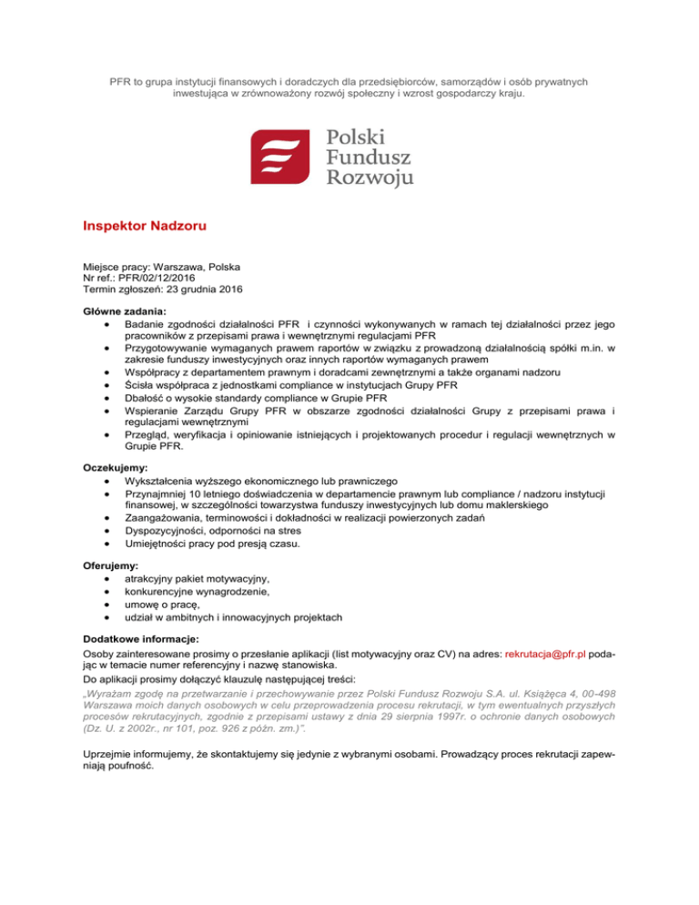 PFR to grupa instytucji finansowych i doradczych dla przedsiębiorców, samorządów i osób prywatnych inwestująca w zrównoważony rozwój społeczny i wzrost gospodarczy kraju. Inspektor Nadzoru Miejsce pracy: Warszawa, Polska Nr ref.: PFR/02/12/2016 Termin zgłoszeń: 23 grudnia 2016 Główne zadania: Badanie zgodności działalności PFR i czynności wykonywanych w ramach tej działalności przez jego pracowników z przepisami prawa i wewnętrznymi regulacjami PFR Przygotowywanie wymaganych prawem raportów w związku z prowadzoną działalnością spółki m.in. w zakresie funduszy inwestycyjnych oraz innych raportów wymaganych prawem Współpracy z departamentem prawnym i doradcami zewnętrznymi a także organami nadzoru Ścisła współpraca z jednostkami compliance w instytucjach Grupy PFR Dbałość o wysokie standardy compliance w Grupie PFR Wspieranie Zarządu Grupy PFR w obszarze zgodności działalności Grupy z przepisami prawa i regulacjami wewnętrznymi Przegląd, weryfikacja i opiniowanie istniejących i projektowanych procedur i regulacji wewnętrznych w Grupie PFR. Oczekujemy: Wykształcenia wyższego ekonomicznego lub prawniczego Przynajmniej 10 letniego doświadczenia w departamencie prawnym lub compliance / nadzoru instytucji finansowej, w szczególności towarzystwa funduszy inwestycyjnych lub domu maklerskiego Zaangażowania, terminowości i dokładności w realizacji powierzonych zadań Dyspozycyjności, odporności na stres Umiejętności pracy pod presją czasu. Oferujemy: atrakcyjny pakiet motywacyjny, konkurencyjne wynagrodzenie, umowę o pracę, udział w ambitnych i innowacyjnych projektach Dodatkowe informacje: Osoby zainteresowane prosimy o przesłanie aplikacji (list motywacyjny oraz CV) na adres: [email protected] podając w temacie numer referencyjny i nazwę stanowiska. Do aplikacji prosimy dołączyć klauzulę następującej treści: „Wyrażam zgodę na przetwarzanie i przechowywanie przez Polski Fundusz Rozwoju S.A. ul. Książęca 4, 00-498 Warszawa moich danych osobowych w celu przeprowadzenia procesu rekrutacji, w tym ewentualnych przyszłych procesów rekrutacyjnych, zgodnie z przepisami ustawy z dnia 29 sierpnia 1997r. o ochronie danych osobowych (Dz. U. z 2002r., nr 101, poz. 926 z późn. zm.)”. Uprzejmie informujemy, że skontaktujemy się jedynie z wybranymi osobami. Prowadzący proces rekrutacji zapewniają poufność.