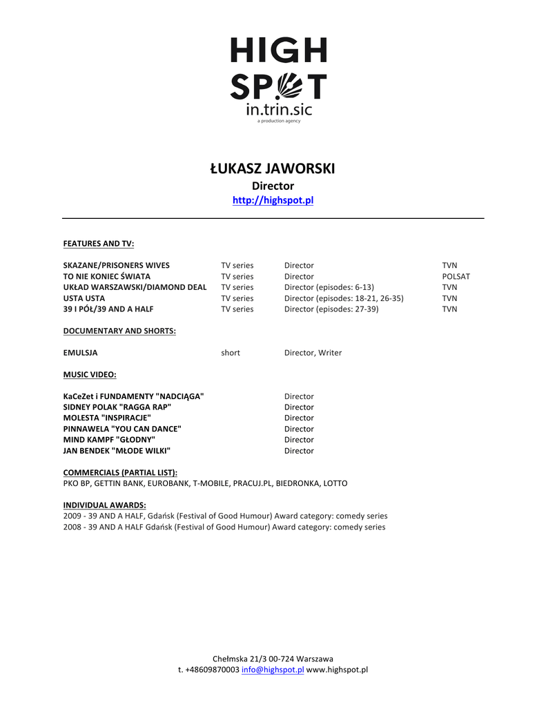 ŁUKASZ JAWORSKI Director http://highspot.pl FEATURES AND TV: SKAZANE/PRISONERS WIVES TV series Director TO NIE KONIEC ŚWIATA TV series Director UKŁAD WARSZAWSKI/DIAMOND DEAL TV series Director (episodes: 6-‐13) USTA USTA TV series Director (episodes: 18-‐21, 26-‐35) 39 I PÓŁ/39 AND A HALF TV series Director (episodes: 27-‐39) DOCUMENTARY AND SHORTS: EMULSJA short Director, Writer MUSIC VIDEO: KaCeZet i FUNDAMENTY "NADCIĄGA" Director SIDNEY POLAK "RAGGA RAP" Director MOLESTA "INSPIRACJE" Director PINNAWELA "YOU CAN DANCE" Director MIND KAMPF "GŁODNY" Director JAN BENDEK "MŁODE WILKI" Director COMMERCIALS (PARTIAL LIST): PKO BP, GETTIN BANK, EUROBANK, T-‐MOBILE, PRACUJ.PL, BIEDRONKA, LOTTO INDIVIDUAL AWARDS: 2009 -‐ 39 AND A HALF, Gdańsk (Festival of Good Humour) Award category: comedy series 2008 -‐ 39 AND A HALF Gdańsk (Festival of Good Humour) Award category: comedy series Chełmska 21/3 00-‐724 Warszawa t. +48609870003 [email protected] www.highspot.pl TVN POLSAT TVN TVN TVN