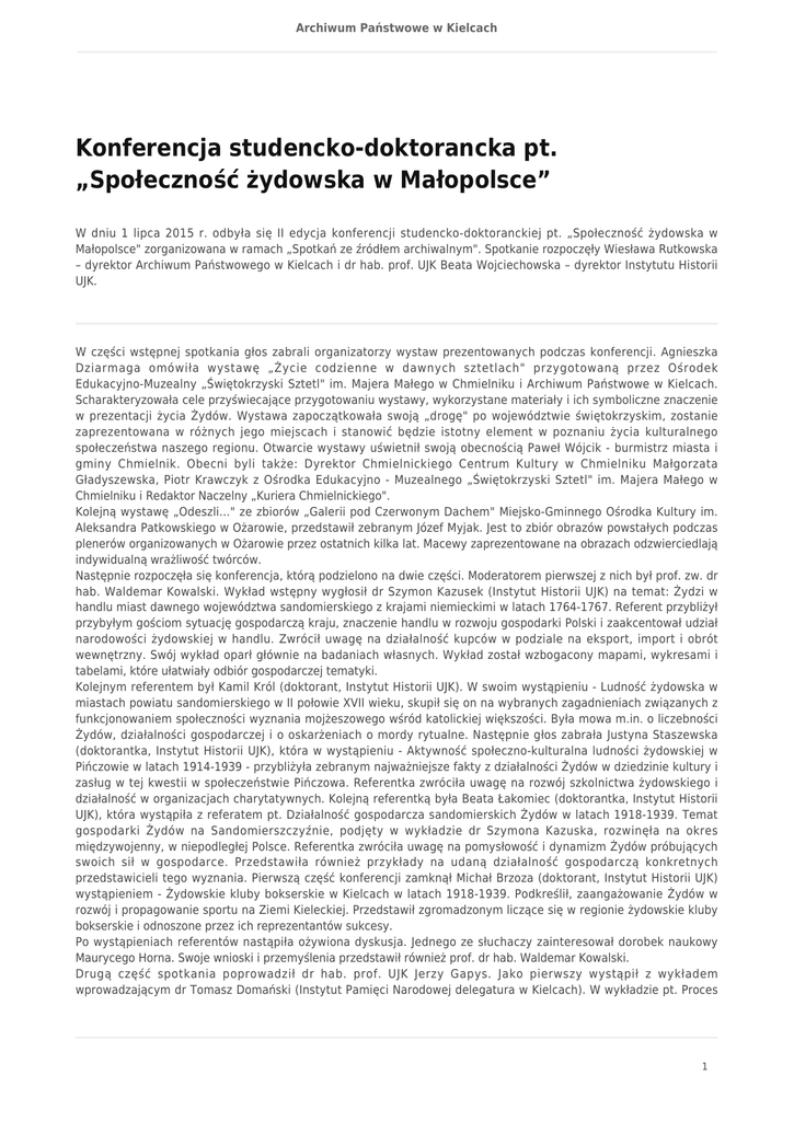 Archiwum Państwowe w Kielcach Konferencja studencko-doktorancka pt. „Społeczność żydowska w Małopolsce” W dniu 1 lipca 2015 r. odbyła się II edycja konferencji studencko-doktoranckiej pt. „Społeczność żydowska w Małopolsce" zorganizowana w ramach „Spotkań ze źródłem archiwalnym". Spotkanie rozpoczęły Wiesława Rutkowska – dyrektor Archiwum Państwowego w Kielcach i dr hab. prof. UJK Beata Wojciechowska – dyrektor Instytutu Historii UJK. W części wstępnej spotkania głos zabrali organizatorzy wystaw prezentowanych podczas konferencji. Agnieszka Dziarmaga omówiła wystawę „Życie codzienne w dawnych sztetlach" przygotowaną przez Ośrodek Edukacyjno-Muzealny „Świętokrzyski Sztetl" im. Majera Małego w Chmielniku i Archiwum Państwowe w Kielcach. Scharakteryzowała cele przyświecające przygotowaniu wystawy, wykorzystane materiały i ich symboliczne znaczenie w prezentacji życia Żydów. Wystawa zapoczątkowała swoją „drogę" po województwie świętokrzyskim, zostanie zaprezentowana w różnych jego miejscach i stanowić będzie istotny element w poznaniu życia kulturalnego społeczeństwa naszego regionu. Otwarcie wystawy uświetnił swoją obecnością Paweł Wójcik - burmistrz miasta i gminy Chmielnik. Obecni byli także: Dyrektor Chmielnickiego Centrum Kultury w Chmielniku Małgorzata Gładyszewska, Piotr Krawczyk z Ośrodka Edukacyjno - Muzealnego „Świętokrzyski Sztetl" im. Majera Małego w Chmielniku i Redaktor Naczelny „Kuriera Chmielnickiego". Kolejną wystawę „Odeszli..." ze zbiorów „Galerii pod Czerwonym Dachem" Miejsko-Gminnego Ośrodka Kultury im. Aleksandra Patkowskiego w Ożarowie, przedstawił zebranym Józef Myjak. Jest to zbiór obrazów powstałych podczas plenerów organizowanych w Ożarowie przez ostatnich kilka lat. Macewy zaprezentowane na obrazach odzwierciedlają indywidualną wrażliwość twórców. Następnie rozpoczęła się konferencja, którą podzielono na dwie części. Moderatorem pierwszej z nich był prof. zw. dr hab. Waldemar Kowalski. Wykład wstępny wygłosił dr Szymon Kazusek (Instytut Historii UJK) na temat: Żydzi w handlu miast dawnego województwa sandomierskiego z krajami niemieckimi w latach 1764-1767. Referent przybliżył przybyłym gościom sytuację gospodarczą kraju, znaczenie handlu w rozwoju gospodarki Polski i zaakcentował udział narodowości żydowskiej w handlu. Zwrócił uwagę na działalność kupców w podziale na eksport, import i obrót wewnętrzny. Swój wykład oparł głównie na badaniach własnych. Wykład został wzbogacony mapami, wykresami i tabelami, które ułatwiały odbiór gospodarczej tematyki. Kolejnym referentem był Kamil Król (doktorant, Instytut Historii UJK). W swoim wystąpieniu - Ludność żydowska w miastach powiatu sandomierskiego w II połowie XVII wieku, skupił się on na wybranych zagadnieniach związanych z funkcjonowaniem społeczności wyznania mojżeszowego wśród katolickiej większości. Była mowa m.in. o liczebności Żydów, działalności gospodarczej i o oskarżeniach o mordy rytualne. Następnie głos zabrała Justyna Staszewska (doktorantka, Instytut Historii UJK), która w wystąpieniu - Aktywność społeczno-kulturalna ludności żydowskiej w Pińczowie w latach 1914-1939 - przybliżyła zebranym najważniejsze fakty z działalności Żydów w dziedzinie kultury i zasług w tej kwestii w społeczeństwie Pińczowa. Referentka zwróciła uwagę na rozwój szkolnictwa żydowskiego i działalność w organizacjach charytatywnych. Kolejną referentką była Beata Łakomiec (doktorantka, Instytut Historii UJK), która wystąpiła z referatem pt. Działalność gospodarcza sandomierskich Żydów w latach 1918-1939. Temat gospodarki Żydów na Sandomierszczyźnie, podjęty w wykładzie dr Szymona Kazuska, rozwinęła na okres międzywojenny, w niepodległej Polsce. Referentka zwróciła uwagę na pomysłowość i dynamizm Żydów próbujących swoich sił w gospodarce. Przedstawiła również przykłady na udaną działalność gospodarczą konkretnych przedstawicieli tego wyznania. Pierwszą część konferencji zamknął Michał Brzoza (doktorant, Instytut Historii UJK) wystąpieniem - Żydowskie kluby bokserskie w Kielcach w latach 1918-1939. Podkreślił, zaangażowanie Żydów w rozwój i propagowanie sportu na Ziemi Kieleckiej. Przedstawił zgromadzonym liczące się w regionie żydowskie kluby bokserskie i odnoszone przez ich reprezentantów sukcesy. Po wystąpieniach referentów nastąpiła ożywiona dyskusja. Jednego ze słuchaczy zainteresował dorobek naukowy Maurycego Horna. Swoje wnioski i przemyślenia przedstawił również prof. dr hab. Waldemar Kowalski. Drugą część spotkania poprowadził dr hab. prof. UJK Jerzy Gapys. Jako pierwszy wystąpił z wykładem wprowadzającym dr Tomasz Domański (Instytut Pamięci Narodowej delegatura w Kielcach). W wykładzie pt. Proces 1 Archiwum Państwowe w Kielcach Mariana Sołtysiaka „Barabasza" jako źródło do badań nad wiarygodnością materiałów śledczych i operacyjnych UB/SB - przedstawił on wyniki badań własnych na wspomniany temat, przeprowadzonych na podstawie tzw. sierpniówek oraz akt wytworzonych przez organy represji RP/PRL. Na ich właśnie podstawie stwierdził, iż każdy przypadek, w tym i „Barabasza" wymaga oddzielnego, rzetelnego śledztwa, analizy akt spraw i faktów, gdyż tylko taką drogą można dotrzeć w efekcie końcowym do sprawiedliwych ocen i podsumowań. Referent stwierdził, że procesy miały wspólny schemat. Jako następna zabrała głos Beata Żelazny (doktorantka, Instytut Historii UJK). Podjęła ona temat - Problematyka żydowska na łamach prasy radzieckiej w okresie II wojny światowej. Z jej wystąpienia zebrani dowiedzieli się o znikomych informacjach na łamach prasy radzieckiej w tym okresie. Temat ten był jakby ukryty i mało widoczny w ówczesnych mediach. Katarzyna Zgryza (doktorantka, Instytut Historii UJK) 