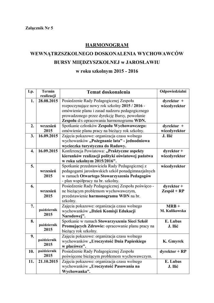 Załącznik Nr 5 HARMONOGRAM WEWNĄTRZSZKOLNEGO DOSKONALENIA WYCHOWAWCÓW BURSY MIĘDZYSZKOLNEJ w JAROSŁAWIU w roku szkolnym 2015 - 2016 Lp. 1. 2. 3. 4. 5. 6. 7. 8. 9. 10. 11. Termin realizacji Temat doskonalenia 28.08.2015 Posiedzenie Rady Pedagogicznej Zespołu rozpoczynające nowy rok szkolny 2015 / 2016 omówienie planu i zasad nadzoru pedagogicznego prowadzonego przez dyrekcję Bursy, powołanie Zespołu d/s opracowania harmonogramu WDN. wrzesień Spotkanie członków Zespołu Wychowawczego: omówienie planu pracy na bieżący rok szkolny. 2015 16.09.2015 Zajęcia pokazowe: organizacja czasu wolnego wychowanków „Pożegnanie lata” - jednodniowa wycieczka turystyczna do Radawy. 16.09.2015 Konferencja Powiatowa: „Praktyczne aspekty kierunków realizacji polityki oświatowej państwa w roku szkolnym 2015/2016". Spotkanie przedstawiciela Rady Pedagogicznej z wrzesień pedagogami jarosławskich szkół ponadgimnazjalnych w ramach Otwartego Stowarzyszenia Pedagogów 2015 - plan współpracy na br. szkolny. Posiedzenie Rady Pedagogicznej Zespołu poświęco wrzesień ne bieżącym problemom wychowawczym, przedstawienie harmonogramu WDN na br. 2015 szkolny. Zajęcia pokazowe: organizacja czasu wolnego październik wychowanków „Dzień Komisji Edukacji 2015 Narodowej”. Spotkanie w ramach Stowarzyszenia Sieci Szkół październik Promujących Zdrowie: opracowanie planu pracy na 2015 bieżący rok szkolny. Zajęcia pokazowe: organizacja czasu wolnego październik wychowanków „Uroczystość Dnia Papieskiego 2015 w placówce”. październik Posiedzenie Rady Pedagogicznej Zespołu 2015 poświęcone bieżącym problemom wychowawczym. 21.10.2015 Zajęcia pokazowe: organizacja czasu wolnego wychowanków „Uroczystość Pasowania na Wychowanka”. Odpowiedzialni dyrektor + wicedyrektor dyrektor + wicedyrektor J. Ilić dyrektor + wicedyrektor wicedyrektor dyrektor + Zespół + RP MRB + M. Kulikowska E. Lubas J. Ilić K. Gmyrek dyrektor + RP E. Lubas J. Ilić 12. 13. 14. 15. 16. 17. 18. 19. 20. 21. 22. Zajęcia pokazowe: organizacja czasu wolnego wieczornica patriotyczna „Święto Odzyskania Niepodległości”. 18.11.2015 Zajęcia pokazowe: organizacja czasu wolnego „X Turniej Tenisa Stołowego Placówek Opiekuńczo - Wychowawczych z terenu województwa podkarpackiego”. Zajęcia pokazowe: organizacja czasu wolnego listopad wychowanków „XIII Powiatowy Konkurs Wiedzy 2015 o Zdrowiu”. Szkoleniowe Posiedzenie Rady Pedagogicznej: listopad „Odpowiedzialność prawna nauczyciela”. Podkarpackie Centrum Edukacji Nauczycieli 2015 w Rzeszowie. grudzień Posiedzenie Rady Pedagogicznej Zespołu poświęcone bieżącym problemom wychowawczym. 2015 grudzień Zajęcia pokazowe: z zakresu zadań Programu Profilaktycznego „Dopalacze” 2015 17.12.2015 Zajęcia pokazowe: organizacja czasu wolnego wychowanków „Wieczór Wigilijny - Opłatek” styczeń Szkoleniowe Posiedzenie Rady Pedagogicznej: 2016 „Internet, alkohol, papierosy, narkotyki, dopalacze jako zagrożenie dzieci i młodzieży”. Podkarpackie Centrum Edukacji Nauczycieli w Rzeszowie. luty 2016 Posiedzenie Rady Pedagogicznej Zespołu poświęcone bieżącym problemom wychowawczym, oraz podsumowanie wyników dydaktycznych i wychowawczych za I semestr br. szkolnego. luty 2016 Zajęcia pokazowe: z zakresu profilaktyki uzależnień. listopad 2015 marzec 2016 marzec 2016 kwiecień 2016 X Powiatowe Targi Edukacyjne - Dzień Otwarty Placówki. Zajęcia pokazowe: z zakresu zadań Programu Profilaktycznego „Zdrowe odżywianie” Zajęcia pokazowe: powiatowe dyktando „IX Jarosławskie Potyczki Ortograficzne”. 27. kwiecień 2016 kwiecień 2016 maj 2016 28. maj 2016 Posiedzenie Rady Pedagogicznej Zespołu poświęcone bieżącym problemom wychowawczym. Zajęcia pokazowe: „ Organizacja czasu wolnego Pożegnanie Maturzystów”. Spotkanie Rady Pedagogicznej Bursy z policjantem ds. młodzieży, dzielnicowym rejonu z Komendy Powiatowej Policji oraz przedstawicielem Straży Miejskiej. Szkoleniowe Posiedzenie Rady Pedagogicznej: „Cyberprzemoc nastolatków - fakty i mity”. Podkarpackie Centrum Edukacji Nauczycieli w Rzeszowie. 23. 24. 25. 26. B. Cholewiński dyrektor E. Chłopek K. Gmyrek K. Panek M. Kulikowska dyrektor + Zespół ds. WDN dyrektor + RP D. Gil D. Gil A. Wielgos dyrektor + Zespół ds. WDN dyrektor + RP B. Burlikowska dyrektor + wychowawcy E. Żurawska Dyrektor + M. Kulikowska J. Ilić, K. Panek dyrektor + RP B. Burlikowska B. Wyczawska dyrektor + wicedyrektor dyrektor + Zespół ds. WDN 29. maj 2016 Posiedzenie Rady Pedagogicznej Zespołu poświęcone bieżącym problemom wychowawczym. dyrektor + RP 30. czerwiec 2016 dyrektor + Zespół ds. WDN 31. czerwiec 2016 Szkoleniowe Posiedzenie Rady Pedagogicznej: „Mówię do ciebie człowieku, a ty nie rozumiesz. Podstawy komunikacji interpersonalnej”. Podkarpackie Centrum Edukacji Nauczycieli w Rzeszowie. Kwestionariusz pytań ( ankieta ) dla wychowawców na temat WDN-u i sprawowanego nadzoru pedagogi- cznego w placówce. 32. czerwiec 2016 Samokształceniowe Posiedzenie Rady Pedagogicznej Bursy – analiza i diagnoza; szczegółowe omówienie opracowanych wyników i wniosków z poszczegól nych badań (ankiet) wycinków pracy placówki w roku szkolnym 2015 / 2016. Jarosław, 14.09.2015r. wicedyrektor dyrekcja + Zespół ds. Ewaluacji Wewnetrznej