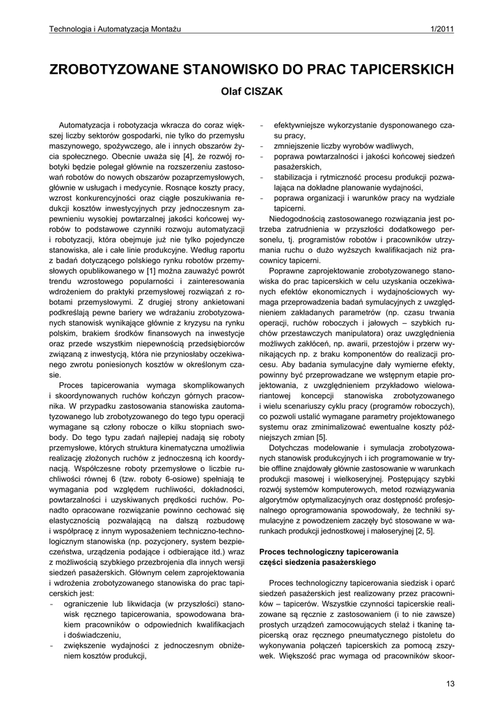 Technologia i Automatyzacja Montażu 1/2011 ZROBOTYZOWANE STANOWISKO DO PRAC TAPICERSKICH Olaf CISZAK Automatyzacja i robotyzacja wkracza do coraz większej liczby sektorów gospodarki, nie tylko do przemysłu maszynowego, spożywczego, ale i innych obszarów życia społecznego. Obecnie uważa się [4], że rozwój robotyki będzie polegał głównie na rozszerzeniu zastosowań robotów do nowych obszarów pozaprzemysłowych, głównie w usługach i medycynie. Rosnące koszty pracy, wzrost konkurencyjności oraz ciągłe poszukiwania redukcji kosztów inwestycyjnych przy jednoczesnym zapewnieniu wysokiej powtarzalnej jakości końcowej wyrobów to podstawowe czynniki rozwoju automatyzacji i robotyzacji, która obejmuje już nie tylko pojedyncze stanowiska, ale i całe linie produkcyjne. Według raportu z badań dotyczącego polskiego rynku robotów przemysłowych opublikowanego w [1] można zauważyć powrót trendu wzrostowego popularności i zainteresowania wdrożeniem do praktyki przemysłowej rozwiązań z robotami przemysłowymi. Z drugiej strony ankietowani podkreślają pewne bariery we wdrażaniu zrobotyzowanych stanowisk wynikające głównie z kryzysu na rynku polskim, brakiem środków finansowych na inwestycje oraz przede wszystkim niepewnością przedsiębiorców związaną z inwestycją, która nie przyniosłaby oczekiwanego zwrotu poniesionych kosztów w określonym czasie. Proces tapicerowania wymaga skomplikowanych i skoordynowanych ruchów kończyn górnych pracownika. W przypadku zastosowania stanowiska zautomatyzowanego lub zrobotyzowanego do tego typu operacji wymagane są człony robocze o kilku stopniach swobody. Do tego typu zadań najlepiej nadają się roboty przemysłowe, których struktura kinematyczna umożliwia realizację złożonych ruchów z jednoczesną ich koordynacją. Współczesne roboty przemysłowe o liczbie ruchliwości równej 6 (tzw. roboty 6-osiowe) spełniają te wymagania pod względem ruchliwości, dokładności, powtarzalności i uzyskiwanych prędkości ruchów. Ponadto opracowane rozwiązanie powinno cechować się elastycznością pozwalającą na dalszą rozbudowę i współpracę z innym wyposażeniem techniczno-technologicznym stanowiska (np. pozycjonery, system bezpieczeństwa, urządzenia podające i odbierające itd.) wraz z możliwością szybkiego przezbrojenia dla innych wersji siedzeń pasażerskich. Głównym celem zaprojektowania i wdrożenia zrobotyzowanego stanowiska do prac tapicerskich jest: - ograniczenie lub likwidacja (w przyszłości) stanowisk ręcznego tapicerowania, spowodowana brakiem pracowników o odpowiednich kwalifikacjach i doświadczeniu, - zwiększenie wydajności z jednoczesnym obniżeniem kosztów produkcji, efektywniejsze wykorzystanie dysponowanego czasu pracy, - zmniejszenie liczby wyrobów wadliwych, - poprawa powtarzalności i jakości końcowej siedzeń pasażerskich, - stabilizacja i rytmiczność procesu produkcji pozwalająca na dokładne planowanie wydajności, - poprawa organizacji i warunków pracy na wydziale tapicerni. Niedogodnością zastosowanego rozwiązania jest potrzeba zatrudnienia w przyszłości dodatkowego personelu, tj. programistów robotów i pracowników utrzymania ruchu o dużo wyższych kwalifikacjach niż pracownicy tapicerni. Poprawne zaprojektowanie zrobotyzowanego stanowiska do prac tapicerskich w celu uzyskania oczekiwanych efektów ekonomicznych i wydajnościowych wymaga przeprowadzenia badań symulacyjnych z uwzględnieniem zakładanych parametrów (np. czasu trwania operacji, ruchów roboczych i jałowych – szybkich ruchów przestawczych manipulatora) oraz uwzględnienia możliwych zakłóceń, np. awarii, przestojów i przerw wynikających np. z braku komponentów do realizacji procesu. Aby badania symulacyjne dały wymierne efekty, powinny być przeprowadzane we wstępnym etapie projektowania, z uwzględnieniem przykładowo wielowariantowej koncepcji stanowiska zrobotyzowanego i wielu scenariuszy cyklu pracy (programów roboczych), co pozwoli ustalić wymagane parametry projektowanego systemu oraz zminimalizować ewentualne koszty późniejszych zmian [5]. Dotychczas modelowanie i symulacja zrobotyzowanych stanowisk produkcyjnych i ich programowanie w trybie offline znajdowały głównie zastosowanie w warunkach produkcji masowej i wielkoseryjnej. Postępujący szybki rozwój systemów komputerowych, metod rozwiązywania algorytmów optymalizacyjnych oraz dostępność profesjonalnego oprogramowania spowodowały, że techniki symulacyjne z powodzeniem zaczęły być stosowane w warunkach produkcji jednostkowej i małoseryjnej [2, 5]. - Proces technologiczny tapicerowania części siedzenia pasażerskiego Proces technologiczny tapicerowania siedzisk i oparć siedzeń pasażerskich jest realizowany przez pracowników – tapicerów. Wszystkie czynności tapicerskie realizowane są ręcznie z zastosowaniem (i to nie zawsze) prostych urządzeń zamocowujących stelaż i tkaninę tapicerską oraz ręcznego pneumatycznego pistoletu do wykonywania połączeń tapicerskich za pomocą zszywek. Większość prac wymaga od pracowników skoor13 1/2011 Technologia i Automatyzacja Montażu dynowanych umiejętności manualnych głównie przy nakładaniu tkaniny na stelaż siedziska lub oparcia z jednoczesnym zapewnieniem odpowiedniego jej rozłożenia i naciągu oraz wykonania połączenia tapicerskiego. Pracownicy szczególną uwagę muszą zwracać na prawidłowe ułożenie pokrycia tapicerskiego bez jakichkolwiek pofałdowań z równomiernym rozprowadzeniem materiału oraz dokładnym i pewnym wykonaniem połączeń tapicerskich, co ma bezpośrednie odzwierciedlenie w trwałości użytkowej siedzeń w trakcie ich eksploatacji w środkach transportu miejskiego. Praca wykonywana jest w zamkniętej hali produkcyjnej – tapicerni, 5 dni w tygodniu przez 2 – 3 zmiany w zależności od liczby zamówień. Modelowanie i symulacja zrobotyzowanego stanowiska do prac tapicerskich Mod