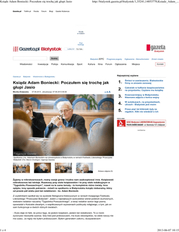 Ksiądz Adam Boniecki: Poczułem się trochę jak głupi Jasio 1z4 Gazeta.pl Tokfm.pl Poczta Forum Blogi http://bialystok.gazeta.pl/bialystok/1,35241,14053770,Ksiadz_Adam_... Gazeta Wyborcza Kup licencję Lubię to! 5,1 tys. Szukaj Wiadomości Gazeta.pl Białystok Inwestycje Policja Białystok 23ºC Komunikacja Sport Kultura Kina Prognoza pogody Forum 07.06.2013 , aktualizacja: 07.06.2013 09:38 Ogłoszenia Miejsca Zmień miasto Kontakt Najczęściej czytane Wiadomości z Białegostoku Ksiądz Adam Boniecki: Poczułem się trochę jak głupi Jasio Monika Żmijewska Ogłoszenia - Nieruchomości AAA 1. Śmieci w zawieszeniu. Białostockie firmy w zmowie cenowej 2. Człowiek w kaftanie bezpieczeństwa na przystanku. Czytano mu książkę 3. Krasnoarmiejcy w Białymstoku. Nieznane zdjęcia z końca wojny 4. W autobusach, na przystankach, ulicach - Białystok jest moim miastem Przez pięć lat bliźniaki żyły za regałem. Nikt nie wiedział o ich istnieniu 5. REKLAMA r e k la m a Spotkanie z ks. Adamem Bonieckim na Uniwersytecie w Białymstoku w ramach Festiwalu Literackiego 'Przeczytać Białystok' (Fot. Marcin Onufryjuk / Agencja Gazeta) Zobacz zdjęcia (5) Żyjemy w mikrokosmosach, mamy swoje grona i trudno nam zaakceptować inne. Księżowski mikrokosmos też istnieje. Rozmowy przy stole księżowskim i te przy stole redakcyjnym w "Tygodniku Powszechnym", nawet na te same tematy - to kompletnie różne światy. Inna optyka, inny sposób patrzenia - mówił na spotkaniu w Białymstoku ksiądz niebanalny, który od prawie pół wieku jest też redaktorem - ks. Adam Boniecki. Z czytelnikami spotkał się na wydziale filologiczno-historycznym w ramach trwającego Festiwalu Literackiego "Przeczytać Białystok". Jeden z największych autorytetów wśród polskich duchownych, wieloletni redaktor naczelny "Tygodnika Powszechnego", a teraz redaktor senior tego pisma, opowiadał o Kościele otwartym, o współczesnych wyzwaniach publicysty religijnego, o tym, jak on sam funkcjonuje w dwóch różnych światach. - Dużo daje mi fakt, że prócz tego, że jestem księdzem, jestem też redaktorem. To w moim życiorysie niezwykła szansa. Gdy ktoś jest proboszczem, ma dużo obowiązków, na wiele rzeczy nie ma czasu. Ja nigdy nie byłem proboszczem. Byłem generałem zakonu, duszpasterzem 2013-06-07 10:15 Ksiądz Adam Boniecki: Poczułem się trochę jak głupi Jasio 2z4 http://bialystok.gazeta.pl/bialystok/1,35241,14053770,Ksiadz_Adam_... akademickim i pracowałem jako redaktor. Tak mi się trafiło, jak widać, są różne formy posługi. Cieszę się, że tak się złożyło. Tu cudowne, że ktoś to zaakceptował. Ten, co zaakceptował, został potem papieżem - mówił ksiądz Boniecki, który przez lata pracował też w Watykanie jako redaktor polskiego wydania "L'Osservatore Romano" i był w bardzo bliskich relacjach z Janem Pawłem II. Ksiądz Boniecki to przedstawiciel środowiska księży otwartych, którym z Telewizją Trwam zupełnie nie po drodze. Zabiera głos w wielu ważnych kwestiach. Blisko dwa lata temu dostał zakaz wypowiadania się w mediach, jaki nałożyli na niego przełożeni zakonu marianów, po tym, gdy ksiądz wypowiedział się w sprawie Nergala, a na pytanie o to, czy krzyż powinien wisieć w polskim Sejmie, odpowiedział: "Obie odpowiedzi są poprawne". Ksiądz nadal pracuje w "Tygodniku", zaprzestał wypowiedzi do mediów, ale ciągle jest aktywny publicznie, bierze udział w wielu spotkaniach i konferencjach. Zamieszkaj na Żoliborzu Odbiór mieszkań już za 2 miesiące. Rabat na wykończenie do 25 tys. zł! Nowa sieć NJU Mobile Zobacz, że warto do nas dołączyć. Poznaj ofertę telefonów już teraz! Nowe Renault Clio Odkryj wyjątkową linię nadwozia. Reklama BusinessClick Uczestnicy spotkania pytali o ów zakaz wypowiedzi. - Przełożony zabronił występować mi w mediach, bo uznał, że powoduje to zamieszanie i zamęt, a telewizja wykorzystuje to i manipuluje. Na początku poczułem się trochę jak głupi Jasio, któremu daje się dychę na pójście do kina, by z czymś głupim nie wyskoczył przy obcych - mówił ks. Boniecki. - Potem pomyślałem, że jest tyle dziedzin, w których mogę się realizować. Sądziłem, że zakaz będzie krótki, ale ktoś mi powiedział, bym się nie łudził - zakaz potrwa do zakończenia kadencji przełożonego zakonu. Cóż, na tym polega zakon - jak się do niego wstępuje, to się rezygnuje z części niezależności. Można z tym żyć. Teraz mam kolegę - księdza Wojciecha Lemańskiego [od 24 maja ten duchowny, który otwarcie krytykuje Kościół za milczenie w sprawie pedofilii, również dostał zakaz wypowiedzi publicznych; złożył w kurii odwołanie, które czeka na rozpatrzenie - red.]. - Jeśli się zajmuje pewne stanowisko, odchodzi od pewnych schematów i je podważa, to człowiek ryzykuje. Nie uważam jednak tego za jakąś tragedię. Jak się chce wszystkim podobać, to najlepiej zapisać się do orkiestry dętej. Dziennikarz musi czasem dostać po głowie, można się do tego przyzwyczaić - mówił ks. Boniecki. REKLAMA Ogłoszenia PRACA STUDIA I SZKOLENIA Sprzedaż: sprawdź oferty Pensja 13 300 zł po... Technika i inżynieria Najbardziej oblegany Praca w finansach Interesujące szkolenia NIERUCHOMOŚCI MOTORYZACJA Bojary, 110 m2 Volkswagen Passat 2007 Centrum, 37 m2 Auto lidera Feel Antoniuk, 47 m2 Auta do 10 tysięcy Prowadzący spotkanie Michał Olszewski, pisarz, reporter i również dziennikarz "Tygodnika Powszechnego", komentował: - W ciągu tych dwóch lat od zakazu wydarzyło się coś paradoksalnego. Ksiądz Boniecki przez ten czas odwiedził co najmniej 80 miast, chcą go słuchać. Jaką wiedzę o współczesnej Polsce wyniosłeś z tych spotkań? - pytał księdza Bonieckiego. - Wyraźnie widzę, że w Polsce jest bardzo dużo ludzi, którzy uważają się za wierzących i którzy przychodzą się upewnić, czy ja jestem jeszcze w Kościele katolickim. No cóż, do Telewizji Trwam 