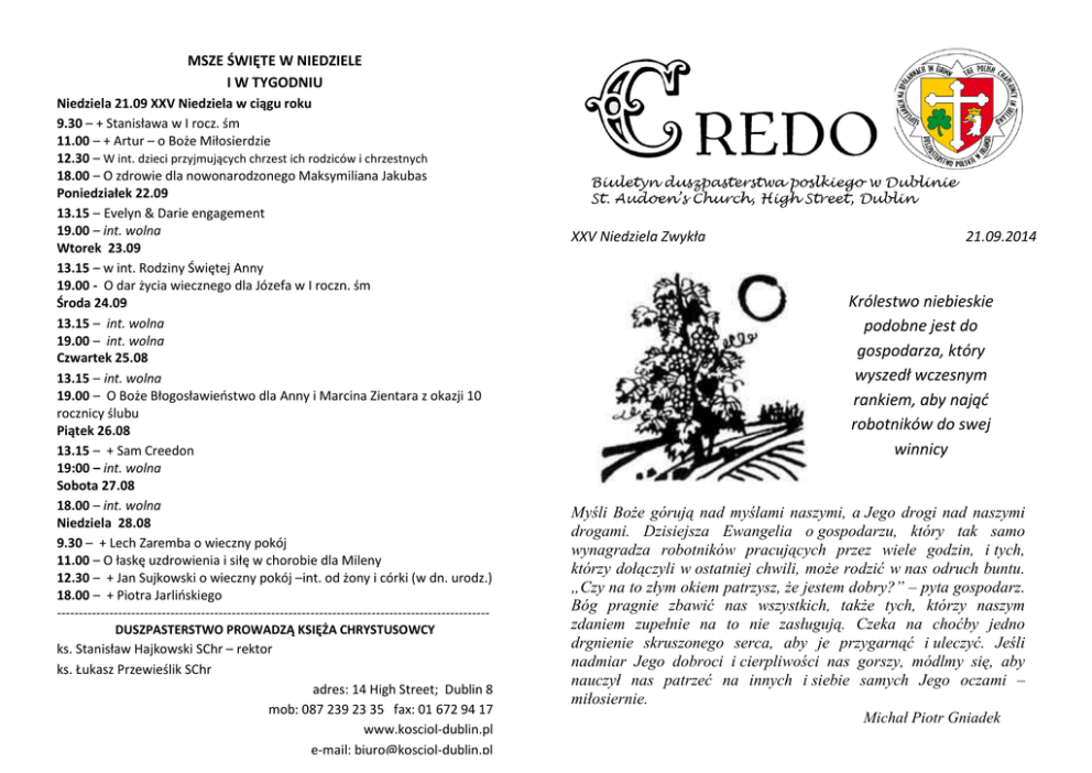 3 MSZE ŚWIĘTE W NIEDZIELE I W TYGODNIU Niedziela 21.09 XXV Niedziela w ciągu roku 9.30 – + Stanisława w I rocz. śm 11.00 – + Artur – o Boże Miłosierdzie 12.30 – W int. dzieci przyjmujących chrzest ich rodziców i chrzestnych 18.00 – O zdrowie dla nowonarodzonego Maksymiliana Jakubas Poniedziałek 22.09 13.15 – Evelyn & Darie engagement 19.00 – int. wolna Wtorek 23.09 13.15 – w int. Rodziny Świętej Anny 19.00 - O dar życia wiecznego dla Józefa w I roczn. śm Środa 24.09 13.15 – int. wolna 19.00 – int. wolna Czwartek 25.08 13.15 – int. wolna 19.00 – O Boże Błogosławieństwo dla Anny i Marcina Zientara z okazji 10 rocznicy ślubu Piątek 26.08 13.15 – + Sam Creedon 19:00 – int. wolna Sobota 27.08 18.00 – int. wolna Niedziela 28.08 9.30 – + Lech Zaremba o wieczny pokój 11.00 – O łaskę uzdrowienia i siłę w chorobie dla Mileny 12.30 – + Jan Sujkowski o wieczny pokój –int. od żony i córki (w dn. urodz.) 18.00 – + Piotra Jarlińskiego --------------------------------------------------------------------------------------------------DUSZPASTERSTWO PROWADZĄ KSIĘŻA CHRYSTUSOWCY ks. Stanisław Hajkowski SChr – rektor ks. Łukasz Przewieślik SChr adres: 14 High Street; Dublin 8 mob: 087 239 23 35 fax: 01 672 94 17 www.kosciol-dublin.pl e-mail: [email protected] XXV Niedziela Zwykła 21.09.2014 Królestwo niebieskie podobne jest do gospodarza, który wyszedł wczesnym rankiem, aby nająć robotników do swej winnicy Myśli Boże górują nad myślami naszymi, a Jego drogi nad naszymi drogami. Dzisiejsza Ewangelia o gospodarzu, który tak samo wynagradza robotników pracujących przez wiele godzin, i tych, którzy dołączyli w ostatniej chwili, może rodzić w nas odruch buntu. „Czy na to złym okiem patrzysz, że jestem dobry?” – pyta gospodarz. Bóg pragnie zbawić nas wszystkich, także tych, którzy naszym zdaniem zupełnie na to nie zasługują. Czeka na choćby jedno drgnienie skruszonego serca, aby je przygarnąć i uleczyć. Jeśli nadmiar Jego dobroci i cierpliwości nas gorszy, módlmy się, aby nauczył nas patrzeć na innych i siebie samych Jego oczami – miłosiernie. Michał Piotr Gniadek INFORMACJE DUSZPASTERSTWA KATECHEZY DOBREGO PASTERZA , podobnie jak Mnie zna Ojciec, a Ja znam Ojca. moje oddaj . J 10, 14-15 – Dobry Pasterz. ZAPROSZENIE HARCERZY W tym roku uroczyście obchodziliśmy okrągłą rocznice jednego z najbardziej krwawych i tragicznych powstań w dziejach naszego kraju, 70 rocznicę wybuchu Powstania Warszawskiego. Chcąc upamiętnić walkę i bohaterstwo ludzi którzy walczyli i ginęli w tych tragicznych dniach, harcerze z ZHPpg zorganizowali Apel Poległych. Wszystkich, którym nie jest obojętna historia naszego kraju i tych którzy chcą uczcić pamięć tych co walczyli i ginęli w Powstaniu Warszawskim zapraszamy na uroczystość która odbędzie się w kościele św. Audoen’a na High Street 4 /10/ 2014 o godzinie 16:30 w krypcie kościoła. Po przedstawieniu zapraszamy wszystkich na Mszę Świętą w kościele. ----------------------------------------------------- KRĄG BIBLIJNY Wznawiamy spotkania Kręgu Biblijnego. Pierwsze spotkanie w środę 24 września po Mszy Świętej wieczornej, ok. 19.45. w salce św. Anny. Do końca roku będziemy kontynuować nasze rozważania w oparciu o Ewangelię św. Marka. Spotkania będą odbywać się co dwa tygodnie. . Czy wychowanie religijne jest dzieciom w ogóle potrzebne? . : - ---------------------------------------------------- rozwoju tej unikalnej relacji , znaki i gesty wykonywane podczas liturgii KATECHEZY DOBREGO PASTERZA Katechezy dla dzieci rozpoczną się od października, 4 i 18 października katecheci zapraszają na spotkania organizacyjno-prezentacyjne. Zainteresowanych prosimy o kontakt i zgłoszenie chęci uczestnictwa katechetom. ---------------------------------------------------- Anna: 085 713 2241 [email protected] Rafał: 086 216 6908 [email protected] Katechezy będą odbywały się w soboty w salce przy kościele św. Audoen’a na High Street : KOLEKTA NIEDZIELNA I Kolekta II Kolekta Ofiary w kopertach 530 € 280€ 160 € Bóg zapłać za ofiary składane w kopertach, która są przeznaczone na bezpośrednie utrzymanie naszego kościoła
