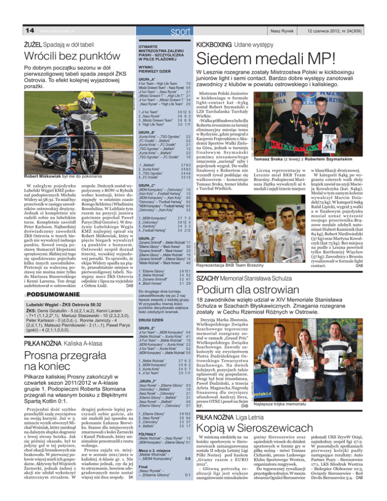sport ŻUŻEL Spadają w dół tabeli Nasz Rynek KICKBOXING Udane występy OTWARTE MISTRZOSTWA ZALEWU PIASKI - SZCZYGLICZKA W PIŁCE PLAŻOWEJ Wrócili bez punktów Po dobrym początku sezonu w dół pierwszoligowej tabeli spada zespół ŻKS Ostrovia. To efekt kolejnej wyjazdowej porażki. Siedem medali MP! WYNIKI: PIERWSZY DZIEŃ Fot. : ARCHIWUM GRUPA „A” 4 fun Team – High Life Team Młodzi Gniewni Team” – Nasz Rynek „4 fun Team” – „Nasz Rynek” „Młodzi Gniewni T.” - „High Life T.” „4 fun Team” – „Młodzi Gniewni T.” „Nasz Rynek” – “High Life Team” W Lesznie rozegrane zostały Mistrzostwa Polski w kickboxingu juniorów light i semi contact. Bardzo dobre występy zanotowali zawodnicy z klubów w powiatu ostrowskiego i kaliskiego. 7:0 0:5 2:1 2:1 3:4 2:0 Mistrzem Polski Juniorów w kickboxingu w formule light-contact kat -63kg został Robert Szymański z LZS Tarchalanka Tarchały Wielkie. -Walka półfinałowa była dla Roberta rewanżem za turniej eliminacyjny miesiąc temu w Rydzynie, gdzie przegrał z Kacprem Frątczakiem z Akademii Sportów Walki Zielona Góra, jednak w turnieju finałowym Szymański pomimo niesamowitego zmęczenia „zacisnął” zęby i pojedynek wygrał. Do walki finałowej z Robertem nie wyszedł rywal poddając się walkowerem - komentuje Tomasz Sroka, trener klubu z Tarchał Wielkich. 1 „4 fun Team” 3 6 12: 5 2. „Nasz Rynek” 3 6 8: 2 3. „Młodzi Gniewni Team” 3 6 6: 9 4. “High Life Team” 3 0 1:11 . GRUPA „B” „Kunta Kinte” – „TSG Ogrodex” 2:2 „FC Orzełki” – „Malfarb” 0:2 „Kunta Kinte” – „FC Orzełki” 2:1 „TSG Ogrodex” – „Malfarb” 1:2 „Kunta Kinte” – „Malfarb” 2:2 „TSG Ogrodex” – „FC Orzełki” 1:0 W zaległym pojedynku Lubelski Węgiel KMŻ pokonał podopiecznych Michała Widery aż 58:32. To miał byc przeciwnik w zasięgu zawodników ostrowskiej drużyny. Jednak ci kompletnie nie radzili sobie na lubelskim torze. Kompletnie zawiódł Peter Karlsson. Najbardziej doświadczony zawodnik ŻKS Ostrovia w trzech biegach nie wywalczył żadnego punktu. Szwed swoją postawę tłumaczył kłopotami sprzętowymi. Słabiej niż tego się spodziewano pojechało kilku innych zawodników. Pretensji za waleczną postawę nie można miec tylko do Mariusza Staszewskiego i Kenni Larsena. Ten drugi zadebiutował w ostrowskim zespole. Duńczyk został wypożyczony z ROW-u Rybnik wobec kontuzji, które dosięgnęły w ostatnim czasie Rorego Schleina i Władimira Borodulina. W Lublinie tym razem na pozycji juniora gościnnie pojechał Paweł Parys (Stal Gorzów). W drużynie Lubelskiego Węgla KMŻ najlepiej spisał się Robert Miśkowiak, który w pięciu biegach wywalczył 14 punktów z bonusem. Ostrowski zespół doznał trzeciej, wysokiej wyjazdowej porażki. To sprawiło, że ekipa Widery spadła na piąte, przeodstatnie miejsce w pierwszoligowej tabeli. Następny mecz ŻKS Ostrovia odjedzie 1 lipca na wyjeździe z Orłem Łódź. DAB PODSUMOWANIE Lubelski Węgiel - ŻKS Ostrovia 58:32 ŻKS: Denis Gizatullin - 5 (d,2,1,w,2), Kenni Larsen - 7+1 (1,1,2,2*,1), Mariusz Staszewski - 10 (2,3,2,3,0), Peter Karlsson - 0 (d,0,d,-), Ronnie Jamroży - 4 (2,d,1,1), Mateusz Piernikowski - 2 (1,-,1), Paweł Parys (gość) - 4 (2,1,1,0,0,0). PIŁKA NOŻNA Kaliska A-klasa Prosna przegrała na koniec Piłkarze kaliskiej Prosny zakończyli w czwartek sezon 2011/2012 w A-klasie grupie 1. Podopieczni Roberta Słomiana przegrali na własnym boisku z Błękitnymi Spartą Kotlin 0:1. Przyjezdni dość szybko przechylili szalę zwycięstwa na swoją korzyść. Już w 3. minucie wynik otworzył Michał Woźniak, który zamknął na dalszym słupku dogranie z lewej strony boiska. Jak się później okazało, był to jedyny gol w tej potyczce, choć okazji bramkowych nie brakowało. W pierwszej połowie więcej mieli ich gospodarze. Aktywny był Wojciech Żarnecki, jednak żadnej z akcji nie zdołał wykończyć skutecznym strzałem. W drugiej połowie lepiej poczynali sobie goście, ale nie znaleźli już sposobu na pokonanie Łukasza Borwika. Szanse dla miejscowych zmarnowali z kolei Żarnecki i Kamil Piskozub, który minimalnie przestrzelił z rzutu wolnego. Prosna zajęła 10. miejsce w sezonie 2011/2012 w kaliskiej A-klasie gr. 1. Nie wiadomo jednak, czy da jej to utrzymanie, bowiem zdegradowanych może zostać więcej niż dwa zespoły. SK 3 7 6:3 3 5 6:3 3 4 4:4 3 0 1:5 GRUPA „C” „MDM Komputery” – „Ostroviacy” „Kam Koty” – „Football Hartwig” „MDM Komputery” – „Kam Koty” “Ostroviacy” – “Football Hartwig” “MDM Komputery” – “Football Hartwig” „Ostroviacy” – „Kam Koty” 1. „MDM Komputery” 2. „Ostroviacy” 3. „Kamkoty” 4. „Football Hartwig” 1:0 1:0 0:0 9:2 6:0 3:2 3 9 10:1 3 4 5:2 3 2 4:7 3 1 2:9 Do drugiego dnia turnieju zakwalifikowały się po 2 najlepsze zespoły z każdej grupy. W przypadku równej ilości punktów decydowała większa ilość zdobytych bramek. DRUGI DZIEŃ GRUPA „E” „4 fun Team” – „MDM Komputery” 0:4 „Meble Woźniak” – „Kunta Kinte” 4:1 „4 Fun Team” – „Meble Woźniak” 1:5 „MDM Komputery” – „Kunta Kinte” 2:2 „4 fun Team” – „Kunta Kinte” 0:2 „MDM Komputery” – „Meble Woźniak” 0:0 1. „Meble Woźniak” 2. „MDM Komputery” 3. „Kunta Kinte” 4. „4 fun Team” 37 35 34 30 9: 2 6: 2 5: 7 1:11 „GRUPA „F” „Nasz Rynek” – „Elitarne Gibony” „Ostroviacy” – „Malfarb” „Nasz Rynek” – „Ostroviacy” „Elitarne Gibony” – „Malfarb” „Nasz Rynek” – „Malfarb” „Elitarne Gibony” – „Ostroviacy” 0:3 1:0 2:1 2:1 4:0 5:1 1. „Elitarne Gibony” 2. „Nasz Rynek” 3. „Ostroviacy” 4. „Malfarb” Liczną reprezentację w Lesznie miał BKB Team Brzeziny. Podopieczni Mariusza Ziętka wywalczyli aż 6 medali i zajęli trzecie miejsce 3 7 7: 0 3 6 12: 4 3 4 3: 3 3 0 2