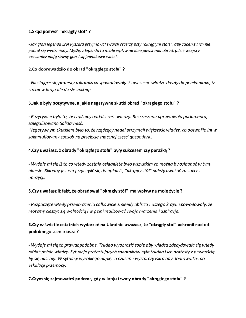 1.Skąd pomysł "okrągły stół" ? - Jak głosi legenda król Ryszard przyjmował swoich rycerzy przy "okrągłym stole", aby żaden z nich nie poczuł się wyróżniony. Myślę, ż legenda ta miała wpływ na idee powstania obrad, gdzie wszyscy uczestnicy mają równy głos i są jednakowo ważni. 2.Co doprowadziło do obrad "okrągłego stołu" ? - Nasilające się protesty robotników spowodowały iż ówczesne władze doszły do przekonania, iż zmian w kraju nie da się uniknąć. 3.Jakie były pozytywne, a jakie negatywne skutki obrad "okrągłego stołu" ? - Pozytywne było to, że rządzący oddali cześć władzy. Rozszerzono uprawnienia parlamentu, zalegalizowano Solidarność. Negatywnym skutkiem było to, że rządzący nadal utrzymali większość władzy, co pozwoliło im w zakamuflowany sposób na przejęcie znacznej części gospodarki. 4.Czy uważasz, ż obrady "okrągłego stołu" były sukcesem czy porażką ? - Wydaje mi się iż to co wtedy zostało osiągnięte było wszystkim co można by osiągnąć w tym okresie. Skłonny jestem przychylić się do opinii iż, "okrągły stół" należy uważać za sukces opozycji. 5.Czy uważasz iż fakt, że obradował "okrągły stół" ma wpływ na moje życie ? - Rozpoczęte wtedy przeobrażenia całkowicie zmieniły oblicza naszego kraju. Spowodowały, że możemy cieszyć się wolnością i w pełni realizować swoje marzenia i aspiracje. 6.Czy w świetle ostatnich wydarzeń na Ukrainie uważasz, że "okrągły stól" uchronił nad od podobnego scenariusza ? - Wydaje mi się to prawdopodobne. Trudno wyobrazić sobie aby władza zdecydowała się wtedy oddać pełnie władzy. Sytuacja protestujących robotników była trudna i ich protesty z pewnością by się nasilały. W sytuacji wysokiego napięcia czasami wystarczy iskra aby doprowadzić do eskalacji przemocy. 7.Czym się zajmowałeś podczas, gdy w kraju trwały obrady "okrągłego stołu" ? - W 1989 roku byłem świeżo po odbyciu służby wojskowej i rozpoczynałem pracę. Napisz z kim przeprowadziłaś ten wywiad, ile miał lat, Wywiad przeprowadziła: Wiktoria Biernat Na pytania odpowiadał mój tata Alfred Biernat lat 48