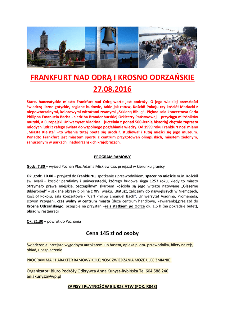 FRANKFURT NAD ODRĄ I KROSNO ODRZAŃSKIE 27.08.2016 Stare, hanzeatyckie miasto Frankfurt nad Odrą warte jest podróży. O jego wielkiej przeszłości świadczą liczne gotyckie, ceglane budowle, takie jak ratusz, Kościół Pokoju czy kościół Mariacki z niepowtarzalnymi, kolorowymi witrażami zwanymi „Szklaną Biblią”. Piękna sala koncertowa Carla Philippa Emanuela Bacha - siedziba Brandenburskiej Orkiestry Państwowej – przyciąga miłośników muzyki, a Europejski Uniwersytet Viadrina (uczelnia z ponad 500-letnią historią) chętnie zaprasza młodych ludzi z całego świata do wspólnego pogłębiania wiedzy. Od 1999 roku Frankfurt nosi miano „Miasta Kleista” –to właśnie tutaj poeta się urodził, studiował i tutaj mieści się jego muzeum. Ponadto Frankfurt jest miastem sportu z centrum przygotowań olimpijskich, miastem zielonym, zanurzonym w parkach i nadodrzanskich krajobrazach. PROGRAM RAMOWY Godz. 7.30 – wyjazd Poznań Plac Adama Mickiewicza, przejazd w kierunku granicy Ok. godz. 10.00 – przyjazd do Frankfurtu, spotkanie z przewodnikiem, spacer po mieście m.in. Kościół św. Marii – kościół parafialny i uniwersytecki, którego budowa sięga 1253 roku, kiedy to miasto otrzymało prawa miejskie. Szczególnym skarbem kościoła są jego witraże nazywane „Gläserne Bilderbibel“ – szklane obrazy biblijne z XIV. wieku. ,Ratusz, zaliczany do największych w Niemczech, Kościół Pokoju, sala konzertowa - "Carl Philipp Emanuel Bach", Uniwersytet Viadrina, Promenada, Dzwon Przyjaźni, czas wolny w centrum miasta (duże centrum handlowe, kawiarenki),przejazd do Krosna Odrzańskiego, przejście na przystań –rejs statkiem po Odrze ok. 1,5 h (na pokładzie bufet), obiad w restauracji Ok. 21.30 – powrót do Poznania Cena 145 zł od osoby Świadczenia: przejazd wygodnym autokarem lub busem, opieka pilota- przewodnika, bilety na rejs, obiad, ubezpieczenie PROGRAM MA CHARAKTER RAMOWY KOLEJNOŚĆ ZWIEDZANIA MOŻE ULEC ZMIANIE! Organizator: Biuro Podróży Odkrywca Anna Kunysz-Rybińska Tel 604 588 240 [email protected] ZAPISY I PŁATNOŚĆ W BIURZE ATW (POK. R043)