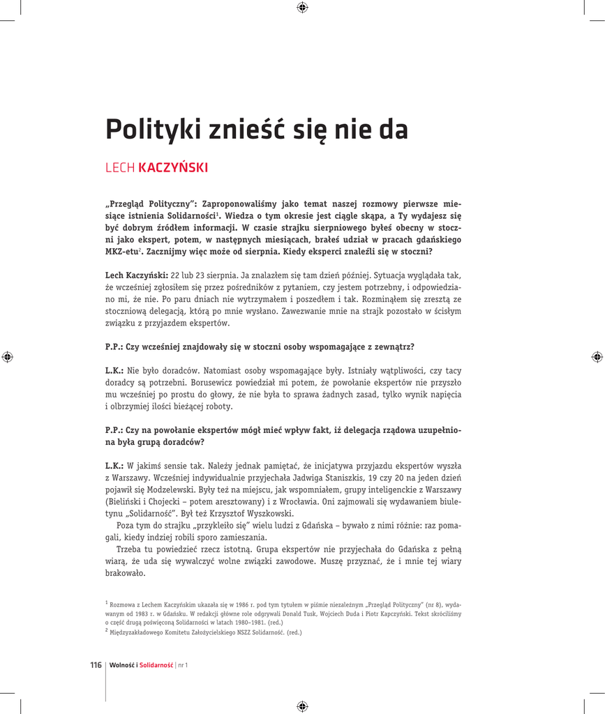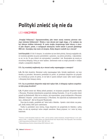 LECH KACZYŃSKI Polityki znieść się nie da Lech Kaczyński „Przegląd Polityczny”: Zaproponowaliśmy jako temat naszej rozmowy pierwsze miesiące istnienia Solidarności1. Wiedza o tym okresie jest ciągle skąpa, a Ty wydajesz się być dobrym źródłem informacji. W czasie strajku sierpniowego byłeś obecny w stoczni jako ekspert, potem, w następnych miesiącach, brałeś udział w pracach gdańskiego MKZ-etu2. Zacznijmy więc może od sierpnia. Kiedy eksperci znaleźli się w stoczni? Lech Kaczyński: 22 lub 23 sierpnia. Ja znalazłem się tam dzień później. Sytuacja wyglądała tak, że wcześniej zgłosiłem się przez pośredników z pytaniem, czy jestem potrzebny, i odpowiedziano mi, że nie. Po paru dniach nie wytrzymałem i poszedłem i tak. Rozminąłem się zresztą ze stoczniową delegacją, którą po mnie wysłano. Zawezwanie mnie na strajk pozostało w ścisłym związku z przyjazdem ekspertów. P.P.: Czy wcześniej znajdowały się w stoczni osoby wspomagające z zewnątrz? L.K.: Nie było doradców. Natomiast osoby wspomagające były. Istniały wątpliwości, czy tacy doradcy są potrzebni. Borusewicz powiedział mi potem, że powołanie ekspertów nie przyszło mu wcześniej po prostu do głowy, że nie była to sprawa żadnych zasad, tylko wynik napięcia i olbrzymiej ilości bieżącej roboty. P.P.: Czy na powołanie ekspertów mógł mieć wpływ fakt, iż delegacja rządowa uzupełniona była grupą doradców? L.K.: W jakimś sensie tak. Należy jednak pamiętać, że inicjatywa przyjazdu ekspertów wyszła z Warszawy. Wcześniej indywidualnie przyjechała Jadwiga Staniszkis, 19 czy 20 na jeden dzień pojawił się Modzelewski. Były też na miejscu, jak wspomniałem, grupy inteligenckie z Warszawy (Bieliński i Chojecki – potem aresztowany) i z Wrocławia. Oni zajmowali się wydawaniem biuletynu „Solidarność”. Był też Krzysztof Wyszkowski. Poza tym do strajku „przykleiło się” wielu ludzi z Gdańska – bywało z nimi różnie: raz pomagali, kiedy indziej robili sporo zamieszania. Trzeba tu powiedzieć rzecz istotną. Grupa ekspertów nie przyjechała do Gdańska z pełną wiarą, że uda się wywalczyć wolne związki zawodowe. Muszę przyznać, że i mnie tej wiary brakowało. 1 Rozmowa z Lechem Kaczyńskim ukazała się w 1986 r. pod tym tytułem w piśmie niezależnym „Przegląd Polityczny” (nr 8), wydawanym od 1983 r. w Gdańsku. W redakcji główne role odgrywali Donald Tusk, Wojciech Duda i Piotr Kapczyński. Tekst skróciliśmy o część drugą poświęconą Solidarności w latach 1980–1981. (red.) 2 116 Międzyzakładowego Komitetu Założycielskiego NSZZ Solidarność. (red.) Wolność i Solidarność | nr 1 Polityki znieść się nie da Mała sala BHP w Stoczni Gdańskiej, przy stole siedzą m.in. Lech Kaczyński, Anna Walentynowicz, sierpień 1980 r. Fot. Stanisław Składanowski, zbiory ECS Zaraz po przybyciu do stoczni zostałem zaproszony na posiedzenie, które odbywało się w stołówce któregoś z wydziałów. Byli tam wszyscy eksperci i większość członków prezydium MKS-u. To tam właśnie eksperci przedstawili tzw. wariant B porozumienia, który jednak w dalszym przebiegu wydarzeń nie odegrał żadnej roli. P.P.: Na czym polegał ten wariant? L.K.: Była to koncepcja o charakterze zastępczym wobec idei wolnych związków i wchodziła w grę dopiero wówczas, gdyby powołanie do życia takich związków okazało się absolutnie niemożliwe. Tzw. wariant B przewidywał powstanie Komitetów Kontroli Robotniczej. Miałyby one działać w regionie gdańskim, pełniąc rolę związkowo-samorządową. Byłyby to komitety zakładowe. Tam były dwie wersje – w pierwszej komitety te powiązane byłyby organizacyjnie z Wojewódzką Radą Związków Zawodowych, w drugiej – byłyby samodzielne. Ten drugi był wariantem zasadniczym. P.P.: Te komitety miały działać tylko lokalnie, na Wybrzeżu? L.K.: Strajk się toczył w ramach województwa. Formalnie porozumienia sierpniowe były podstawą do tworzenia niezależnych związków zawodowych w regionie, a nie w całej Polsce... Było jednak oczywiste, że taka sytuacja nie da się utrzymać. Kilka słów komentarza. Eksperci w strajku odegrali olbrzymią rolę i zaryzykowałbym twierdzenie, że bez nich porozumienie nie mogłoby dojść do skutku. To zaś, że szukali oni jakichś 117 LECH KACZYŃSKI innych rozwiązań od tego, które było przewidywane w postulacie pierwszym, jest kwestią ich politycznej odpowiedzialności. W owym czasie jeszcze postulat utworzenia wolnych związków był stanowczo odrzucany przez stronę rządową. Oczywiście, ta koncepcja jakiegoś zastępczego wyjścia nie była ujawniana. I nie sądzę, żeby delegacja rządowa o niej wiedziała. Nie było to w każdym razie nigdy przedmiotem rokowań. Pomysł ten trzymano w zapasie na wypadek bardzo niepomyślnego przebiegu rozmów. W żadnym więc razie nie można powiedzieć, że eksperci byli przeciwni wolnym związkom zawodowym. Szukali po prostu takich rozwiązań, które pozwoliłyby pokojowo zakończyć strajk w warunkach, gdyby ten podstawowy postulat okazał się nie do przeforsowania. P.P.: Kto wchodził w skład grupy ekspertów? L.K.: Właściwie były dwie grupy – prymasowska i Tadeusza Mazowieckiego. Grupa prymasowska bezpośrednio się na sali nigdy nie pojawiła. Właściwie można mówić o niej dopiero od września 1980 r. Funkcjonowała ona przede wszystkim poprzez bezpośrednie kontakty z Wałęsą. Istnienie tej grupy było wyrazem poparcia Kościoła i osobiście prymasa Wyszyńskiego dla tworzącej się Solidarności. Przedostatniego dnia strajku przybyli do stoczni Olszewski, Stelmachowski i Chrzanowski (wcześniej uniemożliwiono im wyjazd z Warszawy). Olszewski i Chrzanowski już w tamtych dniach opracowali pierwszy projekt statutu związku. Obecność tych osób okazała się pożyteczna, choć w skład grupy Mazowieckiego nie zostali włączeni. Podstawową g