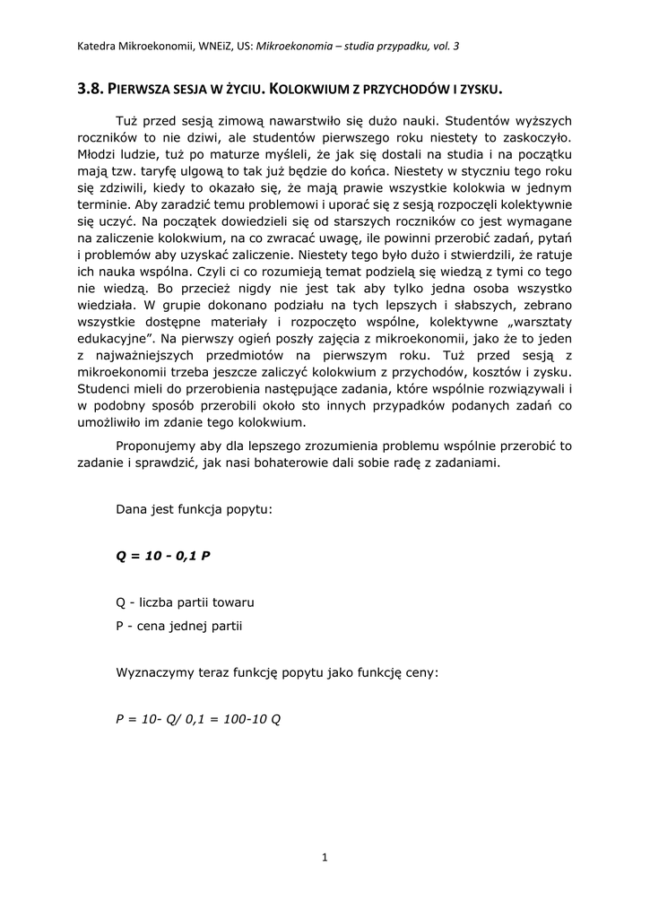 Katedra Mikroekonomii, WNEiZ, US: Mikroekonomia – studia przypadku, vol. 3 3.8. PIERWSZA SESJA W ŻYCIU. KOLOKWIUM Z PRZYCHODÓW I ZYSKU. Tuż przed sesją zimową nawarstwiło się dużo nauki. Studentów wyższych roczników to nie dziwi, ale studentów pierwszego roku niestety to zaskoczyło. Młodzi ludzie, tuż po maturze myśleli, że jak się dostali na studia i na początku mają tzw. taryfę ulgową to tak już będzie do końca. Niestety w styczniu tego roku się zdziwili, kiedy to okazało się, że mają prawie wszystkie kolokwia w jednym terminie. Aby zaradzić temu problemowi i uporać się z sesją rozpoczęli kolektywnie się uczyć. Na początek dowiedzieli się od starszych roczników co jest wymagane na zaliczenie kolokwium, na co zwracać uwagę, ile powinni przerobić zadań, pytań i problemów aby uzyskać zaliczenie. Niestety tego było dużo i stwierdzili, że ratuje ich nauka wspólna. Czyli ci co rozumieją temat podzielą się wiedzą z tymi co tego nie wiedzą. Bo przecież nigdy nie jest tak aby tylko jedna osoba wszystko wiedziała. W grupie dokonano podziału na tych lepszych i słabszych, zebrano wszystkie dostępne materiały i rozpoczęto wspólne, kolektywne „warsztaty edukacyjne”. Na pierwszy ogień poszły zajęcia z mikroekonomii, jako że to jeden z najważniejszych przedmiotów na pierwszym roku. Tuż przed sesją z mikroekonomii trzeba jeszcze zaliczyć kolokwium z przychodów, kosztów i zysku. Studenci mieli do przerobienia następujące zadania, które wspólnie rozwiązywali i w podobny sposób przerobili około sto innych przypadków podanych zadań co umożliwiło im zdanie tego kolokwium. Proponujemy aby dla lepszego zrozumienia problemu wspólnie przerobić to zadanie i sprawdzić, jak nasi bohaterowie dali sobie radę z zadaniami. Dana jest funkcja popytu: Q = 10 - 0,1 P Q - liczba partii towaru P - cena jednej partii Wyznaczymy teraz funkcję popytu jako funkcję ceny: P = 10- Q/ 0,1 = 100-10 Q 1 Katedra Mikroekonomii, WNEiZ, US: Mikroekonomia – studia przypadku, vol. 3 Wykres 1. Krzywa popytu dla Q = 10 - 0,1 P Pytanie do studentów uczących się do kolokwium: Czym charakteryzuje się krzywa popytu przedstawiona na wykresie powyżej? Przechodzimy całkowitego TR: teraz do ustalenia wielkości utargu czyli przychodu Rozpoczynamy od prognozowanie utargu (przychodu) dla Q = 10 - 0,1 P Pamiętając o tym, że przychód (utarg) za sprzedaży (TR), zwany również przychodem całkowitym, stanowi wartość pieniężną sprzedanych produktów bądź usług. Jest to określona suma pieniędzy jakie przedsiębiorstwo otrzymuje za wykonanie swojego zadania, jakim jest produkcja dóbr bądź świadczenie usług. Algebraicznie można przychód zapisać jako: TR = P x Q TR – przychód całkowity P – cena jednostkowa Q – wielkość sprzedanego produktu, zrealizowana sprzedaż Ważnym jest informacja, że przychód całkowity uzyskany ze sprzedaży swoich produktów jest zależny od sytuacji rynkowej, a konkretnie od popytu. Krzywa popytu określa cenę, po jakiej przedsiębiorstwo może sprzedawać swoje produkty. 2 Katedra Mikroekonomii, WNEiZ, US: Mikroekonomia – studia przypadku, vol. 3 Ilość partii Q Cena P 0 100 1 2 3 4 5 6 7 8 9 10 90 80 70 60 50 40 30 20 10 0 Przychód TR Znając wielkość produkcji (partii Q) oraz ceny P nasi studenci uzupełnili tabelę i wpisali obliczoną wielkość utargu, czyli przychodu. Poniżej został wykonany wykres krzywej przychodu i na podstawie tego wykresu studenci mieli wyznaczyć maksymalny przychód i określić przy jakiej wielkości produkcji zostanie on osiągnięty. Proszę podać wielkość maksymalnego przychodu i przy jakiej wielkości produkcji został on osiągnięty? Wykres 1. Krzywa przychodu Wszyscy uczęszczający na zajęcia studenci wiedzą, że jeśli (utarg) przychód całkowity to TR = P * Q oraz P = 100 - 10 Q to wynika z tego, że: TR = (100 - 10 Q) * Q TR = 100 Q - 10 Q2 Ponadto zakładamy, że wytworzenie 1 sztuki towaru kosztuje 260 USD (1 partia - 100 sztuk = 260.000 USD) - materiały, robocizna. Do tego doliczamy koszty stałe w wysokości 90.000 USD. 3 Katedra Mikroekonomii, WNEiZ, US: Mikroekonomia – studia przypadku, vol. 3 Posiadając te informacje nasi pilni studenci wyznaczyli funkcję kosztów, aby móc obliczyć poniesione koszty, a dopiero mając te informacje będą skłonni wyznaczyć zysk w przedsiębiorstwie. Funkcja kosztów całkowitych TC produkcji ma postać: TC = 90 + 26 Q Ilość produkcji Q 0 1 2 3 4 5 6 7 8 Koszt całkowity TC Korzystając ze zdobytej wiedzy proszę wyznaczyć koszty całkowite dla poszczególnych jednostek produkcji. Mając do dyspozycji wszystkie dane niezbędne do obliczenia zysku proszę uzupełnić tabelę i odpowiedzieć na następujące pytania: Kiedy zysk jest największy w tym przypadku? Czy firma osiąga starty przy naszych danych? Jeśli tak to dla jakich wielkości. Kiedy firma osiąga zyski a kiedy starty? Odpowiedz korzystając z zasady ogólnej wyznaczanie zysku w przedsiębiorstwie. Liczba partii Zysk Przychód (utarg) Koszty 0 1 2 3 4 5 6 7 8 Jeśli wykonaliście kochani studenci to zadanie poprawnie, korzystając ze swojej wiedzy zdobytej na wykładach, ćwiczeniach czy też w zaciszu nowej naszej 4 Katedra Mikroekonomii, WNEiZ, US: Mikroekonomia – studia przypadku, vol. 3 biblioteki uniwersyteckiej, to oznacza, że bez problemu zaliczycie to kolokwium z tej części materiału, a tym samym jest wielce prawdopodobne, że i z sesją się uporacie bezproblemowo. Bezapelacyjnie polecamy i zachęcamy do wspólnego zdobywania wiedzy ! 5
