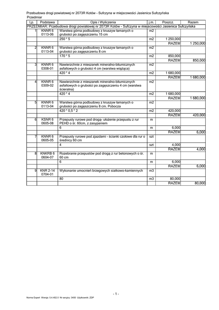 Przebudowa drogi powiatowej nr 2073R Kotów - Sufczyna w miejscowości Jasienica Sufczyńska Przedmiar Lp. Podstawa Opis i Wyliczenia j.m. Poszcz. 1 2 3 4 5 6 7 8 9 KNNR 6 0113-06 KNNR 6 0113-04 KNNR 6 0308-01 KNNR 6 0309-02 KNNR 6 0113-04 KSNR 6 0605-08 KNNR 6 0605-05 KNKRB 6 0604-07 KNR 2-14 0704-01 Warstwa górna podbudowy z kruszyw łamanych o grubości po zagęszczeniu 15 cm 250 * 5 m2 Warstwa górna podbudowy z kruszyw łamanych o grubości po zagęszczeniu 8 cm 170 * 5 m2 Nawierzchnie z mieszanek mineralno-bitumicznych asfaltowych o grubości 4 cm (warstwa wiążąca) 420 * 4 m2 Nawierzchnie z mieszanek mineralno-bitumicznych asfaltowych o grubości po zagęszczeniu 4 cm (warstwa ścieralna) 420 * 4 m2 Warstwa górna podbudowy z kruszyw łamanych o grubości po zagęszczeniu 8 cm. Pobocza 420 * 0,5 * 2 m2 Przepusty rurowe pod drogą- ułożenie przepustu z rur PEHD o śr. 60cm, z zasypaniem 6 m Przepusty rurowe pod zjazdami - ścianki czołowe dla rur o średnicy 60 cm 4 szt Rozebranie przepustów pod drogą z rur betonowych o śr. 60 cm 6 m Wykonanie umocnień brzegowych siatkowo-kamiennych m3 80 m3 -1Norma Expert Wersja: 5.4.402.0 Nr seryjny: 3400 Użytkownik: ZDP m2 m2 m2 m2 m2 m szt m 1 250,000 850,000 1 680,000 1 680,000 420,000 6,000 4,000 6,000 80,000 Razem