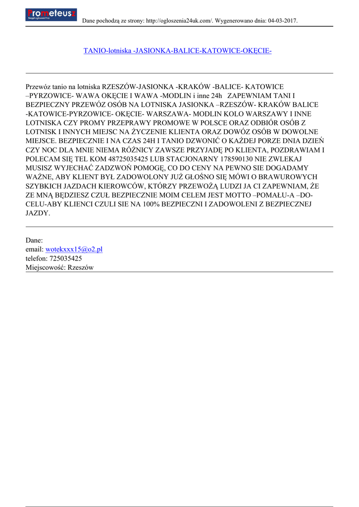 Dane pochodzą ze strony: http://ogloszenia24uk.com/. Wygenerowano dnia: 04-03-2017. TANIO-lotniska -JASIONKA-BALICE-KATOWICE-OKĘCIE- Przewóz tanio na lotniska RZESZÓW-JASIONKA -KRAKÓW -BALICE- KATOWICE –PYRZOWICE- WAWA OKĘCIE I WAWA -MODLIN i inne 24h ZAPEWNIAM TANI I BEZPIECZNY PRZEWÓZ OSÓB NA LOTNISKA JASIONKA –RZESZÓW- KRAKÓW BALICE -KATOWICE-PYRZOWICE- OKĘCIE- WARSZAWA- MODLIN KOLO WARSZAWY I INNE LOTNISKA CZY PROMY PRZEPRAWY PROMOWE W POLSCE ORAZ ODBIÓR OSÓB Z LOTNISK I INNYCH MIEJSC NA ŻYCZENIE KLIENTA ORAZ DOWÓZ OSÓB W DOWOLNE MIEJSCE. BEZPIECZNIE I NA CZAS 24H I TANIO DZWONIĆ O KAŻDEJ PORZE DNIA DZIEŃ CZY NOC DLA MNIE NIEMA RÓŻNICY ZAWSZE PRZYJADĘ PO KLIENTA, POZDRAWIAM I POLECAM SIĘ TEL KOM 48725035425 LUB STACJONARNY 178590130 NIE ZWLEKAJ MUSISZ WYJECHAĆ ZADZWOŃ POMOGĘ, CO DO CENY NA PEWNO SIE DOGADAMY WAŻNE, ABY KLIENT BYŁ ZADOWOLONY JUŻ GŁOŚNO SIĘ MÓWI O BRAWUROWYCH SZYBKICH JAZDACH KIEROWCÓW, KTÓRZY PRZEWOŻĄ LUDZI JA CI ZAPEWNIAM, ŻE ZE MNĄ BĘDZIESZ CZUŁ BEZPIECZNIE MOIM CELEM JEST MOTTO –POMAŁU-A –DOCELU-ABY KLIENCI CZULI SIE NA 100% BEZPIECZNI I ZADOWOLENI Z BEZPIECZNEJ JAZDY. Dane: email: [email protected] telefon: 725035425 Miejscowość: Rzeszów