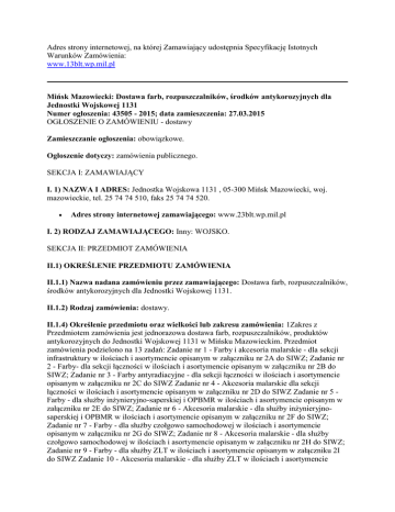 Adres strony internetowej, na której Zamawiający udostępnia Specyfikację Istotnych Warunków Zamówienia: www.13blt.wp.mil.pl Mińsk Mazowiecki: Dostawa farb, rozpuszczalników, środków antykorozyjnych dla Jednostki Wojskowej 1131 Numer ogłoszenia: 43505 - 2015; data zamieszczenia: 27.03.2015 OGŁOSZENIE O ZAMÓWIENIU - dostawy Zamieszczanie ogłoszenia: obowiązkowe. Ogłoszenie dotyczy: zamówienia publicznego. SEKCJA I: ZAMAWIAJĄCY I. 1) NAZWA I ADRES: Jednostka Wojskowa 1131 , 05-300 Mińsk Mazowiecki, woj. mazowieckie, tel. 25 74 74 510, faks 25 74 74 520. Adres strony internetowej zamawiającego: www.23blt.wp.mil.pl I. 2) RODZAJ ZAMAWIAJĄCEGO: Inny: WOJSKO. SEKCJA II: PRZEDMIOT ZAMÓWIENIA II.1) OKREŚLENIE PRZEDMIOTU ZAMÓWIENIA II.1.1) Nazwa nadana zamówieniu przez zamawiającego: Dostawa farb, rozpuszczalników, środków antykorozyjnych dla Jednostki Wojskowej 1131. II.1.2) Rodzaj zamówienia: dostawy. II.1.4) Określenie przedmiotu oraz wielkości lub zakresu zamówienia: 1Zakres z Przedmiotem zamówienia jest jednorazowa dostawa farb, rozpuszczalników, produktów antykorozyjnych do Jednostki Wojskowej 1131 w Mińsku Mazowieckim. Przedmiot zamówienia podzielono na 13 zadań: Zadanie nr 1 - Farby i akcesoria malarskie - dla sekcji infrastruktury w ilościach i asortymencie opisanym w załączniku nr 2A do SIWZ; Zadanie nr 2 - Farby- dla sekcji łączności w ilościach i asortymencie opisanym w załączniku nr 2B do SIWZ; Zadanie nr 3 - Farby antyradiacyjne - dla sekcji łączności w ilościach i asortymencie opisanym w załączniku nr 2C do SIWZ Zadanie nr 4 - Akcesoria malarskie dla sekcji łączności w ilościach i asortymencie opisanym w załączniku nr 2D do SIWZ Zadanie nr 5 Farby - dla służby inżynieryjno-saperskiej i OPBMR w ilościach i asortymencie opisanym w załączniku nr 2E do SIWZ; Zadanie nr 6 - Akcesoria malarskie - dla służby inżynieryjnosaperskiej i OPBMR w ilościach i asortymencie opisanym w załączniku nr 2F do SIWZ; Zadanie nr 7 - Farby - dla służby czołgowo samochodowej w ilościach i asortymencie opisanym w załączniku nr 2G do SIWZ; Zadanie nr 8 - Akcesoria malarskie - dla służby czołgowo samochodowej w ilościach i asortymencie opisanym w załączniku nr 2H do SIWZ; Zadanie nr 9 - Farby - dla służby ZLT w ilościach i asortymencie opisanym w załączniku 2I do SIWZ Zadanie 10 - Akcesoria malarskie - dla służby ZLT w ilościach i asortymencie opisanym w załączniku 2J do SIWZ; Zadanie 11 - Farby - dla służby żywnościowej w ilościach i asortymencie opisanym w załączniku 2K do SIWZ; Zadanie 12 - Akcesoria malarskie - dla służby żywnościowej w ilościach i asortymencie opisanym w załączniku 2L do SIWZ; Zadanie nr 13 - Farby i akcesoria malarskie - dla służby MPS w ilościach i asortymencie opisanym w załączniku nr 2Ł do SIWZ; Zamawiający dopuszcza możliwość złożenia oferty na dowolną ilość zadań, przy czym oferty dotyczące poszczególnych zadań muszą być kompletne. Oferty nie zawierające pełnego zakresu przedmiotu zamówienia określonego w poszczególnych zadaniach zostaną odrzucone. Wymagania zamawiającego w zakresie oferowanych produktów: Zamawiający wymaga by Wykonawca wypełnił kolumnę nr 7 (zadanie nr 1, 2, 3,5, 7, 9, 11, 13 ) oraz dla zadania nr 8 pozycja 1, 2, 3, 4 i dla zadania nr 10 pozycja1, 17, 18 19, 20, 21, 22, 23, 24, 25, 26, 27, 28, 29, 30, 31, 32, 33, w celu umożliwienia porównania parametrów oferowanych produktów z żądanymi przez Zamawiającego. Nie wskazanie żądanych informacji skutkować będzie odrzuceniem oferty zgodnie z art. 89 ust.1 pkt 2 ustawy Prawo zamówień publicznych. Dostarczone farby, rozpuszczalniki, produkty antykorozyjne muszą być fabrycznie nowe wcześniej nie używane i posiadać cechy pierwotnego opakowania oraz odpowiadać wszystkim cechom określonym w formularzu cenowym; Dostarczone farby, rozpuszczalniki, produkty antykorozyjne będą posiadały parametry określone w specyfikacji oraz wymagane atesty, certyfikaty lub karty charakterystyki; Warunki dostawy Dostawy winny być realizowane w godzinach od 8.00 do 14.00 tylko w dni robocze do Jednostki Wojskowej 1131. Przekazanie przedmiotu zamówienia nastąpi w siedzibie Zamawiającego na podstawie protokołu odbioru sporządzonego w dniu dostawy, który będzie podstawą wystawienia faktury. Za przyjęcie przedmiotu umowy rozumie się podpisanie przez Zamawiającego protokołu odbioru lub dokumentu WZ i odesłanie go do Wykonawcy. Odpowiedzialność za jakość dostarczonego towaru przejmuje Wykonawca do końca okresu przydatności do użytku danego artykułu. W przypadku wykrycia wad dostarczonego towaru, Wykonawca zobowiązany jest wymienić na własny koszt towar wadliwy na towar wolny od wad w terminie obowiązywania umowy. Zamawiający wymaga, aby dostarczone artykuły były oznaczone zgodnie z danymi określonymi w Formularzu cenowym odpowiednio dla zadania. W przypadku braku takiego oznaczenia, Wykonawca zobowiązany jest, przy dostawie towaru, do przedstawienia odpowiedniej dokumentacji potwierdzającej, że dostarczony asortyment jest zgodny z wymaganiami Zamawiającego. W przypadku, gdy dostarczony towar (w części lub całości) nie będzie odpowiadał opisowi zawartemu w Formularzu cenowym, Zamawiający odmówi przyjęcia towaru, a Wykonawca zobowiązany będzie do dostarczenia towaru zgodnego z przedmiotem zamówienia w terminie trwania umowy. Koszt dostawy asortymentu wolnego od wad poniesie Wykonawca. Wykonawca, przy dostawie farb, rozpuszczalników, lakierów oraz artykułów konserwujących musi dołączyć do każdego preparatu kartę charakterystyki (MSDS) w języku polskim. Wykonawca, wraz z dostawą dostarczy Zamawiającemu atesty potwierdzające zgodność bezpieczeństwa wymaganego przepisami dla danego produktu, jeśli takie posiada. Wraz z dostawą Wykonawca zobowiązany jest do przedstawienia informacji o terminie przechowywania oraz okresie przydatności 