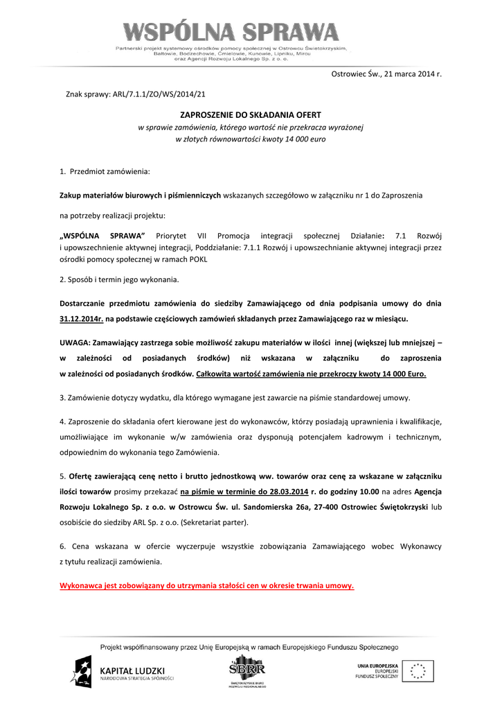 Ostrowiec Św., 21 marca 2014 r. Znak sprawy: ARL/7.1.1/ZO/WS/2014/21 ZAPROSZENIE DO SKŁADANIA OFERT w sprawie zamówienia, którego wartość nie przekracza wyrażonej w złotych równowartości kwoty 14 000 euro 1. Przedmiot zamówienia: Zakup materiałów biurowych i piśmienniczych wskazanych szczegółowo w załączniku nr 1 do Zaproszenia na potrzeby realizacji projektu: „WSPÓLNA SPRAWA” Priorytet VII Promocja integracji społecznej Działanie: 7.1 Rozwój i upowszechnienie aktywnej integracji, Poddziałanie: 7.1.1 Rozwój i upowszechnianie aktywnej integracji przez ośrodki pomocy społecznej w ramach POKL 2. Sposób i termin jego wykonania. Dostarczanie przedmiotu zamówienia do siedziby Zamawiającego od dnia podpisania umowy do dnia 31.12.2014r. na podstawie częściowych zamówień składanych przez Zamawiającego raz w miesiącu. UWAGA: Zamawiający zastrzega sobie możliwość zakupu materiałów w ilości innej (większej lub mniejszej – w zależności od posiadanych środków) niż wskazana w załączniku do zaproszenia w zależności od posiadanych środków. Całkowita wartość zamówienia nie przekroczy kwoty 14 000 Euro. 3. Zamówienie dotyczy wydatku, dla którego wymagane jest zawarcie na piśmie standardowej umowy. 4. Zaproszenie do składania ofert kierowane jest do wykonawców, którzy posiadają uprawnienia i kwalifikacje, umożliwiające im wykonanie w/w zamówienia oraz dysponują potencjałem kadrowym i technicznym, odpowiednim do wykonania tego Zamówienia. 5. Ofertę zawierającą cenę netto i brutto jednostkową ww. towarów oraz cenę za wskazane w załączniku ilości towarów prosimy przekazać na piśmie w terminie do 28.03.2014 r. do godziny 10.00 na adres Agencja Rozwoju Lokalnego Sp. z o.o. w Ostrowcu Św. ul. Sandomierska 26a, 27-400 Ostrowiec Świętokrzyski lub osobiście do siedziby ARL Sp. z o.o. (Sekretariat parter). 6. Cena wskazana w ofercie wyczerpuje wszystkie zobowiązania Zamawiającego wobec Wykonawcy z tytułu realizacji zamówienia. Wykonawca jest zobowiązany do utrzymania stałości cen w okresie trwania umowy. Zamawiający zastrzega możliwość rozwiązania umowy z Wykonawcą w przypadku niepodpisania umowy o dofinansowanie projektu „WSPÓLNA SPRAWA” z Instytucją Pośredniczącą. 7. Kryterium oceny oferty: cena – 100 % 8. Ewentualne wyjaśnienia uzyskać można kontaktując się w wyżej określony sposób, przed upływem terminu składania ofert. 9. Zamawiający zastrzega sobie możliwość prowadzenia negocjacji w celu ustalenia najkorzystniejszych warunków realizacji Zamówienia, z wybranymi Wykonawcami, którzy złożyli oferty zawierające cenę oraz spełniają wymagania w zakresie właściwości podmiotowej przedmiotu Zamówienia, 10. Realizacja zamówienia zostanie zlecona Wykonawcy, który zaoferował ostatecznie najkorzystniejsze warunki realizacji Zamówienia i przyjął wymagania określone w zaproszeniu do składania ofert oraz zgodził się na zawarcie pisemnej umowy. 11. Zamawiający zastrzega możliwość udzielenia kolejnego zamówienia do wysokości 50% wartości zamówienia określonego w umowie z Wykonawcą w tym samym roku kalendarzowym, jeżeli zachodzi konieczność udzielenia zamówienia tożsamego z uprzednio udzielonym zamówieniem, a udzielenie zamówienia w ten sposób jest z korzyścią dla Zamawiającego. Prezes Zarządu ARL Sp. z o.o. Magdalena Salwerowicz Załącznik nr 1 do Zaproszenia Lp. Nazwa J.m Szacunkowa ilość Kwota netto Kwota brutto za za sztukę sztukę Kwota netto za całość 1. 2. 3. Długopis jednorazowy z cienką końcówką (BIC Orange) sztuka 27 Długopis Cello Maxritter z wymiennym wkładem różne kolory sztuka 138 sztuka 2 Dziurkacz biurowy metalowy z metalową podstawką i uchwytem (do 25 kartek) LACO 4. 5. 6. 7. 8. 9. Etykieta samoprzylepna, A4 (opakowanie/100 szt.) opakowanie IGEPA 6 Folia Bezbarwna 150 MIC, 100 szt./op. (okładki do opakowanie bindowania-przód) 3 Folia do faxu – Panasonic KX-FC228 oryginalna KXFA52A sztuka 6 Folia do laminowania PE/A4 100 MIC St. Bł. Antyst.(100 szt.) sztuka 2 Gumka do ścierania dwuczęściowa Pelikan AC30 sztuka 10 Karteczki indeksujące 20 x sztuka 30 Kwota brutto za całość 50 mm, 4 x 50 szt. 3M Karteczki samoprzylepne – notes 76x76, 450 arkuszy w opakowaniu, mix kolor sztuka 13 11. Klipy biurowe 19mm (op./12szt.) sztuka 17 12. Klipy biurowe 25mm (op./12szt.) sztuka 17 Brulion A4, 96 kartkowy, oprawa twarda, kratka, szyty sztuka 100 Koperta A4 plastikowa na zatrzask sztuka 10 Korektor w płynie z aplikatorem (20ml) Tippex sztuka 10 16. Korektor w taśmie 10M Tippex sztuka 10 17. Kostka kolor 85*85 10 kolor sztuka 10 18. koszulki A4, 100 sztuk w op. 50mic opakowanie 13 Koszulki na płyty z europerforacją (op./10 szt.) opakowanie 10 Koszulki na dokumenty A4 groszkowe (op./100 szt.) 50mic opakowanie 8 21. Listwy wsuwane 9 mm, (op./50szt) opakowanie 6 22. Marker do płyt CD / DVD 1mm (czarny) Edding M sztuka 9 10. 13. 14. 15. 19. 20. 23. 24. 25. 26. Marker suchościeralny do tablicy z gąbką, 4 kolory+ gąbka Pentel sztuka 11 Masa mocująca kolorowa 57G sztuka 5 Nożyczki asymetryczne z uchwytem z tworzywa 21 cm Donau sztuka 6 Ofertówki krystaliczne Esselte A4/80 opakowanie mic "L" (op./100szt.) 2 Okładki nabłyszczane A4/250g - kolor (op/100szt.) opakowanie 4 28. Ołówek grafitowy z gumką Pelican sztuka 47 29. Papier do Flipcharta 50 kartek gładki 65x100 cm sztuka 30 30. Papier ksero kolor A4 80g/m2 (500 ark.) ryza 9 PapierXero A4 Colorit 160g Maestro Color (ryza - 250ark.) sztuka 6 Papier xero biały A4/80g (op./5ryz) białość 166 Maestro Extra opakowanie 80 Pinezki tablicowe kolorowe, (op/30szt.) opakowanie 11 Płyty CD-R 700MB/80 MIN (op./50 szt.) Verbatim opakowanie 8 Płyty DVD 4,7 GB (op./25szt.) Verbatim opakowanie 7 27. 31. 32. 33. 34. 35. 36. 37. 38. 39. 40. Przekładki do segregatora A4 (kartonowe z laminowanymi indeksami) 12 szt. w opakowaniu komplet 16 Przekładki rozdzielające do segregator