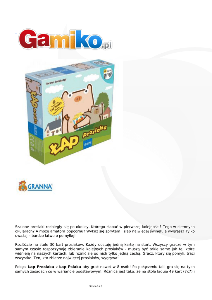 Szalone prosiaki rozbiegły się po okolicy. Którego złapać w pierwszej kolejności? Tego w ciemnych okularach? A może amatora popcornu? Wykaż się sprytem i złap najwięcej świnek, a wygrasz! Tylko uważaj – bardzo łatwo o pomyłkę! Rozłóżcie na stole 30 kart prosiaków. Każdy dostaję jedną kartę na start. Wszyscy gracze w tym samym czasie rozpoczynają zbieranie kolejnych prosiaków - muszą być takie same jak te, które widnieją na naszych kartach, lub różnić się od nich tylko jedną cechą. Gracz, który się pomyli, traci wszystko. Ten, kto zbierze najwięcej prosiaków, wygrywa! Połącz Łap Prosiaka z Łap Psiaka aby grać nawet w 8 osób! Po połączeniu talii gra się na tych samych zasadach co w wariancie podstawowym. Różnica jest taka, że na stole ląduje 49 kart (7x7) i Strona 1 z 3 pojawia się nowa różnica - rodzaj zwierzęcia. Dodatkowo, osoba, która zatrzyma grę z słusznych względów, dostaje dwie dodatkowe karty. Zawartość pudełka: 96 kart 1 żeton lidera 1 instrukcja Wiek od 7 lat Liczba graczy 1-5 Czas gry ok. 15 minut Instrukcja polska Wydanie polskie Producent Granna Projektant Strona 2 z 3 Torsten Landsvogt Ilustrator Ari Wong Strona 3 z 3