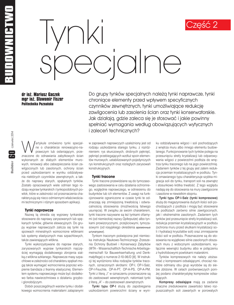 BUDOWNICTWO Tynki specjalne dr inż. Mariusz Gaczek mgr inż. Sławomir Fiszer Builder 60 czerwiec 2014 Politechnika Poznańska W artykule omówiono tynki specjalne o charakterze renowacyjno-naprawczym lub osłaniającym, przeznaczone do odnawiania zabytkowych ścian wykonanych ze słabych elementów murowych, renowacji albo zabezpieczania ścian zawilgoconych lub zasolonych, ochrony ścian przed uszkodzeniami w wyniku oddziaływania niektórych czynników zewnętrznych, a także do naprawy starych, spękanych tynków. Zostało opracowanych wiele odmian tego rodzaju wypraw tynkarskich i tynkopodobnych powłok, które w zależności od przeznaczenia charakteryzują się nieco odmiennymi właściwościami technicznymi i różnym sposobem aplikacji. Tynki naprawcze Nazwą tą określa się wyprawy tynkarskie stosowane do naprawy zarysowanych lub spękanych tynków, głównie elewacyjnych. Do grupy wypraw naprawczych zalicza się tynki na spoiwach mineralnych wzmocnione włóknami lub systemy elastycznych mas szpachlowych, także zawierających włókna. Tynki wykorzystywane do napraw starych, zarysowanych wypraw tynkarskich najczęściej wymagają dodatkowego zbrojenia siatką z włókna szklanego. Naprawcze masy szpachlowe w zależności od charakteru spękań mogą także wymagać wzmocnienia poprzez wtopienie bandaża z tkaniny elastycznej. Elementem systemu naprawczego może być dodatkowo farba nawierzchniowa o działaniu grzyboi glonobójczym. Dobór poszczególnych warstw tynku i dodatkowego wzmocnienia materiałami zatapianymi Część 2 Do grupy tynków specjalnych należą tynki naprawcze, tynki chroniące elementy przed wpływem specyficznych czynników zewnętrznych, tynki umożliwiające redukcję zawilgocenia lub zasolenia ścian oraz tynki konserwatorskie. Jak działają, gdzie zaleca się je stosować i jakie powinny spełniać wymagania według obowiązujących wytycznych i zaleceń technicznych? w zaprawach naprawczych uzależniony jest od rodzaju uszkodzenia starego tynku, z rozróżnieniem: rys skurczowych, drobnych pęknięć, pęknięć przebiegających wzdłuż spoin elementów murowych, ustabilizowanych pojedynczych rys konstrukcyjnych oraz rozległych zarysowań konstrukcyjnych. Tynki tracone Tynki tracone przewidziane są do tymczasowego zastosowania w celu działania ochronnego, względnie naprawczego, w odniesieniu do budynków lub ich elementów. Z uwagi na funkcjonowanie ograniczone w czasie tynki te odznaczają się zmniejszoną trwałością i odwracalnością stosowania (możliwością łatwego usunięcia). W związku ze swoim charakterem, tynki tracone nazywane są też tynkami ofiarnymi (od niemieckiej nazwy Opferputze) albo tynkami prowizorycznymi, przejściowymi, tymczasowymi (od rosyjskiego określenia временные штукатурки). Tynkom traconym poświęcona jest niemiecka instrukcja Naukowo-Technicznego Zrzeszenia Ochrony Budowli i Konserwacji Zabytków (WTA – Wissenschaftlich-Technische Arbeitsgemeinschaft für Bauwerkserhaltung und Denkmalpflege) o numerze 2-10-06/D [8]. W instrukcji tej wyróżniono kilka rodzajów tynków traconych, oznaczonych skrótami: OP-I, OP-I-Salz, OP-I-Feuchte, OP-A-PT, OP-A-PS, OP-A-PM. Tynki z literą „I” w oznaczeniu przeznaczone są do zastosowań wewnętrznych, natomiast tynki z literą „A” – do zastosowań zewnętrznych. Tynki typu OP-I służą do zapobiegania uszkodzeniom powierzchni ściany w wyni- ku oddziaływania wilgoci i soli pochodzących z wnętrza muru albo innego elementu budowlanego. Funkcjonowanie tych tynków polega na przesunięciu strefy krystalizacji lub odparowywania wilgoci z powierzchni podłoża do wnętrza tynku traconego lub na jego powierzchnię. Zadaniem tynków z tej grupy jest zatem redukcja przemian krystalizacyjnych w podłożu. Tynki omawianego typu charakteryzuje szybka migracja soli do tynku, transport soli na zewnątrz i stosunkowo krótka trwałość. Z tego względu nadają się do stosowania na mury zawilgocone i zasolone w niewielkim stopniu. Tynki typu OP-I-Salz (tynki kompresowe) służą do magazynowania dużych ilości soli pochodzących z podłoża i mogą być stosowane na podłożach zarówno silnie zawilgoconych, jaki i ekstremalnie zasolonych. Zadaniem tych tynków jest przesunięcie strefy krystalizacji soli, redukcja przemian krystalizacyjnych w podłożu (ochrona muru przed skutkami krystalizacji soli i hydratacji kryształów soli) oraz zmniejszenie ilości soli w podłożu. Przeznaczone są do stosowania na wyjątkowo silnie zasolonych obszarach muru z widocznymi uszkodzeniami, wyłącznie wewnątrz budynku albo w połączeniu z hydrofobowymi powłokami malarskimi. Tynków kompresowych nie należy utożsamiać z kompresami odsalającymi, chociaż niektóre odmiany obu grup wyrobów są do siebie zbliżone. W celach porównawczych poniżej podano charakterystykę kompresów odsalających. Kompresy odsalające mają za zadanie znaczne zredukowanie zawartości łatwo rozpuszczalnych soli zawartych w porowatych żeniu czynnikami zewnętrznymi takimi jak: sole, gazy reaktywne, pyły, sadze czy mikroorganizmy. Przeznaczone są do redukcji wpływu wyjątkowo dużych zanieczyszczeń środowiskowych i oddziaływań klimatycznych. Tynki typu OP-A-PM to tynki chroniące przed mechanicznymi uszkodzeniami w wyniku uderzania, ścierania itd. Ich zadaniem jest utworzenie warstwy buforowej przed tego rodzaju oddziaływaniami. Przeznaczone są do ochrony stref cokołowych, przejazdów, okolic wejść do budynku, powierzchni w strefach dużego ruchu pieszego lub do ochrony przed erozją wiatrową (eoliczną). 61 czerwiec 2014 Tynki typu OP-A-PT to tynki zmniejszające zmienne obciążenia cieplno-wilgotnościowe podłoża. Ich zadaniem jest stworzenie warstwy buforowej przy tego rodzaju oddziaływaniach. Przeznaczone są do ograniczenia częstotliwości lub intensywności procesów wydłużania i kurczenia, cyklów zamarzanie – topnienie lub zawilgacanie 