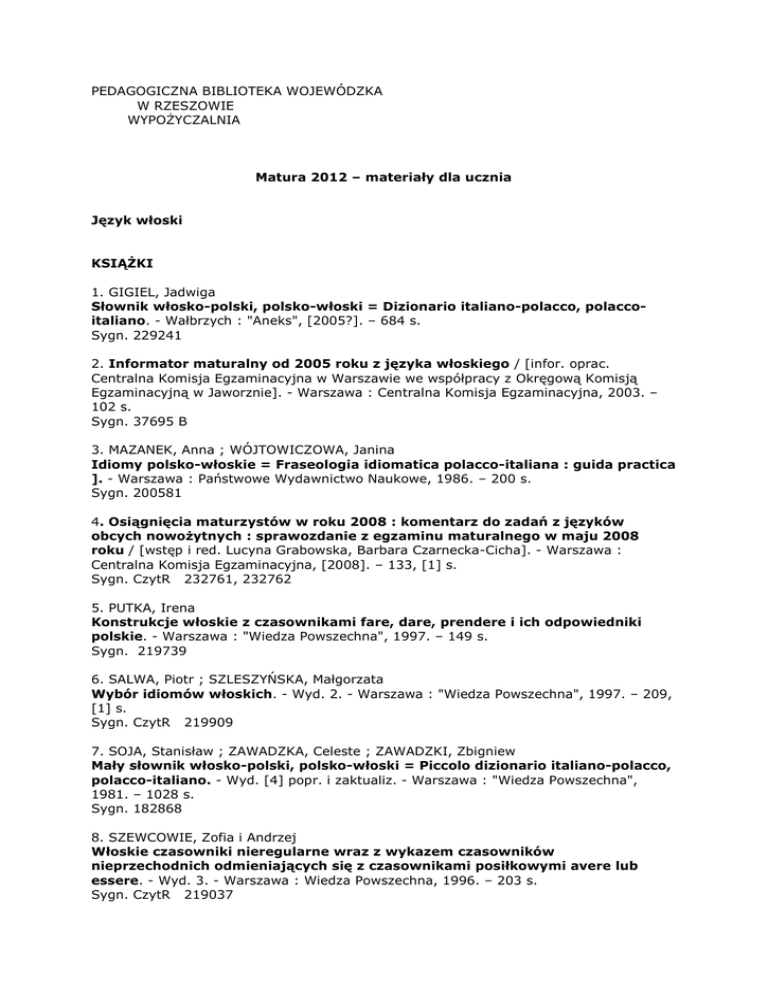 PEDAGOGICZNA BIBLIOTEKA WOJEWÓDZKA W RZESZOWIE WYPOŻYCZALNIA Matura 2012 – materiały dla ucznia Język włoski KSIĄŻKI 1. GIGIEL, Jadwiga Słownik włosko-polski, polsko-włoski = Dizionario italiano-polacco, polaccoitaliano. - Wałbrzych : "Aneks", [2005?]. – 684 s. Sygn. 229241 2. Informator maturalny od 2005 roku z języka włoskiego / [infor. oprac. Centralna Komisja Egzaminacyjna w Warszawie we współpracy z Okręgową Komisją Egzaminacyjną w Jaworznie]. - Warszawa : Centralna Komisja Egzaminacyjna, 2003. – 102 s. Sygn. 37695 B 3. MAZANEK, Anna ; WÓJTOWICZOWA, Janina Idiomy polsko-włoskie = Fraseologia idiomatica polacco-italiana : guida practica ]. - Warszawa : Państwowe Wydawnictwo Naukowe, 1986. – 200 s. Sygn. 200581 4. Osiągnięcia maturzystów w roku 2008 : komentarz do zadań z języków obcych nowożytnych : sprawozdanie z egzaminu maturalnego w maju 2008 roku / [wstęp i red. Lucyna Grabowska, Barbara Czarnecka-Cicha]. - Warszawa : Centralna Komisja Egzaminacyjna, [2008]. – 133, [1] s. Sygn. CzytR 232761, 232762 5. PUTKA, Irena Konstrukcje włoskie z czasownikami fare, dare, prendere i ich odpowiedniki polskie. - Warszawa : "Wiedza Powszechna", 1997. – 149 s. Sygn. 219739 6. SALWA, Piotr ; SZLESZYŃSKA, Małgorzata Wybór idiomów włoskich. - Wyd. 2. - Warszawa : "Wiedza Powszechna", 1997. – 209, [1] s. Sygn. CzytR 219909 7. SOJA, Stanisław ; ZAWADZKA, Celeste ; ZAWADZKI, Zbigniew Mały słownik włosko-polski, polsko-włoski = Piccolo dizionario italiano-polacco, polacco-italiano. - Wyd. [4] popr. i zaktualiz. - Warszawa : "Wiedza Powszechna", 1981. – 1028 s. Sygn. 182868 8. SZEWCOWIE, Zofia i Andrzej Włoskie czasowniki nieregularne wraz z wykazem czasowników nieprzechodnich odmieniających się z czasownikami posiłkowymi avere lub essere. - Wyd. 3. - Warszawa : Wiedza Powszechna, 1996. – 203 s. Sygn. CzytR 219037 9. ZAWADZKA, Daniela Gramatyka języka włoskiego . - Wyd. 2. - Warszawa : Wydawnictwo Szkolne PWN, 1998. – 421 s. Sygn. 221131 10. ZAWADZKA, Daniela Język włoski dla Polaków [Druk towarzyszący]. [T. 1 cz. 1], Dialogi i ćwiczenia . - Warszawa : Państwowe Wydawnictwo Naukowe, 1991. – 468 s. Sygn. 213890 11.ZAWADZKA, Daniela Język włoski dla Polaków. [T. 1 cz. 2], Komentarz gramatyczny . - Wyd. 3. Warszawa : Wydawnictwo Naukowe PWN, 1993. - 287, [1] s. Sygn. 215421, 215424, AudRz 243 12. ZAWADZKA, Daniela Język włoski dla Polaków [Druk towarzyszący]. [T. 1 cz. 3], Tłumaczenia tekstów i klucz do ćwiczeń . - Warszawa : Państwowe Wydawnictwo Naukowe, 1991. – 230 s. Sygn. 213891 ARTYKUŁY 13. JAMROZIK, Elżbieta Włoskie egzaminy certyfikacyjne - CILS, CELI, CIC // Języki Obce w Szkole. 2005, nr 6, s. 136-138 Dokumenty dźwiękowe 14. ZAWADZKA, Daniela Język włoski dla Polaków [Dokument dźwiękowy] : dialogi : teksty. - Warszawa : "Wifon", 1993. Sygn. AudRz 2119 Rzeszów, 15.10.2011 oprac. Jolanta Nizicka na podstawie zbiorów PBW