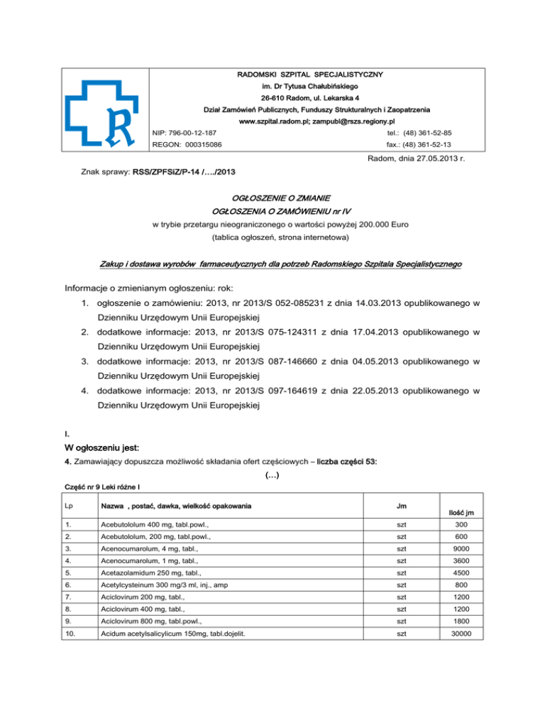 RADOMSKI SZPITAL SPECJALISTYCZNY im. Dr Tytusa Chałubińskiego 26-610 Radom, ul. Lekarska 4 Dział Zamówień Publicznych, Funduszy Strukturalnych i Zaopatrzenia www.szpital.radom.pl; [email protected] NIP: 796-00-12-187 tel.: (48) 361-52-85 REGON: 000315086 fax.: (48) 361-52-13 Radom, dnia 27.05.2013 r. Znak sprawy: RSS/ZPFSiZ/P-14 /…./2013 OGŁOSZENIE O ZMIANIE OGŁOSZENIA O ZAMÓWIENIU nr IV w trybie przetargu nieograniczonego o wartości powyżej 200.000 Euro (tablica ogłoszeń, strona internetowa) Zakup i dostawa wyrobów farmaceutycznych dla potrzeb Radomskiego Szpitala Specjalistycznego Informacje o zmienianym ogłoszeniu: rok: 1. ogłoszenie o zamówieniu: 2013, nr 2013/S 052-085231 z dnia 14.03.2013 opublikowanego w Dzienniku Urzędowym Unii Europejskiej 2. dodatkowe informacje: 2013, nr 2013/S 075-124311 z dnia 17.04.2013 opublikowanego w Dzienniku Urzędowym Unii Europejskiej 3. dodatkowe informacje: 2013, nr 2013/S 087-146660 z dnia 04.05.2013 opublikowanego w Dzienniku Urzędowym Unii Europejskiej 4. dodatkowe informacje: 2013, nr 2013/S 097-164619 z dnia 22.05.2013 opublikowanego w Dzienniku Urzędowym Unii Europejskiej I. W ogłoszeniu jest: 4. Zamawiający dopuszcza możliwość składania ofert częściowych – liczba części 53: (…) Część nr 9 Leki różne I Lp Nazwa , postać, dawka, wielkość opakowania Jm 1. Acebutololum 400 mg, tabl.powl., szt 300 2. Acebutololum, 200 mg, tabl.powl., szt 600 3. Acenocumarolum, 4 mg, tabl., szt 9000 4. Acenocumarolum, 1 mg, tabl., szt 3600 5. Acetazolamidum 250 mg, tabl., szt 4500 6. Acetylcysteinum 300 mg/3 ml, inj., amp szt 800 7. Aciclovirum 200 mg, tabl., szt 1200 8. Aciclovirum 400 mg, tabl., szt 1200 9. Aciclovirum 800 mg, tabl.powl., szt 1800 10. Acidum acetylsalicylicum 150mg, tabl.dojelit. szt 30000 Ilość jm 11. Acidum acetylsalicylicum 75 mg, tabl.dojelit., szt 60000 12. Acidum acetylsalicylicum, 300 mg,tabl.rozp. szt 8000 13. Acidum ascorbicum 500 mg/5 ml, inj., amp szt 3000 14. Acidum ascorbicum 100 mg, tabl.powl., szt 500 15. Acidum ascorbicum 200 mg, tabl.powl., szt 500 16. Acidum boricum 3% a 200 g szt 400 17. Acidum folicum 5 mg, tabl. szt 3000 18. Acidum folicum 15 mg, tabl., szt 3000 19. Acidum tranexamicum 500 mg/5 ml, inj.doż., amp szt 1200 20. Acidum tranexamicum tabl. powl a 0,5 g szt 200 21. Acidum ursodeoxycholicum 250 mg, kaps.twarde, szt 1000 22. Acidum ursodeoxycholicum 250 mg, tabl., szt 6000 23. Acidum valproicum,Natrii valproas Chronosphere 1000,gran. sasz.o przedł.uwal, szt 150 24. Acidum valproicum;Natrii valproas 300mg,tabl.powl.o przedł.uwal, szt 4500 25. Acidum valproicum;Natrii valproas 500,gran,przed.uw, szt 150 26. Acidum valproicum;Natrii valproas 500mg,tabl.powl.przed.uw, szt 4500 27. Acidum valproicum;Natrii valproas 750,gran,przed.uw sasz szt 150 28. Acitretinum 10 mg, kaps., szt 500 29. Acitretinum 25 mg, kaps., szt 500 30. Aethylmorphinum Hydrochl.(Dionina),subst gram 5 31. Alax draż., szt 200 32. Albendazolum 200 mg, tabl.powl., szt 20 33. Albendazolum( 400 mg/20 ml), zaw.,doustna, ml 400 34. Alfacalcidolum 0,25 mcg, kaps., szt 1500 35. Alfacalcidolum 0,25 mcg, kaps.elast., szt 300 36. Alfacalcidolum 1 mcg, kaps., szt 500 37. Alprostadilum 20 mcg,inj.doż, amp(ss) szt 20 38. Alprostadilum 60 mcg,inj.doż.,imp., amp(ss) szt 100 39. Alprostadilum VR, 0,5 mg/1 ml, inj., 5 amp op 1 40. Alprostadilum VR, 0,5 mg/1 ml, inj.,1 amp op 5 41. Altacet, 1 g, tabl., szt 1440 42. Alteplasum 20, 20 mg, inj.,1 fiol (liof)+20 ml rozp szt 240 43. Alteplasum 50, 50 mg, inj.,1 fiol (liof)+50 ml rozp szt 60 44. Aluminii phosphas zaw.doust,250g szt 100 45. Alustin, płyn, 10 g szt 5 46. Ambroxoli hydrochloridum (15 mg/5 ml), syr., ml 14400 47. Ambroxoli hydrochloridum (30 mg/5 ml), syr., ml 4800 48. Ambroxoli hydrochloridum 15 mg/2 ml, inj., amp szt 12000 49. Amikacini sulfas Ophtalmicum 0.3%,krop.do oczu ml 2500 50. Amiodaroni hydrochloridum 200 mg,tabl.powl., szt 5400 51. Amitriptilini hydrochloridum 10 mg, tabl.powl., szt 1440 52. Amitriptilini hydrochloridum 25 mg, tabl.powl., szt 1440 53. Amphotericin B inj 0,05g x 1 fiol szt 10 54. Antazolinum 100 mg/2 ml, inj., amp szt 3600 55. Antytoks.jadu zmii, 500j.a., inj., 1 amp szt 10 56. Aqua pro injectione 10 ml,inj,pl, amp szt 120000 57. Aqua pro injectione 5 ml,inj,pl,amp szt 10000 58. Arcalen, maść, 30g g 1800 59. Argenti nitras 10mg/ml;0,5ml,kr.d/ocz,pipet szt 1200 60. Artemisol, płyn, do stos.na skórę, ml 2000 61. Atecortin, krople do oczu i uszu,zaw., ml 100 62. Atenololum 100 mg, tabl., szt 300 63. Atenololum 25 mg, tabl., szt 600 64. Atenololum 50 mg, tabl., szt 300 65. Atorvastatinum 20 mg, tabl.powl., szt 14400 66. Atorvastatinum 40 mg, tabl.powl., szt 7200 67. Atropinum 1%, krople, do oczu, ml 100 68. Atropinum sulfur. , 1 mg/1 ml, inj., amp szt 4800 69. Atropinum sulfur., 0,5 mg/1 ml, inj., amp szt 200 70. Azathioprinum 50 mg, tabl., szt 200 71. Baclofenum 10 mg, tabl., szt 5000 72. Baclofenum 25 mg, tabl., szt 15000 73. Bencyclani fumaras 100 mg, tabl., szt 14400 74. Benserazidum;Levodopum 125, 100mg+25mg, tabl.d/sp.zaw.doust, szt 6000 75. Benserazidum;Levodopum 250, 200mg+50mg, kaps., szt 6000 76. Benserazidum;Levodopum 62.5, 50mg+12,5mg, kaps., szt 6000 77. Benserazidum;Levodopum HBS, 100mg+25mg, kaps., szt 6000 78. Benzydamini hydrochloridum 500 mg, prosz., saszet. szt 3000 79. Beractantum 200 mg/8 ml, zaw.,dotch., 1 fiol szt 1 80. Betamethasoni natrii phosphas 4 mg/1 ml, inj., 1 amp szt 240 81. Biopulp, prosz., g 100 82. Bisacodylum 10 mg, czop.,doodbyt., szt 600 83. Bisacodylum 5 mg, tabl.dojelitowe, szt 600 84. Bisoprololi fumaras 2,5mg,tabl.powl, szt 3000 85. Bisoprololi fumaras 5mg,tabl.powl, szt 30000 86. Bisoprololi fumaras 10mg,tabl.powl, szt 6000 87. Bromhexini hydrochloridum (.Mite),(2 mg/5 ml), syr., ml 2400 88. Bromhexini hydrochloridum 8 mg, tabl., szt 3200 89. Bromhexini hydrochloridum o sm.miętowym,(4 mg/5 ml), syr., ml 7200 90. Bromocriptini mesilas 2,5 mg, tabl., szt 600 91. Budesonidum,(200mcg/d), aer,wzie