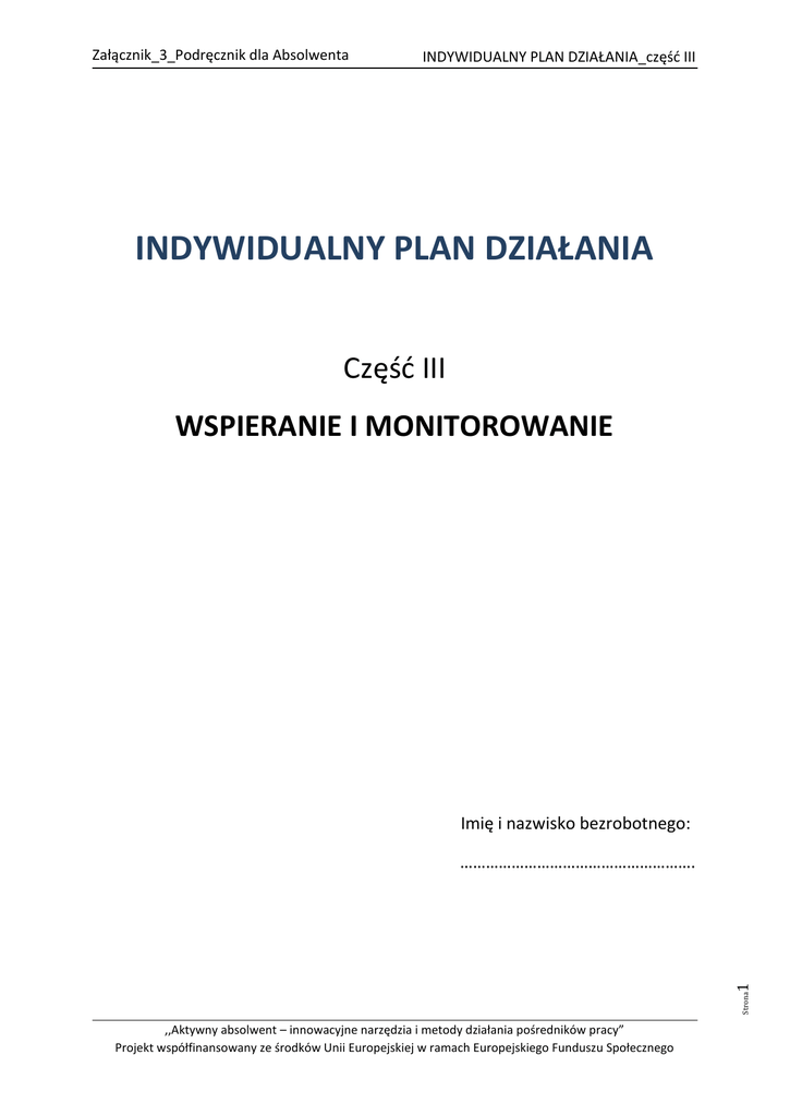 Załącznik_3_Podręcznik dla Absolwenta INDYWIDUALNY PLAN DZIAŁANIA_część III INDYWIDUALNY PLAN DZIAŁANIA Część III WSPIERANIE I MONITOROWANIE Imię i nazwisko bezrobotnego: Strona 1 ………………………………………………. ,,Aktywny absolwent – innowacyjne narzędzia i metody działania pośredników pracy” Projekt współfinansowany ze środków Unii Europejskiej w ramach Europejskiego Funduszu Społecznego INDYWIDUALNY PLAN DZIAŁANIA_część III 9. Rozmowy wspierające. 9.1. Ewidencja rozmów wspierających. lp. Data rozmowy Wnioski z rozmowy / ustalenia 10. Monitorowanie zatrudnienia – wywiady jakościowe. 10.1. Wyniki I wywiadu jakościowego (3 miesiące). Przyznane punkty (1-6) Zaangażowanie pracownika w wykonywanie powierzonych mu zadań Punktualność pracownika Współpraca pomiędzy pracownikiem a pracodawcą. Współpraca pomiędzy pracownikiem a innymi osobami Komunikatywność pracownika Odpowiedzialność pracownika Inne: Zdiagnozowane obszary luk kompetencyjnych / uwagi 2 1. 2 3 4 5 6 7 Zakres oceny Strona lp. ,,Aktywny absolwent – innowacyjne narzędzia i metody działania pośredników pracy” Projekt współfinansowany ze środków Unii Europejskiej w ramach Europejskiego Funduszu Społecznego INDYWIDUALNY PLAN DZIAŁANIA_część III 10.2. Rekomendacje. Plan naprawczy. lp. Rekomendacje. Sposób realizacji - plan naprawczy. 10.3. Wyniki II wywiadu jakościowego (6 miesięcy). lp. 1. 2 3 4 5 6 7 Zakres oceny Przyznane punkty (1-6) Zaangażowanie pracownika w wykonywanie powierzonych mu zadań Punktualność pracownika Współpraca pomiędzy pracownikiem a pracodawcą. Współpraca pomiędzy pracownikiem a innymi osobami Komunikatywność pracownika Odpowiedzialność pracownika Inne: Zdiagnozowane obszary luk kompetencyjnych / uwagi 10.4. Rekomendacje końcowe. Sposób realizacji - plan naprawczy. 3 Rekomendacje. Strona lp. ,,Aktywny absolwent – innowacyjne narzędzia i metody działania pośredników pracy” Projekt współfinansowany ze środków Unii Europejskiej w ramach Europejskiego Funduszu Społecznego
