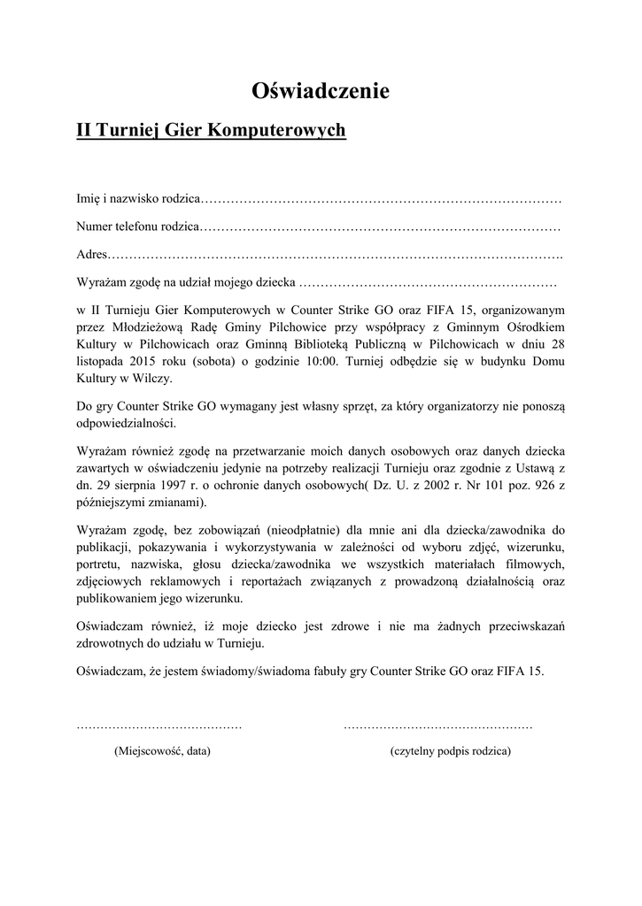 Oświadczenie II Turniej Gier Komputerowych Imię i nazwisko rodzica………………………………………………………………………… Numer telefonu rodzica………………………………………………………………………… Adres……………………………………………………………………………………………. Wyrażam zgodę na udział mojego dziecka …………………………………………………… w II Turnieju Gier Komputerowych w Counter Strike GO oraz FIFA 15, organizowanym przez Młodzieżową Radę Gminy Pilchowice przy współpracy z Gminnym Ośrodkiem Kultury w Pilchowicach oraz Gminną Biblioteką Publiczną w Pilchowicach w dniu 28 listopada 2015 roku (sobota) o godzinie 10:00. Turniej odbędzie się w budynku Domu Kultury w Wilczy. Do gry Counter Strike GO wymagany jest własny sprzęt, za który organizatorzy nie ponoszą odpowiedzialności. Wyrażam również zgodę na przetwarzanie moich danych osobowych oraz danych dziecka zawartych w oświadczeniu jedynie na potrzeby realizacji Turnieju oraz zgodnie z Ustawą z dn. 29 sierpnia 1997 r. o ochronie danych osobowych( Dz. U. z 2002 r. Nr 101 poz. 926 z późniejszymi zmianami). Wyrażam zgodę, bez zobowiązań (nieodpłatnie) dla mnie ani dla dziecka/zawodnika do publikacji, pokazywania i wykorzystywania w zależności od wyboru zdjęć, wizerunku, portretu, nazwiska, głosu dziecka/zawodnika we wszystkich materiałach filmowych, zdjęciowych reklamowych i reportażach związanych z prowadzoną działalnością oraz publikowaniem jego wizerunku. Oświadczam również, iż moje dziecko jest zdrowe i nie ma żadnych przeciwskazań zdrowotnych do udziału w Turnieju. Oświadczam, że jestem świadomy/świadoma fabuły gry Counter Strike GO oraz FIFA 15. …………………………………… (Miejscowość, data) ………………………………………… (czytelny podpis rodzica)