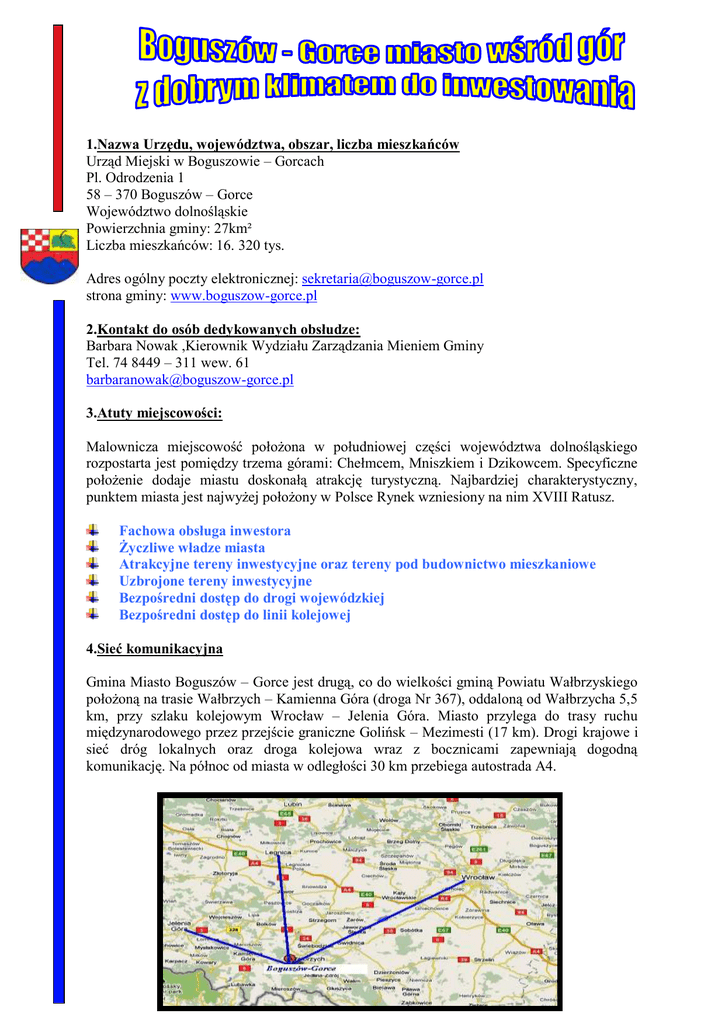 1.Nazwa Urzędu, województwa, obszar, liczba mieszkańców Urząd Miejski w Boguszowie – Gorcach Pl. Odrodzenia 1 58 – 370 Boguszów – Gorce Województwo dolnośląskie Powierzchnia gminy: 27km² Liczba mieszkańców: 16. 320 tys. Adres ogólny poczty elektronicznej: [email protected] strona gminy: www.boguszow-gorce.pl 2.Kontakt do osób dedykowanych obsłudze: Barbara Nowak ,Kierownik Wydziału Zarządzania Mieniem Gminy Tel. 74 8449 – 311 wew. 61 [email protected] 3.Atuty miejscowości: Malownicza miejscowość położona w południowej części województwa dolnośląskiego rozpostarta jest pomiędzy trzema górami: Chełmcem, Mniszkiem i Dzikowcem. Specyficzne położenie dodaje miastu doskonałą atrakcję turystyczną. Najbardziej charakterystyczny, punktem miasta jest najwyżej położony w Polsce Rynek wzniesiony na nim XVIII Ratusz. Fachowa obsługa inwestora Życzliwe władze miasta Atrakcyjne tereny inwestycyjne oraz tereny pod budownictwo mieszkaniowe Uzbrojone tereny inwestycyjne Bezpośredni dostęp do drogi wojewódzkiej Bezpośredni dostęp do linii kolejowej 4.Sieć komunikacyjna Gmina Miasto Boguszów – Gorce jest drugą, co do wielkości gminą Powiatu Wałbrzyskiego położoną na trasie Wałbrzych – Kamienna Góra (droga Nr 367), oddaloną od Wałbrzycha 5,5 km, przy szlaku kolejowym Wrocław – Jelenia Góra. Miasto przylega do trasy ruchu międzynarodowego przez przejście graniczne Golińsk – Mezimesti (17 km). Drogi krajowe i sieć dróg lokalnych oraz droga kolejowa wraz z bocznicami zapewniają dogodną komunikację. Na północ od miasta w odległości 30 km przebiega autostrada A4. 5.Ulgi w podatku od nieruchomości. W ramach zachęty inwestycyjnej Rada Miejska w Boguszowie – Gorcach ustaliła preferencyjne stawki dla podmiotów prowadzących działalność w zakresie hotelarstwa, obiektów noclegowych i turystycznych w wysokości 20% wartości stawek dla pozostałych podmiotów gospodarczych. Podatek od gruntów wynosi 15gr/m² (stawka normalna 77 gr/m²), podatek od budynków wynosi 3,55zł/m² (stawka podstawowa to 17,76zł/m²) 6.Największe inwestycje zrealizowane na terenie „Góry Dzikowiec”: Budowa kolei linowej na „Górze Dzikowem” Wykonanie wyciągu orczykowego narciarskiego o dłu. 400 m (do polowy stoku) Budowa układu na śnieżania stoku wraz ze zbiornikiem wody, 7.Planowane inwestycje na terenie „Góry Dzikowiec”: Tor do tubingu zimowego i letniego o dł.200m i szer. 3 m, Zimowy „kidpark”, Palce zabaw dla dzieci, Budowa budynku obsługi turystycznej kawiarnią, wypożyczalnią sprzętu narciarskiego, Budowa drewnianej wieży widokowej na szczycie „Góry Dzikowiec” o wys. 20 m, Park linowy, Budowa miejsc postojowych dla samochodów osobowych, Przebudowa drogi dojazdowej i dostosowanie jej do ruchu pieszego i rowerowego. OFERTA INWESTYCYJNA GMINY BOGUSZÓW – GORCE Oferta 1: SPRZEDAŻ TERENU POD ZABUDOWĘ HOTELOWĄ Markowy produkt turystyczny gminy Boguszów – Gorce pod „Górą Dzikowiec” to najlepsze miejsce do stworzenia profesjonalnej bazy rekreacyjno – sportowej oraz zaplecza noclegowego dla turystów i sportowców. Do sprzedania została przeznaczona nieruchomość z rozpoczętą budową hotelu w stanie surowym oznaczona w ewidencji gruntów działka Nr 25 o powierzchni 1,2042 ha. Nieruchomość położona jest 3 km od centrum miasta i drogi wojewódzkiej łączącej Wałbrzych z Jelenią Górą, a w niewielkiej odległości przebiega linia kolejowa. Oferta 2: NIERUCHOMOŚĆ POD DZIAŁALNOŚĆ GOSPODARCZĄ Nieruchomość niezabudowana położona przy ul. R. Traugutta w pobliżu drogi wojewódzkiej 367 łączącej Wałbrzych z Jelenią Górą. Jest to idealne miejsce pod inwestycje, nieruchomość składa się 9 działek (obręb Nr 2 Gorce) o łącznej powierzchni około 3,5000 ha.: Oferta 3: NIERUCHOMOŚĆ POD DZIAŁALNOŚĆ GOSPODARCZĄ Nieruchomość niezabudowana położona przy ul. Dworcowej, działka Nr 5/2 o powierzchni 1,1525ha, uzbrojona, przez jej teren przebiega sieć gazowa, elektroenergetyczna oraz wodociągowa, wykonane zostały przyłącza kanalizacji sanitarnej i deszczowej. Teren ma urządzone zjazdy z drogi i jest płaski, ale wymaga wyrównania. Obszar ten jest przeznaczony w palnie zagospodarowania przestrzennego pod działalność gospodarczą we wszystkich dziedzinach, z możliwością zabudowy obiektami kubaturowymi o wysokości do 10m. Oferta 4: NIERUCHOMOŚĆ ZABUDOWANA BUDYNKIEM MIESZKALNO – UŻYTKOWYM nieruchomość usytuowana na peryferiach miasta przy ul. J. Kilińskiego 14, w odległości ok. 1,5km od centrum miasta Nieruchomość położona jest na działce oznaczonej w ewidencji gruntów Nr 141/1 o pow. 3169m², jest to teren o pełnym uzbrojeniu. Budynek wolno stojący wybudowany w technologii tradycyjnej o zwartej bryle, przykryty dachem dwuspadowym, papowym. Dom z cegły pełnej dwukondygnacyjny częściowo podpiwniczony z poddaszem niemieszkalnym. Powierzchnia użytkowa 178,82m². Budynek zadbany, pokrycie dachowe nowe, przemurowane kominy, nowa stolarka, instalacje, podłogi – budynek po kapitalnym remoncie. Przy budynku znajdują się dwie przybudówki gospodarcze i stodoła. Oferta 5: NIERUCHOMOŚCI ZABUDOWANE BUDYNKAMI PRZY UL. KOLEJOWAEJ 33 (Szkoła) Przedmiotowa nieruchomość usytuowana jest bezpośrednio przy ul. Kolejowej 33 w odległości ok. 50m od skrzyżowania z ul. Dworcową i ul. Szybową, a od centrum miasta około 600m. Nieruchomość położona jest na działce oznaczonej w ewidencji gruntów Nr 432/1 o pow. 9082m², jest to teren o pełnym uzbrojeniu. Na obszarze nieruchomości jest asfaltowe boisko szkolne, utwardzony plac pomiędzy budynkami oraz teren rekreacyjny o charakterze parkowym z starodrzewem. OPIS NIERUCHOMOŚCI: BUDYNEK GŁÓWNY Powierzchnia piwnicy: 310m² Powierzchnia parteru: 368m² Powierzchnia I piętra: 345m² Powierzchnia II piętra: 355m² całkowita powierzchnia: 1.378m². BUDYNEK BOCZNY Powierzchnia parteru: 120,40m