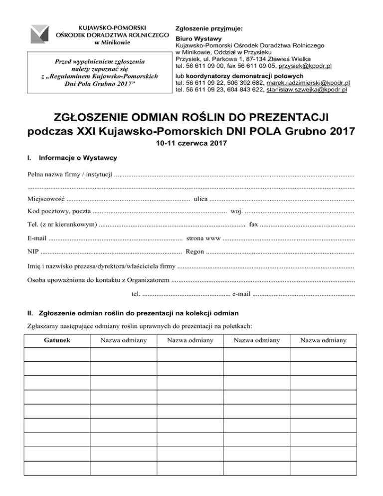 Zgłoszenie przyjmuje: Przed wypełnieniem zgłoszenia należy zapoznać się z „Regulaminem Kujawsko-Pomorskich Dni Pola Grubno 2017” Biuro Wystawy Kujawsko-Pomorski Ośrodek Doradztwa Rolniczego w Minikowie, Oddział w Przysieku Przysiek, ul. Parkowa 1, 87-134 Zławieś Wielka tel. 56 611 09 00, fax 56 611 09 05, [email protected] lub koordynatorzy demonstracji polowych tel. 56 611 09 22, 506 392 682, [email protected] tel. 56 611 09 23, 604 843 622, [email protected] ZGŁOSZENIE ODMIAN ROŚLIN DO PREZENTACJI podczas XXI Kujawsko-Pomorskich DNI POLA Grubno 2017 10-11 czerwca 2017 I. Informacje o Wystawcy Pełna nazwa firmy / instytucji ........................................................................................................................................ ......................................................................................................................................................................................... Miejscowość ...................................................................... ulica .................................................................................. Kod pocztowy, poczta ............................................................................ woj. .............................................................. Tel. (z nr kierunkowym) ................................................................................... fax ...................................................... E-mail ............................................................................ strona www ........................................................................... NIP ................................................................................ Regon .................................................................................... Imię i nazwisko prezesa/dyrektora/właściciela firmy .................................................................................................... Osoba upoważniona do kontaktu z Organizatorem ........................................................................................................ tel. .................................................. e-mail .......................................................... II. Zgłoszenie odmian roślin do prezentacji na kolekcji odmian Zgłaszamy następujące odmiany roślin uprawnych do prezentacji na poletkach: Gatunek Nazwa odmiany Nazwa odmiany Nazwa odmiany Nazwa odmiany – razem odmiany ozime liczba ............ x 190 zł – razem odmiany jare liczba ............ x 150 zł – udział w seminarium polowym IX 2017 (dotyczy odmian kukurydzy) liczba ............ x 40 zł Zobowiązujemy się dostarczyć na własny koszt zaprawione nasiona ww. odmian na adres Biura Wystawy, w następujących terminach: odmiany ozime rzepak – do 22 sierpnia 2016 roku pozostałe gatunki ozime – do 26 września 2016 roku odmiany jare (poza kukurydzą) – do 20 marca 2017 roku kukurydza – do 17 kwietnia 2017 roku III. Zamówienie powierzchni wystawowej i usług dodatkowych 1. Powierzchnia wystawowa (na terenie kolekcji odmian) – bezpłatnie, zgodnie z pkt IV.6 Regulaminu 2. Obowiązkowy wpis do „Informatora Dni Pola” 50 zł Poniżej podać treść wpisu lub przesłać osobno, zgodnie z punktem VIII.1 „Regulaminu” (kontakt: [email protected], tel. 56 611 09 33). 50 3. Reklama w „Informatorze Dni Pola” Kontakt w sprawie ustaleń dotyczących reklamy: [email protected], tel. 56 611 09 33. – pełen kolor, 1 strona B5 liczba ............ x 400 zł – pełen kolor, 1/2 strony B5 liczba ............ x 200 zł – czarna-biała, 1 strona B5 liczba ............ x 200 zł – czarna-biała, 1/2 strony B5 liczba ............ x 100 zł 4. Dodatkowa ochrona stoiska jesteśmy zainteresowani indywidualną ochroną stoiska w ramach odrębnej umowy z Agencją Ochrony (zakreślić kółkiem) tak nie ____________________________ razem netto, zł VAT 23%, zł OGÓŁEM brutto, zł Podpisując niniejsze „Zgłoszenie” akceptujemy jako obowiązujące nas: „Regulamin Kujawsko-Pomorskich Dni Pola” (dostępny m.in. na www.kpodr.pl) oraz przepisy techniczne i bhp. Upoważniamy do wystawienia faktury VAT za udział w Kujawsko-Pomorskich Dniach Pola Grubno 2017 bez naszego podpisu. Bez pieczęci i podpisu zgłoszenie jest nieważne. .................................................... miejscowość, data .................................................... podpis osoby upoważnionej pieczęć firmy