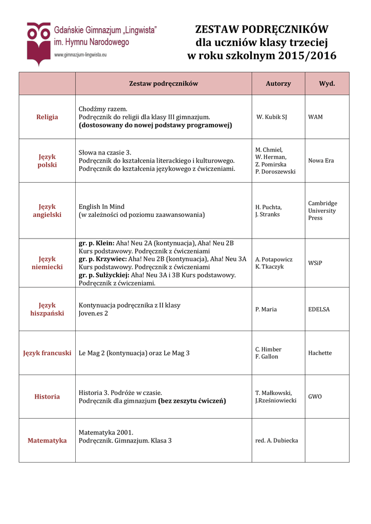 ZESTAW PODRĘCZNIKÓW dla uczniów klasy trzeciej w roku szkolnym 2015/2016 Zestaw podręczników Autorzy Wyd. Religia Chodźmy razem. Podręcznik do religii dla klasy III gimnazjum. (dostosowany do nowej podstawy programowej) W. Kubik SJ WAM Język polski Słowa na czasie 3. Podręcznik do kształcenia literackiego i kulturowego. Podręcznik do kształcenia językowego z ćwiczeniami. M. Chmiel, W. Herman, Z. Pomirska P. Doroszewski Nowa Era Język angielski English In Mind (w zależności od poziomu zaawansowania) H. Puchta, J. Stranks Cambridge University Press Język niemiecki gr. p. Klein: Aha! Neu 2A (kontynuacja), Aha! Neu 2B Kurs podstawowy. Podręcznik z ćwiczeniami gr. p. Krzywiec: Aha! Neu 2B (kontynuacja), Aha! Neu 3A Kurs podstawowy. Podręcznik z ćwiczeniami gr. p. Sulżyckiej: Aha! Neu 3A i 3B Kurs podstawowy. Podręcznik z ćwiczeniami. A. Potapowicz K. Tkaczyk WSiP Język hiszpański Kontynuacja podręcznika z II klasy Joven.es 2 P. Maria EDELSA Le Mag 2 (kontynuacja) oraz Le Mag 3 C. Himber F. Gallon Hachette Historia 3. Podróże w czasie. Podręcznik dla gimnazjum (bez zeszytu ćwiczeń) T. Małkowski, J.Rześniowiecki GWO Matematyka 2001. Podręcznik. Gimnazjum. Klasa 3 red. A. Dubiecka Język francuski Historia Matematyka Zestaw podręczników Autorzy Wyd. Matematyka Egzamin Gimnazjalny „Przygotuj się i zdaj” Wydanie II rozszerzone (niebieska okładka) Uczniowie zakupili tę publikację jeszcze w czerwcu S. Kalisz J. Kulbicki M. Rudzki NOWIK Biologia Świat biologii 3. Podręcznik i zeszyt ćwiczeń. M. Kłyś, A. Kornaś M. Ryszkiewicz Nowa Era Geografia Puls Ziemi 3 Podręcznik i zeszyt ćwiczeń. R. Malarz Nowa Era Fizyka Bliżej fizyki Podręcznik. Gimnazjum. Część 3. S. Ziemnicki, K. Puchowska WSiP Chemia Ciekawa chemia. Część 3. Podręcznik i zeszyt ćwiczeń. H. Gulińska J. Smolińska WSiP Żyję i działam bezpiecznie. Edukacja dla bezpieczeństwa. Podręcznik z ćwiczeniami. J. Słoma Nowa Era Edukacja dla bezpieczeństwa