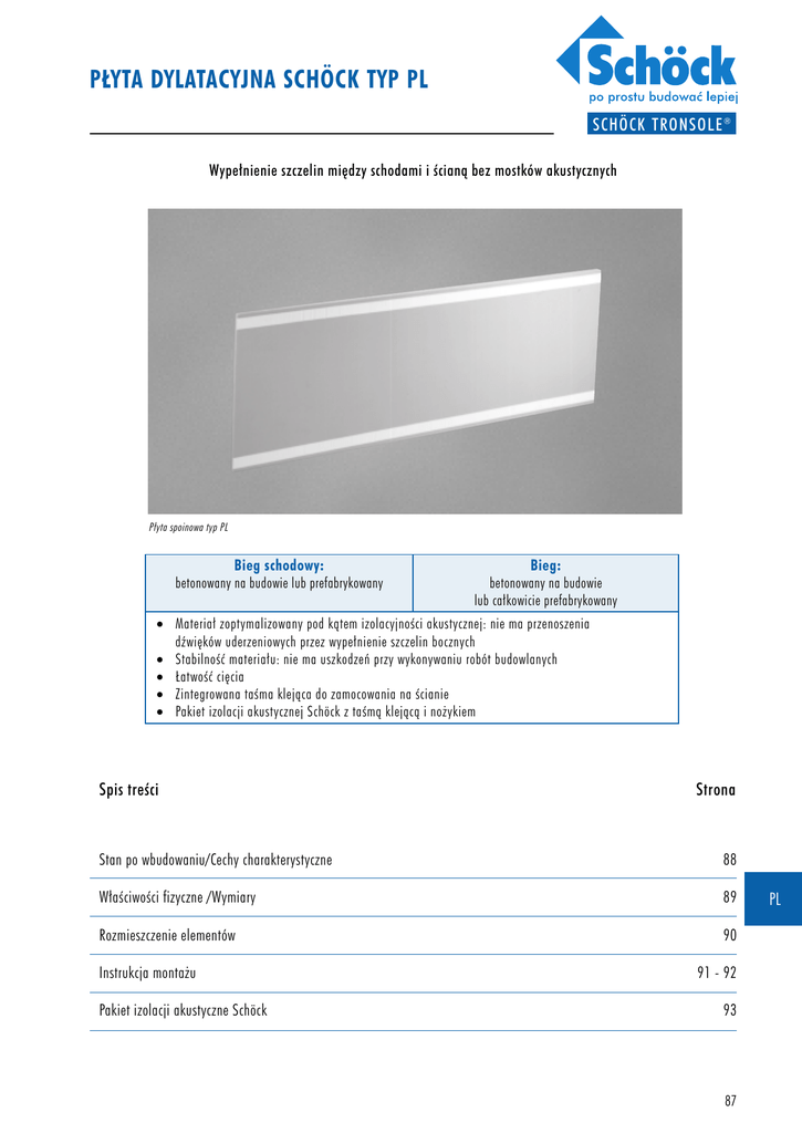 P¸YTA DYLATACYJNA SCHÖCK TYP PL SCHÖCK TRONSOLE ® Wype∏nienie szczelin mi´dzy schodami i Êcianà bez mostków akustycznych P∏yta spoinowa typ PL Bieg schodowy: betonowany na budowie lub prefabrykowany Bieg: betonowany na budowie lub ca∏kowicie prefabrykowany • Materia∏ zoptymalizowany pod kàtem izolacyjnoÊci akustycznej: nie ma przenoszenia dêwi´ków uderzeniowych przez wype∏nienie szczelin bocznych • StabilnoÊç materia∏u: nie ma uszkodzeƒ przy wykonywaniu robót budowlanych • ¸atwoÊç ci´cia • Zintegrowana taÊma klejàca do zamocowania na Êcianie • Pakiet izolacji akustycznej Schöck z taÊmà klejàcà i no˝ykiem Spis treÊci Strona Stan po wbudowaniu/Cechy charakterystyczne 88 W∏aÊciwoÊci fizyczne /Wymiary 89 Rozmieszczenie elementów 90 Instrukcja monta˝u Pakiet izolacji akustyczne Schöck 91 - 92 93 87 PL P¸YTA DYLATACYJNA SCHÖCK TYP PL Stan po wbudowaniu / Cechy charakterystyczne tynk p∏ytka coko∏owa Êciana klatki schodowej wype∏nienie zaprawa nawierzchnia p∏yta dylatacyjna Schöck typ PL spocznik/ bieg wype∏nienie elastyczne (tynk nie mo˝e si´ stykaç ze spocznikiem ani biegiem schodowym) • P∏yta dylatacyjna Schöck typ PL - stan po wbudowaniu • taÊma klejàca do ∏atwego i pewnego zamocowania p∏yty dylatacyjnej na Êcianie klatki schodowej ∏atwa do przyci´cia mi´kka pianka z polietylenu (PE) PL T∏umienie dêwi´ków uderzeniowych optymalne t∏umienie dêwi´ków uderzeniowwych dzi´ki unikni´ciu mostków akustycznych w obr´bie szczelin Ochrona przeciwpo˝arowa zakwalifikowana do klasy materia∏ów budowlanych B 2 wed∏ug DIN 4102 paski uszczelniajàce mo˝na wyciàgnàç po rozdeskowaniu (czysty przebieg szczeliny dolnej) spe∏nia wymagania dla materia∏ów budowlanych klasy B2 wed∏ug DIN 4102 gwarantowany brak FCKW, HFCKW, HFKW materia∏ zoptymalizowany akustycznie: nie ma przenoszenia dêwi´ków uderzeniowych w obr´bie szczelin Cechy charakterystyczne p∏yty dylatacyjnej Schöck typ PL 88 P¸YTA DYLATACYJNA SCHÖCK TYP PL W∏aÊciwoÊci fizyczne/Wymiary SCHÖCK TRONSOLE ® SztywnoÊç dynamiczna wed∏ug EN 29052-1 90 MN/m3 Wyd∏u˝enie przy zerwaniu wed∏ug ISO 1926 Ci´˝ar obj´toÊciowy wed∏ug EN ISO 845 28 kg/m3 Wch∏anianie wody po 7 dniach 100 % < 1 % obj. OdpornoÊç na zgniatanie przy zgnieceniu 10% wed∏ug ISO 844 10 % Temperatura u˝ytkowania – 80° C do +100° C Odkszta∏cenie pozostajàce 24 h po zdj´ciu obcià˝enia 10 % Tolerancja Êrodowiska naturalnego wed∏ug 94/62/WE spe∏nia taÊma klejàca 355 perforacja 15 15 pasek uszczelniajàcy perforacja 1000 perforacja taÊma klejàca dwustronna taÊma klejàca 355 355 Widok od strony schodów perforacja 1000 15 pasek uszczelniajàcy Przekrój: Schöck Tronsole typ PL ® Widok od strony Êciany PL 89 P¸YTA DYLATACYJNA SCHÖCK TYP PL Rozmieszczenie elementów spocznik g∏ówny spocznik poÊredni po∏àczenie za pomocà elementów Schöck Tronsole® po∏àczenie za pomocà elementów Schöck Tronsole® oddzielenie za pomocà p∏yt dylatacyjnych Schöck typ PL Rozmieszczenie p∏yt dylatacyjnych Schöck typ PL przy wyt∏umieniu przenoszenia dêwi´ków uderzeniowych z biegu schodowego (Schöck Tronsole ® typ T i typ F) p∏yta dylatacyjna Schöck typ PL po∏àczenie za pomocà elementów Schöck Tronsole spocznik poÊredni spocznik g∏ówny PL po∏àczenie za pomocà elementów Schöck Tronsole oddzielenie za pomocà p∏yt dylatacyjnych Schöck typ PL (na obwodzie) Rozmieszczenie p∏yt dylatacyjnych Schöck typ PL przy wyt∏umieniu przenoszenia dêwi´ków uderzeniowych ze spocznika schodowego (Schöck Tronsole ® typ AZT, typ AZ, typ ZF, typ V) 90 P¸YTA DYLATACYJNA SCHÖCK TYP PL Instrukcja monta˝u w stanie surowym 1 W stanie surowym Wbudowanie w wersji betonowanej na budowie: u Wykonaç deskowanie schodów. u P∏yty dylatacyjne Schöck typ PL przyciàç zgodnie z geometrià biegu wzgl´dnie spocznika schodów. u Przy u˝yciu taÊmy klejàcej przykleiç p∏yty dylatacyjne Schöck typ PL na Êcianie klatki schodowej, zwracajàc przy tym uwag´ na Êcis∏e przyleganie do deski deskowania. u Szczelnie zakleiç taÊmà klejàcà wszystkie miejsca styków czo∏owych i przejÊcia (rys. 1a). u Za pomocà listwy o przekroju trójkàtnym ustaliç dó∏ p∏yty dylatacyjnej. (Listwa trójkàtna s∏u˝y jednoczeÊnie do sfazowania kraw´dzi schodów przy Êcianie.) Sfazowanie u∏atwia póêniej tak˝e po∏àczenie bez mostków akustycznych spodu schodów z tynkiem. u U∏o˝yç zbrojenie wykonane na budowie i odeskowaç stopnie schodów (rys. 1b). u Zabetonowaç schody. u Rozdeskowaç schody. u Obciàç p∏yty dylatacyjne, pozostawiajàc wystajàce ok. 30 mm (pos∏u˝à póêniej jako ograniczenie powierzchni tynku). Wbudowanie w wersji prefabrykowanej: u P∏yty dylatacyjne Schöck typ PL przyciàç na budowie zgodnie z geometrià biegu wzgl´dnie spocznika schodów. u Przy u˝yciu taÊmy klejàcej przykleiç p∏yty dylatacyjne Schöck typ PL na prefabrykacie. Do∏em p∏yty dylatacyjne powinny si´ licowaç z kraw´dzià prefabrykatu (rys. 1c). u Szczelnie zakleiç taÊmà klejàcà wszystkie styki i przejÊcia. u Wstawiç prefabrykat (rys. 1d). u Obciàç p∏yty dylatacyjne, pozostawiajàc wystajàce ok. 30 mm. SCHÖCK TRONSOLE ® 1a 1b 1c 1d PL Uwaga: Wszystkie styki czo∏owe trzeba szczelnie zakleiç taÊmà klejàcà dla unikni´cia mostków akustycznych. Ze wzgl´dów akustycznych p∏yt dylatacyjnych Schöck nie wolno uszkodziç. 91 P¸YTA DYLATACYJNA SCHÖCK TYP PL Instrukcja monta˝u w robotach tynkarskich/uk∏adaniu p∏ytek 2 W robotach tynkarskich 2 u Przed otynkowaniem Êciany klatki schodowej obciàç p∏yty dylatacyjne Schöck zgodnie z przebiegiem stopni w odleg∏oÊci ok. 80 mm (wysokoÊç wyk∏adziny + 20 mm) od ich powierzchni. Wystajàce górà i do∏em kraw´dzie p∏yt dylatacyjnych wykorzystaç jako ograniczenie powierzchni tynku. Uwaga: Tynk Êciany nie mo˝e si´ w ˝adn