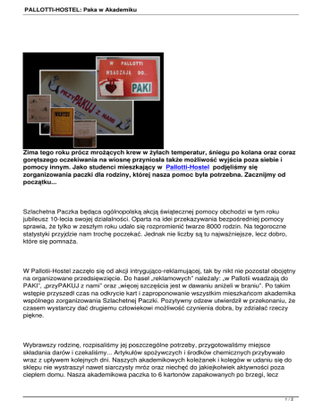 PALLOTTI-HOSTEL: Paka w Akademiku Zima tego roku prócz mrożących krew w żyłach temperatur, śniegu po kolana oraz coraz gorętszego oczekiwania na wiosnę przyniosła także możliwość wyjścia poza siebie i pomocy innym. Jako studenci mieszkający w Pallotti-Hostel podjęliśmy się zorganizowania paczki dla rodziny, której nasza pomoc była potrzebna. Zacznijmy od początku... Szlachetna Paczka będąca ogólnopolską akcją świątecznej pomocy obchodzi w tym roku jubileusz 10-lecia swojej działalności. Oparta na idei przekazywania bezpośredniej pomocy sprawia, że tylko w zeszłym roku udało się rozpromienić twarze 8000 rodzin. Na tegoroczne statystyki przyjdzie nam trochę poczekać. Jednak nie liczby są tu najważniejsze, lecz dobro, które się pomnaża. W Pallotii-Hostel zaczęło się od akcji intrygująco-reklamującej, tak by nikt nie pozostał obojętny na organizowane przedsięwzięcie. Do haseł „reklamowych” należały: „w Pallotii wsadzają do PAKI”, „przyPAKUJ z nami” oraz „więcej szczęścia jest w dawaniu aniżeli w braniu”. Po takim wstępie przyszedł czas na odkrycie kart i zaproponowanie wszystkim mieszkańcom akademika wspólnego zorganizowania Szlachetnej Paczki. Pozytywny odzew utwierdził w przekonaniu, że czasem wystarczy dać drugiemu człowiekowi możliwość czynienia dobra, by zdziałać rzeczy piękne. Wybrawszy rodzinę, rozpisaliśmy jej poszczególne potrzeby, przygotowaliśmy miejsce składania darów i czekaliśmy... Artykułów spożywczych i środków chemicznych przybywało wraz z upływem kolejnych dni. Naszych akademikowych koleżanek i kolegów w udaniu się do sklepu nie wystraszył nawet siarczysty mróz oraz niechęć do jakiejkolwiek aktywności poza ciepłem domu. Nasza akademikowa paczka to 6 kartonów zapakowanych po brzegi, lecz 1/2 PALLOTTI-HOSTEL: Paka w Akademiku przede wszystkim dobro wspólnie wyświadczone drugiemu człowiekowi. Szczególnym darem okazał się być zakup łóżka – umożliwiły to władze akademika, które od grudniowego czynszu każdego z nas pozwoliły wziąć na ten szczytny cel pewną sumę pieniędzy. Ten gest sprawił, że udział w przygotowywaniu paczki mieliśmy wszyscy. Pośród darów nie zabrakło również prezentów niespodzianek, które wszyscy członkowie „naszej” rodziny otworzą w wigilijny wieczór… Nasze przedsięwzięcie zostało sfinalizowane 12 grudnia 2010 roku, kiedy to odwieźliśmy naszą paczkę do magazynu. Na miejscu prócz domowej atmosfery i pachnących pierniczków można było przekonać się, że wraz z nami naprawdę wiele osób otworzyło tej zimy swoje serca (i portfeleJ). Miło było otrzymać od wolontariusza informację o uśmiechniętych twarzach obdarowanej przez nas rodziny. Czas spotkania opłatkowego w naszym akademiku dał okazję do podsumowania akcji. Na znak, że dobro pomnaża się, gdy się je dzieli, podzieliliśmy się opłatkiem otrzymanym od Stowarzyszenia WIOSNA. Trwając w pewności, że „to nie rzeczy pomagają, ale ludzie” czekamy na przyszły rok. Ilona Matyka i Małgorzata Stoff Studenci z Pallotii-Hostel 2/2