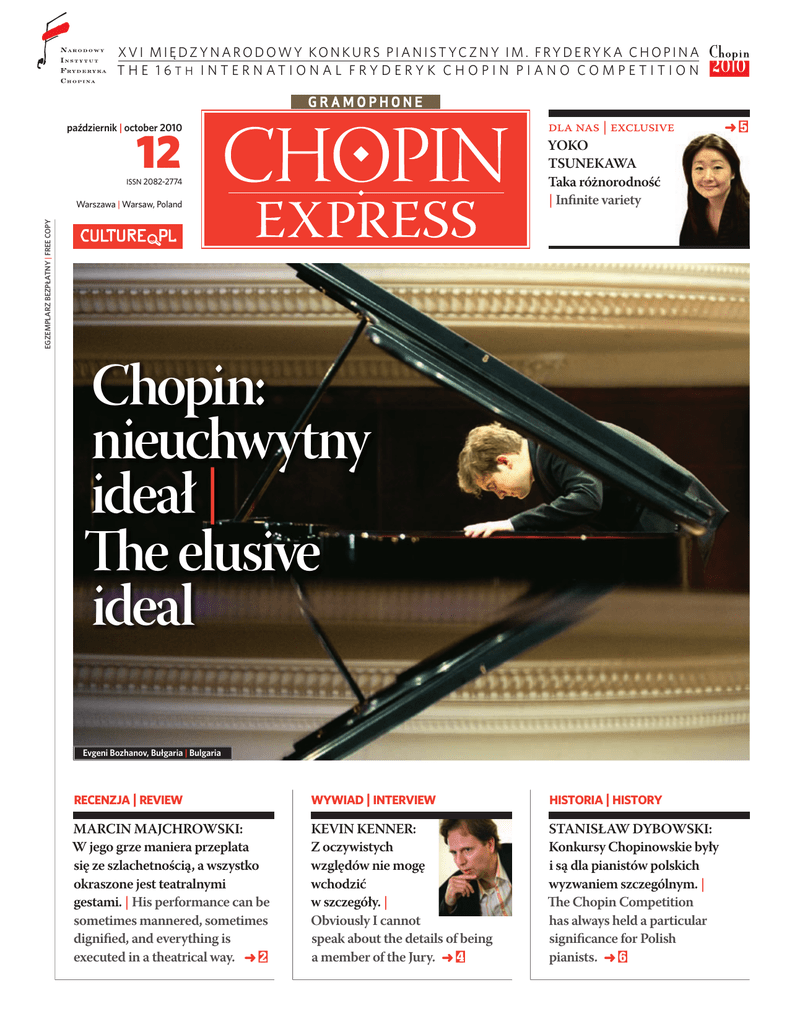 X V I M I Ę D Z Y N A R O D O W Y KO N K U R S P I A N I S T YC Z N Y I M . F R Y D E R Y K A C H O P I N A T H E 1 6 T H I N T E R N AT I O N A L F R Y D E R Y K C H O P I N P I A N O C O M P E T I T I O N | YOKO TSUNEKAWA Taka różnorodność | Infinite variety 12 październik | october 2010 ISSN 2082-2774 EGZEMPLARZ BEZPŁATNY | FREE COPY Warszawa | Warsaw, Poland Chopin: nieuchwytny ideał | The elusive ideal Evgeni Bozhanov, Bułgaria | Bulgaria RECENZJA | REVIEW WYWIAD | INTERVIEW HISTORIA | HISTORY MARCIN MAJCHROWSKI: W jego grze maniera przeplata się ze szlachetnością, a wszystko okraszone jest teatralnymi gestami. | His performance can be sometimes mannered, sometimes dignified, and everything is executed in a theatrical way. > 2 KEVIN KENNER: Z oczywistych względów nie mogę wchodzić w szczegóły. | Obviously I cannot speak about the details of being a member of the Jury. > 4 STANISŁAW DYBOWSKI: Konkursy Chopinowskie były i są dla pianistów polskich wyzwaniem szczególnym. | The Chopin Competition has always held a particular significance for Polish pianists. > 6 >5 chopin express recenzje | reviews II etap – kolejność uczestników | 2nd stage auditions order Wtorek, 12 października | Tuesday, 12 october ČČ 10.00, Nikolay Khozyainov, Rosja/Russia ČČ 10.50, Yuri Watanabe, Japonia/Japan ČČ 11.40 – 12.10 PRZERWA | INTERMISSION ČČ 12.10, Mei-Ting Sun, Stany Zjednoczone/USA ff 13.00, Jacek Kortus, Polska/Poland ČČ 17.00, Ilya Rashkovskiy, Rosja/Russia ČČ 17.50, Junna Iwasaki, Japonia/Japan ČČ 18.40 – 19.10 PRZERWA | INTERMISSION ČČ 19.10, Yulianna Avdeeva , Rosja/Russia ČČ 20.00, Marcin Koziak, Polska/Poland Środa, 13 października | Wednesday, 13 october ff 10.00, Marek Bracha, Polska/Poland ČČ 10.50, Ingolf Wunder, Austria/Austria ČČ 11.40 – 12.10 PRZERWA | INTERMISSION ff 12.10, Lukas Geniušas, Rosja-Litwa/Russia-Lithuania ČČ 13.00, François Dumont, Francja/France ČČ 17.00, Xin Tong, Chiny/China ČČ 17.50, Andrew Tyson, Stany Zjednoczone/USA ČČ 18.40 – 19.10 PRZERWA | INTERMISSION ČČ 19.10, Denis Zhdanov, Ukraina/Ukraine ČČ 20.00, Marianna Prjevalskaya, Hiszpania/Spain Środa, 13 października | Wednesday, 13 October OGŁOSZENIE WYNIKÓW II ETAPU | ANNOUNCEMENT OF THE 2nd STAGE RESULTS Yuma Osaki, Japonia | Japan Wirtuozeria gestu | Theatrical gestures C ztery różne pianistyczne światy – oto panorama przedpołudniowych przesłuchań w poniedziałek. Poszukujący barw wrażliwy pianista Paweł Wakarecy, poważna i obiektywna, najdojrzalsza z wystepujących Yuma Osaki, młodziutka, popisująca się wirtuozerią Wai-Ching Rachel Cheung, wreszcie Evgeni Bozhanov, którego występy budzą największe emocje. Nie można mu odmówić świetnego warsztatu pianistycznego; młody Bułgar nie ma też najmniejszych trudności z przekazaniem wizji interpretacyjnej, dodajmy – bardzo osobistej. Tyle tylko, że na pierwszym planie jest on sam, a gdzieś (dość daleko w tle) litera tekstu Chopina. W jego grze maniera przeplata się ze szlachetnością, a wszystko okraszone jest bardzo teatralnymi gestami, które rzadko wynikają z treści muzyki, i w których spontaniczność nie wierzę. Dowód? Najbardziej interesująco Bozhanow wykonał mazurki – zaskakujące, że wtedy robił najmniej min i egzaltowanych gestów. Podsumowując – moja wizja muzyki Chopina jest skrajnie odmienna od wizji Evgenija Bozhanova. h F Bulgarian has no trouble communicating his vision, either – quite a personal one at that. Only, he’s alone in the foreground while Chopin’s notes reside somewhere in the distance. His performance can be sometimes mannered, sometimes dignified, and everything is executed in quite a theatrical way, with gestures not often derived from the music’s context – I have trouble believing in their spontaneity. The proof? Bozhanov’s most interesting playing was his interpretation of the Mazurkas – most surprising as he made fewer faces or gestures here than in any other performance. In conclusion – my musical vision of Chopin is diametrically opposite to the vision held by Evgeni Bozhanov. h — marcin majchrowski (polskie radio) h our different musical realms – this was the scope of Monday morning’s auditions. The sensitive, Paweł Wakarecy with his quest for tone colour, the serious and objective Yuma Osaki – the most mature pianist of all, the young Wai-Ching Rachel Cheung and her electrifying virtuosity, and finally, Evgeni Bozhanov, whose performances inspired an emotional response from the audience. Here, we cannot disregard the presence of a high level of proficiency, and the young mecenas roku chopinowskiego main sponsor of the chopin year 2 | XVI Międzynarodowy Konkurs Pianistyczny im. Fryderyka Chopina | dzień dwunasty | Evgeni Bozhanov, Bułgaria | Bulgaria Leonard Bernstein | By mieć wielkie osiągnięcia, trzeba dwóch rzeczy: planu i zbyt małej ilości czasu. | To achieve great things, two things are needed: a plan, and not quite enough time. 12 października 2010 r. chopin express Tylko Irene | Only Irene John Allison ediTor oF opera maGaZine, chieF mUsic criTic oF The sUndaY TeleGraph t Dla serca, do tańca | Heart and heel p aweł Wakarecy był pierwszym z Polaków, który zagrał w drugim etapie Konkursu i wprost oczarował publiczność swoimi mazurkami. Pisałem już o tym, że zagraniczni pianiści muszą mieć nie lada odwagę, by grać te utwory przed publicznością w Warszawie. Krytykowi też nie brakuje tupetu, jeśli odważył się komentować wykonania tych ulotnych tchnień polskiego ducha. Ale co zrobić, gdy właśnie mazurki znalazły się w centrum uwagi w poniedziałkowe przedpołudnie. Wakarecy w Mazurku g-moll op. odnalazł słodko-gorzką melancholię, w Mazurku C-dur – lekkość i zwinność, tym samym ukazując, które mazurki należy grać dla serca, a które do tańca. Subtelne uczucie, które Polacy określają słowem „żal”, było niestety całkiem ni