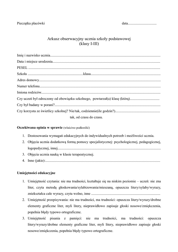 Pieczątka placówki data................................ Arkusz obserwacyjny ucznia szkoły podstawowej (klasy I-III) Imię i nazwisko ucznia........................................................................................................................... Data i miejsce urodzenia........................................................................................................................ PESEL ................................................................................................................................................... Szkoła ..............................................................klasa.............................................................................. Adres domowy........................................................................................................................................ Numer telefonu....................................................................................................................................... Imiona rodziców..................................................................................................................................... Czy uczeń był odroczony od obowiązku szkolnego, powtarzał(a) klasę (którą)................................. Czy był badany w porani?...................................................................................................................... Czy korzysta ze świetlicy szkolnej? Nie/tak, codziennie(ile godzin?).................................................. tak, od czasu do czasu. Oczekiwana opinia w sprawie (właściwe podkreślić) 1. Dostosowania wymagań edukacyjnych do indywidualnych potrzeb i możliwości ucznia. 2. Objęcia ucznia dodatkową formą pomocy specjalistycznej: psychologicznej, pedagogicznej, logopedycznej, innej................................................................................................................... 3. Objęcia ucznia nauką w klasie terapeutycznej. 4. Inne (jakie):................................................................................................................................ Umiejętności edukacyjne 1. Umiejętność czytania: nie ma trudności, kształtuje się na niskim poziomie – uczeń: nie zna liter, czyta metodą głoskowania/sylabizowania/mieszaną, opuszcza litery/sylaby/wyrazy, zniekształca całe wyrazy, czyta wolno, inne ............................................................................. 2. Umiejętność przepisywania: nie ma trudności, ma trudności: opuszcza litery/wyrazy/drobne elementy graficzne liter, myli litery, nieprawidłowo zapisuje głoski nosowe/zmiękczenia, popełnia błędy typowo ortograficzne. 3. Umiejętność pisania z pamięci: nie ma trudności, ma trudności: opuszcza litery/wyrazy/drobne elementy graficzne liter, myli litery, nieprawidłowo zapisuje głoski nosowe/zmiękczenia, popełnia błędy typowo ortograficzne. 4. Umiejętność pisania ze słuchu: nie ma trudności, ma trudności: opuszcza litery/wyrazy/drobne elementy graficzne liter, myli litery, nieprawidłowo zapisuje głoski nosowe/zmiękczenia, popełnia błędy typowo ortograficzne. 5. Strona graficzna pisma: nie budzi zastrzeżeń, jest obniżona, pismo nieczytelne, występują trudności z wyborem właściwej liniatury, z właściwym naciskiem/chwytem narzędzia do pisania, inne ......................................................................................................................... 6. Umiejętność liczenia: nie ma trudności, są trudności: uczeń liczy na konkretach, ma problemy z tabliczką mnożenia, nie rozumie zadań z treścią, inne ............................................................................................................................................ Zachowania ucznia obserwowane na codziennych zajęciach lekcyjnych (właściwe podkreślić) 1. Uczeń do szkoły przychodzi: przygotowany, nieprzygotowany – często, sporadycznie. 2. Jego wyposażenie w przybory szkole jest: wystarczające, budzi zastrzeżenia - nie ma własnych przyborów, często zapomina je przynieść z domu, często je gubi, nie dba o ich stan; niszczy je. 3. Podczas zajęć lekcyjnych uczeń: jest aktywny, bierny, wyraźnie unika niektórych czynności (jakich)........................................................................................................................................ 4. Często ma trudności ze skupieniem uwagi. 5. Często wyłącza się myślowo. 6. Na lekcji z reguły zajmuje się czymś innym (rozmawia, śmieje się, kręci, chodzi po klasie). 7. Ogryza paznokcie, ssie palec, miewa nerwowe tiki. 8. Wykazuje nagłe zmiany nastroju ( np. przejście od śmiechu do płaczu). 9. Poproszony do odpowiedzi zwykle: rumieni się, uporczywie milczy, mówi bardzo szybko, zacina się. 10. Na zwróconą uwagę zwykle reaguje: płaczem, złością wzrusza ramionami, jest obojętny. 11. Wykazuję: nadmierną energię, brak energii, obojętność wobec wszelkich działań. 12. Cechują go: wesołkowatość, przygnębienie, apatia. 13. Nigdy nie zwraca się do nauczyciela w żadnej sprawie. 14. Stale absorbuje nauczyciela swoimi sprawami. 15. Poleceniom nauczyciela: podporządkowuje się , podporządkowuje się tylko pozornie, wcale się nie podporządkowuje. 16. Demonstracyjnie łamie zakazy nauczyciela, zachowuje się prowokacyjnie. 17. Kłamie: od czasu do czasu, bardzo często. 18. Inne niepokojące objawy zachowania ucznia( jakie?) .............................................................. Zachowania ucznia obserwowane poza zajęciami lekcyjnymi (właściwe podkreślić) 1. Zdarza się, że wybucha gwałtowną złością bez istotnego powodu: często, od czasu do czasu, nigdy. 2. Bywa agresywny w stosunku do innych dzieci (np. bije, dokucza): często, od czasu do czasu, nigdy. 3. Celowo niszczy i psuje przedmioty: często, od czasu do czasu, nigdy. 4. Ma skłonności do przewodzenia innym dzieciom w sposób 