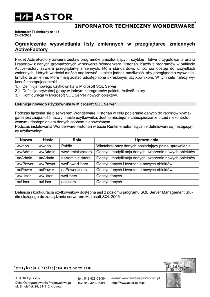 INFORMATOR TECHNICZNY WONDERWARE Informator Techniczny nr 115 24-09-2009 Ograniczenie wyświetlania listy zmiennych w przeglądarce zmiennych ActiveFactory Pakiet ActiveFactory zawiera zestaw programów umoŜliwiających szybkie i łatwe przygotowania analiz i raportów z danych gromadzonych w serwerze Wonderware Historian. KaŜdy z programów w pakiecie ActiveFactory zawiera przeglądarkę zmiennych, która standardowo umoŜliwia dostęp do wszystkich zmiennych, których wartości moŜna analizować. Istnieje jednak moŜliwość, aby przeglądarka wyświetlała tylko te zmienne, które mają zostać udostępnione określonym uŜytkownikom. W tym celu naleŜy wykonać następujące kroki: 1.) Definicja nowego uŜytkownika w Microsoft SQL Server. 2.) Definicja prywatnej grupy w jednym z programów pakietu ActiveFactory. 3.) Konfiguracja w Microsoft SQL Server nowych obiektów. Definicja nowego uŜytkownika w Microsoft SQL Server Podczas łączenia się z serwerem Wonderware Historian w celu pobierania danych do raportów wymagana jest znajomość nazwy i hasła uŜytkownika. Jest to niezbędne zabezpieczanie przed niekontrolowanym udostępnianiem danych osobom niepowołanym. Podczas instalowania Wonderware Historian w bazie Runtime automatycznie definiowani są następujący uŜytkownicy: Nazwa Hasło Rola Uprawnienia wwdbo wwdbo Public Właściciel bazy danych posiadający pełne uprawnienia wwAdmin wwAdmin wwAdministrators Odczyt i modyfikacja danych, tworzenie nowych obiektów aaAdmin aaAdmin aaAdministrators Odczyt i modyfikacja danych, tworzenie nowych obiektów wwPower wwPower wwPowerUsers Odczyt danych i tworzenie nowych obiektów aaPower aaPower aaPowerUsers Odczyt danych i tworzenie nowych obiektów wwUser wwUser wwUsers Odczyt danych aaUser aaUser aaUsers Odczyt danych Definicja i konfiguracja uŜytkowników dostępna jest z poziomu programu SQL Server Management Studio słuŜącego do zarządzania serwerem Microsoft SQL 2005. ASTOR Sp. z o.o. Dział Oprogramowania Przemysłowego ul. Smoleńsk 29, 31-112 Kraków tel.: 012 428-63-30 fax: 012 428-63-09 e-mail: [email protected] http://www.astor.com.pl Po uruchomieniu programu SQL Server Management Studio naleŜy zalogować się do serwera z uprawnieniami administratora serwera. Po lewej stronie naleŜy rozwinąć drzewo konfiguracji serwera zaznaczając opcję Logins. Następnie naleŜy kliknąć prawym przyciskiem myszy i wybrać opcję New Login. Pojawi się okno Login - New. W polu Name naleŜy wpisać nazwę nowego loginu np. Operator1 i zaznaczyć SQL Server authentication. W polu Password naleŜy wpisać hasło dla definiowanego loginu np. enigma, w polu Confirm password ponownie wpisać hasło, a więc enigma. Opcja Enforce pas- 2 sword policy powinna zostać odznaczona. W opcji Default database naleŜy wybrać bazę Runtime. W opcji Default language naleŜy pozostawić <default>. W kolejnym kroku, po lewej stronie naleŜy zaznaczyć User Mapping. Wtedy po prawej stronie naleŜy zaznaczyć pole w kolumnie Map, przy bazie Runtime. Wtedy w polu User pojawi się nazwa uŜytkownika o takiej samej nazwie jak zdefiniowany login, czyli Operator1. Dla bazy Runtime w polu Default Schema naleŜy kliknąć na ikonę z trzema kropkami. Pojawi się okno Select Schema, w którym naleŜy nacisnąć przycisk Browse. 3 Na liście naleŜy zaznaczyć schemat [wwUsers] i nacisnąć OK. Przyciskiem OK naleŜy opuścić równieŜ okno Select Schema. W oknie Database role membership for Runtime naleŜy zaznaczyć opcję Public oraz wwUsers. W oknie Login Properties – Operator1 naleŜy nacisnąć przycisk OK. 4 Na liście pojawi się zdefiniowany login. Środowisko SQL Server Management Studio naleŜy pozostawić otwarte. Definicja prywatnej grupy w ActiveFactory W kolejnym kroku naleŜy uruchomić jeden z programów w pakiecie ActiveFactory np. Trend. W menu naleŜy wybrać Narzędzia, a następnie Serwery. Pojawi się okno Konfiguracja listy serwerów. 5 W polu Serwer naleŜy wpisać nazwę komputera lub adres IP komputera z Wonderware Historian. W polu UŜytkownik naleŜy wpisać operator, a w polu Hasło zdefiniowane hasło dla uŜytkownika Operator1, a więc enigma. Pozostałe opcje naleŜy pozostawić bez zmian. NaleŜy nacisnąć przycisk Dodaj. Po prawej stronie w oknie Lista serwerów naleŜy zaznaczyć dodany serwer i nacisnąć Zamknij. 6 Po lewej stronie w oknie Lista zmiennych naleŜy zaznaczyć grupę Private Groups, kliknąć prawym przyciskiem myszy i wybrać opcję Nowa grupa. Pojawi się moŜliwość zdefiniowania nowej grupy np. Maszyna1. 7 W oknie Lista zmiennych naleŜy zaznaczyć grupę All Analog Tags w grupie Public Groups. Wtedy, w oknie Zmienne, znajdującym się poniŜej okna Lista zmiennych, moŜna zaznaczyć, a następnie przeciągnąć do grupy Maszyna1 np. najczęściej raportowane zmienne. Po zaznaczeniu grupy Maszyna1 pojawią się tylko wybrane zmienne, ale nadal w pozostałych grupach będą wyświetlane wszystkie inne zmienne. Aby to zmienić naleŜy wykonać czynności opisane poniŜej. Konfiguracja w Microsoft SQL Server nowych obiektów Korzystając ze środowiska SQL Server Management Studio naleŜy w bazie Runtime skonfigurować nowe obiekty typu rola, schemat i widok. W tym celu naleŜy uruchomić SQL Management Studio i zalogować się z uprawnieniami administratora. 8 Po lewej stronie naleŜy rozwinąć Databases, Runtime, Security, Roles, zaznaczyć Database Roles, kliknąć prawym przyciskiem myszy i wybrać opcję New Database Role. Pojawi się okno do konfiguracji nowej roli. W polu Role Name naleŜy wpisać nazwę nowej roli np. denyPublic, a w polu Owner naleŜy wpisać dbo. 9 NaleŜy kliknąć przycisk Add. Pojawi się okno Select Database User or Role, w którym naleŜy wybrać przycisk Browse. W oknie Browse for Objects naleŜy zaznaczyć uŜytkowników, dla których ma zostać ograniczony widok w przeglądarce zmiennych w pakiecie programów ActiveFactory. W tym przypadku będzie to Operator1
