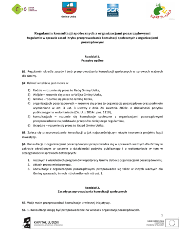 Gmina Ustka Regulamin konsultacji społecznych z organizacjami pozarządowymi Regulamin w sprawie zasad i trybu przeprowadzania konsultacji społecznych z organizacjami pozarządowymi Rozdział 1. Przepisy ogólne §1. Regulamin określa zasady i tryb przeprowadzania konsultacji społecznych w sprawach ważnych dla Gminy. §2. Ilekroć w tekście jest mowa o: 1) 2) 3) 4) Radzie – rozumie się przez to Radę Gminy Ustka, Wójcie – rozumie się przez to Wójta Gminy Ustka, Gminie - rozumie się przez to Gminę Ustka, organizacjach pozarządowych – rozumie się przez to organizacje pozarządowe oraz podmioty wymienione w art. 3 ust. 3 ustawy z dnia 24 kwietnia 2003r. o działalności pożytku publicznego i o wolontariacie (Dz. U. z 2014r. poz. 1118), 5) konsultacjach – rozumie się konsultacje społeczne z organizacjami pozarządowymi przeprowadzone na podstawie przepisów niniejszego regulaminu, 6) Urzędzie – rozumie się przez to Urząd Gminy Ustka. §3. Zaleca się przeprowadzanie konsultacji w jak najwcześniejszym etapie tworzenia projektu bądź inwestycji. §4. Konsultacje z organizacjami pozarządowymi przeprowadza się w sprawach ważnych dla Gminy w zakresie określonym w ustawie o działalności pożytku publicznego i o wolontariacie w tym w szczególności w sprawach dotyczących: 1. rocznych i wieloletnich programów współpracy Gminy Ustka z organizacjami pozarządowymi, 2. aktach prawa miejscowego, 3. konsultacje z organizacjami pozarządowymi przeprowadza się także w innych ważnych dla Gminy sprawach, innych niż określonych niż ust. 1. Rozdział 2. Zasady przeprowadzania konsultacji społecznych §5. Wójt może przeprowadzać konsultacje z własnej inicjatywy. §6. 1. Konsultacje mogą być przeprowadzone na wniosek organizacji pozarządowych. 1 Gmina Ustka 2. Wniosek o przeprowadzenie konsultacji składa się na ręce Wójta, a uprawnionych do jego złożenia jest co najmniej 5 podmiotów będących organizacjami pozarządowych posiadających swoją siedzibę na terenie Gminy lub działającymi na terenie Gminy. 3. Wniosek powinien zawierać: 1) 2) 3) 4) przedmiot termin i zasięg terytorialny konsultacji, formę przeprowadzenia konsultacji, określenie sposobu zgłaszania opinii, uwag i propozycji, uzasadnienie przeprowadzenia konsultacji i ich cel, wskazanie osoby/osób ze strony organizacji pozarządowych wyznaczonych do kontaktu w sprawie konsultacji z podaniem ich danych kontaktowych, 5) informację o sposobie dostępu do dokumentacji dotyczącej przedmiotu konsultacji, 6) załącznik w postaci listy organizacji pozarządowych popierających wniosek wraz z podpisami osób uprawnionych do ich reprezentowania. 4. Wzór wniosku o przeprowadzenie konsultacji stanowi załącznik do niniejszego Regulaminu. 5. Procedura rozpatrywania wniosku, o którym mowa w ust. 2-4: 1) 2) 3) 4) 5) wniosek spełniający wymogi określone w ust. 3 jest rozpatrywany przez Wójta, w przypadku, gdy wniosek nie spełnia wymogów, Wójt wzywa do uzupełnienia braków, składający wniosek uzupełniają braki w ciągu 3 dni od dostarczenia wezwania, wnioski nieuzupełnione pozostają bez rozpatrzenia, Wójt rozpatruje wniosek, uwzględniając koszty proponowanej formy konsultacji, istotność przedmiotu konsultacji dla społeczności lokalnej oraz zasadność proponowanego sposobu konsultacji, 6) Wójt podejmuje decyzję o przeprowadzeniu konsultacji w formie zarządzenia umieszczanego w ciągu 30 dni od daty przedłożenia wniosku w sprawie konsultacji w Biuletynie Informacji Publicznej, na stronie głównej Gminy oraz w gmachu Urzędu Gminy, zawierającego: a) cel i przedmiot konsultacji, b) czas rozpoczęcia i zakończenia konsultacji oraz miejsce ich przeprowadzenia, c) zasięg terytorialny d) podmioty uczestniczące w konsultacjach, e) formy przeprowadzania konsultacji, f) termin i formę przekazywania podmiotom biorącym udział w konsultacjach oraz społeczności lokalnej informacji o wynikach konsultacji, g) wskazanie jednostki organizacyjnej Gminy lub Urzędu odpowiedzialnej za przeprowadzenie konsultacji. §7. 1. Konsultacje mogą być przeprowadzone w następujących formach: 1) otwartych spotkań, zwanych dalej spotkaniami konsultacyjnymi, z przedstawicielami organizacji pozarządowych, 2) badania opinii przedstawicieli organizacji pozarządowych poprzez udostępnienie im konsultowanego projektu programu i innego dokumentu lub założeń do ww. dokumentów, 2 Gmina Ustka 3) 4) 5) 6) lub propozycji rozwiązania konsultowanej sprawy oraz formularza zgłoszenia uwagi, formularza ankiety itp., warsztatów dla reprezentantów organizacji pozarządowych umożliwiających zdobycie wiedzy na temat konsultowanej sprawy i wypracowanie rozwiązań, przekazania do zaopiniowania konsultowanych dokumentów przedstawicielom organizacji pozarządowych, badań wśród organizacji pozarządowych, innych formach uzasadnionych potrzebami i celami konsultacji. 2. Wyboru formy przeprowadzenia konsultacji dokonuje Wójt. 3. W uzasadnionych przypadkach konsultacje z organizacjami pozarządowymi mogą być prowadzone wraz z konsultacjami dla społeczności lokalnej na zasadach określonych w niniejszym Regulaminie. 4. Konsultacje wymagające specjalistycznej wiedzy mogą odbywać się z udziałem ekspertów w danej dziedzinie, którzy mogą być zapraszani w szczególności do: 1) udziału w pracach zespołów prowadzących analizę i zgłaszanych opinii i propozycji; 2) udziału w panelach ekspertów, w tym dotyczących ewaluacji danego przedsięwzięcia przedstawienia jego dotyczących; 3) sporządzenia opinii lub ekspertyz z dziedziny konsultowanego przedsięwzięcia. 5. Wójt, w uzasadnionych przypadkach, może powołać zespół opiniodawczo-konsultacyjny, którego zadaniem będzie pomoc w ocenie zasadności składanych uwag. W jego skład mogą wejść w szczególności przedstawiciele Urzędu, organizacji pozarządowych, uczelni wyższych, gminnych jednostek organizacyjnych i ekspert
