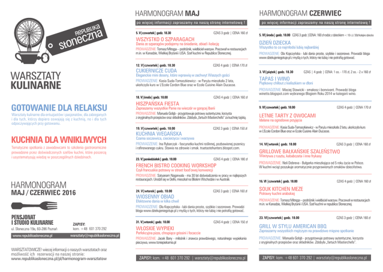 HARMONOGRAM CZERWIEC HARMONOGRAM MAJ po więcej informacji zapraszamy na naszą stronę internetową ! 5. V|czwartek| godz. 18.30 CZAS 3 godz | CENA 160 zł WSZYSTKO O SZPARAGACH Dania ze szparagów podajemy na śniadanie, obiad i kolację PROWADZENIE: Tomasz Mitręga – podróżnik, wielbiciel warzyw. Pracował w restauracjach m.in. w Kanadzie, Wielkiej Brytanii i USA. Szef kuchni w Republice Słonecznej. 12. V|czwartek| godz. 18.30 Eleganckie mini desery, które wprawią w zachwyt Waszych gości PROWADZENIE: Kasia Suda-Tomaszkiewicz - w Paryżu mieszkała 2 lata, ukończyła kurs w L'Ecole Cordon Blue oraz w Ecole Cuisine Alain Ducasse. 18. V|środa| godz. 18.00 GOTOWANIE DLA RELAKSU Warsztaty kulinarne dla entuzjastów i pasjonatów, dla zabieganych i dla tych, którzy dopiero oswajają się z kuchnią, no i dla tych odpoczywających przy gotowaniu. KUCHNIA DLA WNIKLIWYCH Tematyczne spotkania z zawodowcami to szkolenia gastronomiczne prowadzone przez doświadczonych szefów kuchni, które poszerzą i usystematyzują wiedzę w poszczególnych dziedzinach. CZAS 4 godz | CENA 160 zł HISZPAŃSKA FIESTA Wszystko to co najmłodsi lubią najbardziej PROWADZENIE: Ola Kopczyńska - lubi dania proste, szybkie i sezonowe. Prowadzi bloga www.dziekujeniegotuje.pl z myślą o tych, którzy nie lubią i nie potrafią gotować. 3. VI|piątek| godz. 18.30 CZAS | 4 godz | CENA: 1 os. - 170 zł, 2 os. - 2 x 160 zł TAPAS I WINO Piątkowy chillout z kieliszkiem w dłoni PROWADZENIE: Maciej Stawicki - smakosz i bonvivant. Prowadzi bloga winetto.blogspot.com wybranego Blogiem Roku 2014 w kategorii wino. Zapraszamy wszystkie Panie na wieczór w gorącej Iberii 9. VI|czwartek| godz. 18.00 LETNIE TARTY Z OWOCAMI 19. V|czwartek| godz. 18.00 PROWADZENIE: Kasia Suda-Tomaszkiewicz - w Paryżu mieszkała 2 lata, ukończyła kurs w L'Ecole Cordon Blue oraz w Ecole Cuisine Alain Ducasse. CZAS 3 godz | CENA 150 zł KUCHNIA WEGAŃSKA Czarna soczewica, ciecierzyca i warzywa PROWADZENIE: Ina Rybarczyk - fascynatka kuchni roślinnej, pozbawionej pszenicy i rafinowanego cukru. Stawia na zdrowie i smak. truetastehunters.blospot.com. 23. V|poniedziałek| godz. 18.00 CZAS 4 godz | CENA 180 zł Czyli francuskie potrawy w street food’owej konwencji PROWADZENIE: Satyanam Nagarwala - ma 30 lat doświadczenia w pracy w najlepszych restauracjach. Urodził się w Delhi, mieszkał na Bliskim Wschodzie i w Australii. MAJ / CZERWIEC 2016 DZIEŃ DZIECKA PROWADZENIE: Manuela Gołąb - przygotowuje potrawy autentyczne, korzysta z oryginalnych przepisów oraz składników. Zdobyła „fartuch Masterchefa” za kuchnię tajską. FRENCH BISTRO COOKING WORKSHOP HARMONOGRAM 5. VI|środa| godz. 18.00 CZAS 3 godz |CENA: 160 zł rodzic z dzieckiem < 10 r.ż / 30zł kolejne dziecko CZAS 4 godz | CENA 170 zł CUKIERNICZE CUDA WARSZTATY KULINARNE po więcej informacji zapraszamy na naszą stronę internetową ! 24. V|wtorek| godz. 18.00 CZAS 3 godz | CENA 160 zł WIOSENNY OBIAD Efektowne dania w kilka chwil PROWADZENIE: Ola Kopczyńska - lubi dania proste, szybkie i sezonowe. Prowadzi CZAS 4 godz | CENA 170 zł Idelane na ogrodowe przyjęcia 14. VI|wtorek| godz. 18.00 CZAS 3 godz | CENA 160 zł GRILLOWE BAŁKAŃSKIE SZALEŃSTWO Warzywa z rusztu, kebabczeta i inne frykasy PROWADZENIE: Neli Dobreva - Bułgarka mieszkająca od 5 roku życia w Polsce. W kuchni wciąż poszukuje aromatycznie przyprawionych smaków dzieciństwa. 16. VI |czwartek| godz. 18.00 CZAS 4 godz | CENA 160 zł SOUK KITCHEN MEZE Potrawy kuchni arabskiej PROWADZENIE: Tomasz Mitręga – podróżnik i wielbiciel warzyw. Pracował w restauracjach m.in. w Kanadzie, Wielkiej Brytanii i USA. Szef kuchni w republice Słonecznej. bloga www.dziekujeniegotuje.pl z myślą o tych, którzy nie lubią i nie potrafią gotować. 23. VI|czwartek| godz. 18.00 31. V|wtorek| godz. 18.00 601 370 292 CZAS 4 godz | CENA 150 zł WŁOSKIE WYPIEKI Perfekcyjna pizza, chrupiące grissini i focaccie PROWADZENIE: Jacek Bany - miłośnik i znawca prawdziwego, naturalnego wypiekania pieczywa, www.toniepiekarnia.pl WARSZTATOWICZE! wiecej informacji o naszych warsztatach oraz możliwość ich rezerwacji na naszej stronie: www.republikasloneczna.pl/pl/harmonogram-warsztatow ZAPISY: kom. +48 601 370 292 | [email protected] CZAS 3 godz | CENA 160 zł GRILL W STYLU AMERICAN BBQ Zapraszamy wszystkich mężczyzn na prawdziwe mięsne spotkanie PROWADZENIE: Manuela Gołąb - przygotowuje potrawy autentyczne, korzysta z oryginalnych przepisów oraz składników. Zdobyła „fartuch Masterchefa”. ZAPISY: kom. +48 601 370 292 | [email protected]
