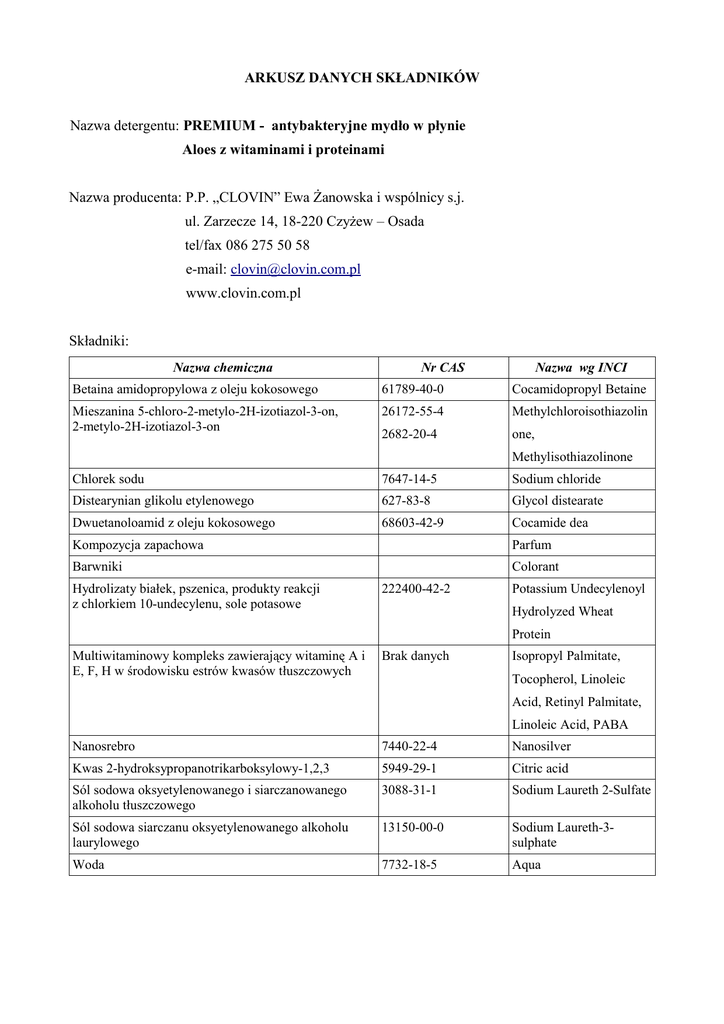ARKUSZ DANYCH SKŁADNIKÓW Nazwa detergentu: PREMIUM - antybakteryjne mydło w płynie Aloes z witaminami i proteinami Nazwa producenta: P.P. „CLOVIN” Ewa Żanowska i wspólnicy s.j. ul. Zarzecze 14, 18-220 Czyżew – Osada tel/fax 086 275 50 58 e-mail: [email protected] www.clovin.com.pl Składniki: Nazwa chemiczna Nr CAS Nazwa wg INCI Betaina amidopropylowa z oleju kokosowego 61789-40-0 Cocamidopropyl Betaine Mieszanina 5-chloro-2-metylo-2H-izotiazol-3-on, 2-metylo-2H-izotiazol-3-on 26172-55-4 Methylchloroisothiazolin 2682-20-4 one, Methylisothiazolinone Chlorek sodu 7647-14-5 Sodium chloride Distearynian glikolu etylenowego 627-83-8 Glycol distearate Dwuetanoloamid z oleju kokosowego 68603-42-9 Cocamide dea Kompozycja zapachowa Parfum Barwniki Colorant Hydrolizaty białek, pszenica, produkty reakcji z chlorkiem 10-undecylenu, sole potasowe 222400-42-2 Potassium Undecylenoyl Hydrolyzed Wheat Protein Multiwitaminowy kompleks zawierający witaminę A i E, F, H w środowisku estrów kwasów tłuszczowych Brak danych Isopropyl Palmitate, Tocopherol, Linoleic Acid, Retinyl Palmitate, Linoleic Acid, PABA Nanosrebro 7440-22-4 Nanosilver Kwas 2-hydroksypropanotrikarboksylowy-1,2,3 5949-29-1 Citric acid Sól sodowa oksyetylenowanego i siarczanowanego alkoholu tłuszczowego 3088-31-1 Sodium Laureth 2-Sulfate Sól sodowa siarczanu oksyetylenowanego alkoholu laurylowego 13150-00-0 Sodium Laureth-3sulphate Woda 7732-18-5 Aqua