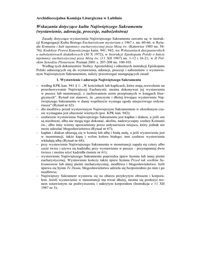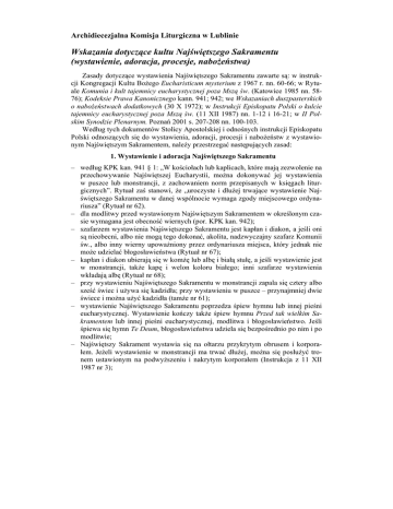 Archidiecezjalna Komisja Liturgiczna w Lublinie Wskazania dotyczące kultu Najświętszego Sakramentu (wystawienie, adoracja, procesje, nabożeństwa) Zasady dotyczące wystawienia Najświętszego Sakramentu zawarte są: w instrukcji Kongregacji Kultu Bożego Eucharisticum mysterium z 1967 r. nn. 60-66; w Rytuale Komunia i kult tajemnicy eucharystycznej poza Mszą św. (Katowice 1985 nn. 5876); Kodeksie Prawa Kanonicznego kann. 941; 942; we Wskazaniach duszpasterskich o nabożeństwach dodatkowych (30 X 1972); w Instrukcji Episkopatu Polski o kulcie tajemnicy eucharystycznej poza Mszą św. (11 XII 1987) nn. 1-12 i 16-21; w II Polskim Synodzie Plenarnym. Poznań 2001 s. 207-208 nn. 100-103. Według tych dokumentów Stolicy Apostolskiej i odnośnych instrukcji Episkopatu Polski odnoszących się do wystawienia, adoracji, procesji i nabożeństw z wystawionym Najświętszym Sakramentem, należy przestrzegać następujących zasad: 1. Wystawienie i adoracja Najświętszego Sakramentu – według KPK kan. 941 § 1: „W kościołach lub kaplicach, które mają zezwolenie na przechowywanie Najświętszej Eucharystii, można dokonywać jej wystawienia w puszce lub monstrancji, z zachowaniem norm przepisanych w księgach liturgicznych”. Rytuał zaś stanowi, że „uroczyste i dłużej trwające wystawienie Najświętszego Sakramentu w danej wspólnocie wymaga zgody miejscowego ordynariusza” (Rytuał nr 62). – dla modlitwy przed wystawionym Najświętszym Sakramentem w określonym czasie wymagana jest obecność wiernych (por. KPK kan. 942); – szafarzem wystawienia Najświętszego Sakramentu jest kapłan i diakon, a jeśli oni są nieobecni, albo nie mogą tego dokonać, akolita, nadzwyczajny szafarz Komunii św., albo inny wierny upoważniony przez ordynariusza miejsca, który jednak nie może udzielać błogosławieństwa (Rytuał nr 67); – kapłan i diakon ubierają się w komżę lub albę i białą stułę, a jeśli wystawienie jest w monstrancji, także kapę i welon koloru białego; inni szafarze wystawienia wkładają albę (Rytuał nr 68); – przy wystawieniu Najświętszego Sakramentu w monstrancji zapala się cztery albo sześć świec i używa się kadzidła; przy wystawieniu w puszce – przynajmniej dwie świece i można użyć kadzidła (tamże nr 61); – wystawienie Najświętszego Sakramentu poprzedza śpiew hymnu lub innej pieśni eucharystycznej. Wystawienie kończy także śpiew hymnu Przed tak wielkim Sakramentem lub innej pieśni eucharystycznej, modlitwa i błogosławieństwo. Jeśli śpiewa się hymn Te Deum, błogosławieństwa udziela się bezpośrednio po nim i po modlitwie; – Najświętszy Sakrament wystawia się na ołtarzu przykrytym obrusem i korporałem. Jeżeli wystawienie w monstrancji ma trwać dłużej, można się posłużyć tronem ustawionym na podwyższeniu i nakrytym korporałem (Instrukcja z 11 XII 1987 nr 3); Wskazania dotyczące kultu Najświętszego Sakramentu 97 – wystawienie Najświętszego Sakramentu, w puszce lub monstrancji, jest wyznaniem wiary w obecność Chrystusa, zachęca do serdecznego zjednoczenia się z Nim, gorliwego rozważania i adoracji tej tajemnicy (por. Rytuał nr 58 i 62). – przy wystawieniu trwającym krótko należy „poświęcić pewien czas na czytanie słowa Bożego, śpiew, modlitwy i krótką modlitwę w ciszy. Zakazane jest wystawienie, które ma na celu tylko udzielenie błogosławieństwa” (Rytuał nr 65; por. EM nr 65). – modlitwa przed Najświętszym Sakramentem ma przypominać wiernym, że „ta obecność wypływa z Ofiary i ma jednocześnie na uwadze Komunię świętą sakramentalną i duchową” (EM nr 50; por. Rytuał nr 56). – pobożność eucharystyczna wyraża się w tym, że wierni „przebywając przy Chrystusie Panu, cieszą się Jego głęboką i zażyłą przyjaźnią i otwierają przed Nim swe serce, przedstawiają Mu potrzeby własne oraz wszystkich sobie bliskich, i modlą się o pokój i zbawienie świata” (Rytuał nr 56); „przedłużają zjednoczenie w Nim, które osiągnęli w Komunii św. i odnawiają przymierze, pobudzające ich do zachowywania w życiu i obyczajach tego, co przez wiarę i sakrament otrzymali w sprawowaniu Eucharystii” (tamże nr 57). – adoracja i modlitwy przed wystawionym Najświętszym Sakramentem powinny mieć wyraźnie chrystocentryczny charakter i koncentrować się na Osobie i dziele zbawczym dokonanym przez Jezusa Chrystusa. Podczas wystawienia należy tak ułożyć modlitwy, śpiewy i czytania, aby wierni skupili swoją uwagę na Chrystusie Panu (Rytuał nr 71). Powinny one uczyć wiernych prawdziwej pobożności eucharystycznej, wyrażać radość zebranych ze spotkania z Chrystusem, któremu z wiarą przedkładają potrzeby swoje, swoich bliskich i Kościoła, oraz modlą się za zbawienie całego świata. Udział w adoracji ma prowadzić do pełnienia dobrych czynów i do dawania świadectwa o Chrystusie w swoim środowisku; – w czasie adoracji powinna dominować modlitwa uwielbienia i dziękczynienia połączona z rozważaniem tajemnic Chrystusa, ale także modlitwa prośby w aktualnych potrzebach społeczności wiernych i całego Kościoła; – w adoracji eucharystycznej, w modlitwach, czytaniach i śpiewach należy uwzględnić okres liturgiczny; – w czasie adoracji nie może zabraknąć świętego milczenia, czyli czasu przeznaczonego na osobistą modlitwę każdego z uczestników; – II Polski Synod plenarny stanowi, że „wspólnotowa adoracja Najświętszego Sakramentu powinna odbywać się w każdej parafii raz w miesiącu w ustalonym dniu, np. w pierwszy czwartek, piątek lub niedzielę miesiąca. Zaleca się też godzinną adorację w ciągu tygodnia” (nr 100); – jeśli adoracja ma miejsce po Mszy św. w niedziele i obowiązujące święta, w czasie Mszy św. głosi się jak zwykle homilię; – jeśli bezpośrednio po Mszy św. następuje nabożeństwo, w którym nie będzie uczestniczyć całe zgromadzenie, po m