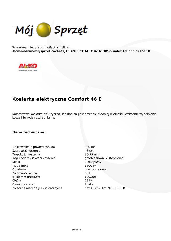 Warning: Illegal string offset 'small' in /home/admin/mojsprzet/cache/3_1^%%C3^C3A^C3A1613B%%index.tpl.php on line 18 Kosiarka elektryczna Comfort 46 E Komfortowa kosiarka elektryczna, idealna na powierzchnie średniej wielkości. Wskaźnik wypełnienia kosza i funkcja rozdrabniania. Dane techniczne: Do trawnika o powierzchni do Szerokość koszenia Wysokość koszenia Regulacja wysokości koszenia Silnik Moc silnika Obudowa Pojemność kosza Ø kół mm przód/tył Ciężar Okres gwarancji Polecane materiały eksploatacyjne 900 m² 46 cm 25-75 mm grzebieniowa, 7-stopniowa elektryczny 1600 W blacha stalowa 65 l 180/205 26 kg 3 lata nóż 46 cm (Art. Nr 118 613) Strona 1 z 1