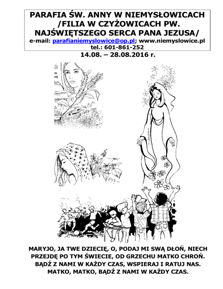 PARAFIA ŚW. ANNY W NIEMYSŁOWICACH /FILIA W CZYŻOWICACH PW. NAJŚWIĘTSZEGO SERCA PANA JEZUSA/ e-mail: [email protected]; www.niemyslowice.pl tel.: 601-861-252 14.08. – 28.08.2016 r. MARYJO, JA TWE DZIECIĘ, O, PODAJ MI SWĄ DŁOŃ, NIECH PRZEJDĘ PO TYM ŚWIECIE, OD GRZECHU MATKO CHROŃ. BĄDŹ Z NAMI W KAŻDY CZAS, WSPIERAJ I RATUJ NAS. MATKO, MATKO, BĄDŹ Z NAMI W KAŻDY CZAS. PORZĄDEK NABOŻEŃSTW - 14.08.-28.08.2016. XX NIEDZIELA ZWYKŁA, 14 sierpnia - W NIEMYSŁOWICACH: UROCZYSTOŚĆ ODPUSTOWA KU CZCI ŚW. ANNY., Patronki naszej Parafii, Głównej Patronki Diecezji Opolskiej 7.30 Za + ojca Stefana Okłót w 10. r. śm., ++ dziadków Marię i Stanisława Okłót oraz Dorotę Wnęk. 9.30 W Czyżowicach: O bł. Boże dla Jadwigi Szandurskiej z okazji 60. r. urodzin. 11.30 SUMA ODPUSTOWA – ZA PARAFIAN Za + Stanisława Boskiego w 21. r. śm. oraz + Janinę Boską. O bł. Boże dla Eweliny i Krzysztofa z okazji 5. r. ślubu oraz z okazji urodzin Eweliny (odprawi drugi ksiądz) Poniedziałek, 15 sierpnia UROCZYSTOŚĆ WNIEBOWZIĘCIA NAJŚWIĘTSZEJ MARYI PANNY. /w czasie każdej Mszy św. – Błogosławieństwo ziół i kwiatów/. 31 r. Konsekracji ks. Biskupa Jana Bagińskiego. 7.30 Za + Sylwię Dwojak w 3. r. śm., ++ rodziców Antoninę i Mieczysława, + brata Zygmunta oraz szwagrów Kazimierza i Krzysztofa. 9.30 Za + Marię i Rafała oraz Stanisława i Józefę Olejarzów. Za ++ z rodziny Grzechników i Rudolfów. 11.00 Za ++ rodziców Wiktorię i Stanisława Koryznów, i ++ chrzestnych Z podziękowaniem za otrzymane łaski, z prośbą o zdrowie i bł. Boże dla Marii i Andrzeja, Agnieszki i Łukasza, Edyty i Łukasza, w r. ślubu oraz dla wnuków Bartosza i Dominika. Wtorek, 16 sierpnia 8.00 Za + Zbigniewa i Emila Zielińskich. Środa, 17 sierpnia – Uroczystość św. Jacka, kapłana, głównego patrona Metropolii Górnośląskiej. 18.00 O zdrowie i bł. Boże dla dzieci, wnuków i prawnuków. Czwartek, 18 sierpnia 18.00 Za + Bronisława i Rozalię Zarosińskich, dziadków z obu stron oraz + Władysława Gałagun. Piątek, 19 sierpnia 18.00 Za + Marię Trojniak w 3. r. śm., Mariana Trojniaka i ++ dziadków z obu stron. Sobota, 20 sierpnia Wspomnienie św. Bernarda, opata i doktora Kościoła. 18.00 W Czyżowicach: Za + Stanisława i Franciszka oraz siostrę Loretę Berbeciów. O bł. Boże dla Zawodników LZS Czyżowice. XXI NIEDZIELA ZWYKŁA, 21 sierpnia UROCZYSTOŚĆ DOŻYNKOWA W CZYŻOWICACH 7.30 O bł. Boże dla wnuków: Stanisława, Karoliny i Malwiny oraz ich rodziców i chrzestnych. 10.00 W Czyżowicach: Msza św. Dożynkowa: Z podziękowaniem Bogu za dary ziemi, z prośbą o błogosławieństwo Boże dla rolników i mieszkańców Czyżowic. 11.30 O bł. Boże dla Natalii Dobrzynieckiej z okazji 1. r. urodzin oraz dla jej rodziców i chrzestnych. O bł. Boże dla Antoniego Dobko z okazji 1. r. urodzin oraz dla jego rodziców i chrzestnych. Poniedziałek, 22 sierpnia Wspomnienie Najświętszej Maryi Panny, Królowej. 18.00 O zdrowie i bł. Boże dla Marii i Adama Sikorów z okazji 35. r. ślubu oraz o opiekę Bożą nad rodziną. Wtorek, 23 sierpnia 8.00 Za + Antoninę, Jana i Jerzego Schirmeisen oraz + Jana Kaszoid. Środa, 24 sierpnia – Święto św. Bartłomieja, Apostoła. 18.00 Za + Andrzeja Górawskiego, brata Mieczysława, ojca Stanisława oraz dziadków Adelę i Jakuba Szewczuków. Czwartek, 25 sierpnia 18.00 Za + Adelę, Jakuba i Aleksandra Szewczuków. Piątek, 26 sierpnia Uroczystość Najświętszej Maryi Panny Częstochowskiej. 18.00 Za + ks. Marcina Szewczuka (ofiarowana przez Kazimierę Wiśniewską). Sobota, 27 sierpnia – Wspomnienie św. Moniki. 18.00 W Czyżowicach: Za + Kamila Dancewicza w 5. r. śm. oraz + Marię i Stanisława Wójcików. XXII NIEDZIELA ZWYKŁA, 28 sierpnia 7.30 O zdrowie i bł. Boże w rodzinie Marszałków. 9.30 W Czyżowicach: Za ++ rodziców Ryszarda i Barbarę Stanków i ++ dziadków z obu stron. 11.00 Za + Mariana Kościelniaka w r. śm. i ++ z rodziny. Za + Grzegorza Świercza w r. śm., Zdzisławę Działoszyńską, + ks. Piotra Oparę, jego rodziców oraz + Kornelię Działoszyńską. O bł. Boże dla Jakuba Szablowskiego, jego rodziców i chrzestnych. /w czasie Mszy św. Jakub Szablowski otrzyma Sakrament Chrztu św./. OGŁOSZENIA PARAFIALNE 14.08. – 28.08.2016. *Serdeczne Bóg zapłać za Wasze modlitwy, prace i ofiary na rzecz naszej parafii i naszych kościołów. *W niedzielę (28.08.) przedstawiciele Rady Duszpasterskiej będą zbierać ofiary na potrzeby kościoła w Niemysłowicach. Za składane ofiary serdeczne Bóg zapłać. Najbliższe ważne daty w 2016 roku: -Odpust Parafialny w Niemysłowicach, ku czci św. Anny: 14 sierpnia, niedziela, godz. 11.30, przy udziale księży z dekanatu „Prudnik”. Sumę Odpustową odprawi i Słowo Boże na wszystkich Mszach św. wygłosi ks. Stanisław Dworzak, proboszcz Parafii bł. Czesława w Opolu -21 sierpnia, niedziela, godz. 10.00 – Czyżowice – Msza św. Dożynkowa. *Planowane daty Uroczystości 1 Komunii św. w 2017 roku: 30 kwietnia, niedziela, godz. 11.00 – Czyżowice; 7 maja, niedziela, godz. 11.30 – Niemysłowice. *Zapowiedzi Przedmałżeńskie: Krystyna Szandurska (Czyżowice) i Mateusz Minartowicz (Braciszów), zapowiedź III, Katarzyna Pławecka (Niemysłowice) i Michał Dancewicz (Niemysłowice), zapowiedź III. Karolina Koszela (Czyżowice) i Łukasz Wójcik (Czyżowice), zapowiedź III. *Jubileuszowa – 40-ta Opolska Piesza Pielgrzymka na Jasną Górę odbędzie się w tym roku w dniach od 15 do 20 sierpnia. Można jeszcze zgłosić chęć udziału w Pielgrzymce. Szczegółowe informacje na ten temat można otrzymać w zakrystii lub kancelarii parafialnej, i pod nr tel. 601 861 252. Zachęcamy też do duchowego pielgrzymowania, poprzez codzienne odmawianie Koronki do Miłosierdzia Bożego, w duchowej łączności z pielgrzymami. W sobotę, 20 sierpnia o godz. 11.00 na Jasnogórskim szczycie odbędzie się Msza św. dla pielgrzymów, na zakoń