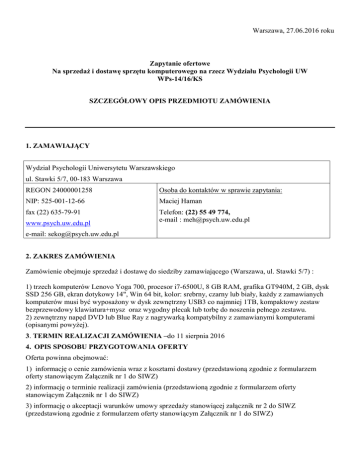 Warszawa, 27.06.2016 roku Zapytanie ofertowe Na sprzedaż i dostawę sprzętu komputerowego na rzecz Wydziału Psychologii UW WPs-14/16/KS SZCZEGÓŁOWY OPIS PRZEDMIOTU ZAMÓWIENIA 1. ZAMAWIAJĄCY Wydział Psychologii Uniwersytetu Warszawskiego ul. Stawki 5/7, 00-183 Warszawa REGON 24000001258 Osoba do kontaktów w sprawie zapytania: fax (22) 635-79-91 Telefon: (22) 55 49 774, e-mail : [email protected] NIP: 525-001-12-66 www.psych.uw.edu.pl e-mail: [email protected] Maciej Haman 2. ZAKRES ZAMÓWIENIA Zamówienie obejmuje sprzedaż i dostawę do siedziby zamawiającego (Warszawa, ul. Stawki 5/7) : 1) trzech komputerów Lenovo Yoga 700, procesor i7-6500U, 8 GB RAM, grafika GT940M, 2 GB, dysk SSD 256 GB, ekran dotykowy 14", Win 64 bit, kolor: srebrny, czarny lub biały, każdy z zamawianych komputerów musi być wyposażony w dysk zewnętrzny USB3 co najmniej 1TB, kompaktowy zestaw bezprzewodowy klawiatura+mysz oraz wygodny plecak lub torbę do noszenia pełnego zestawu. 2) zewnętrzny napęd DVD lub Blue Ray z nagrywarką kompatybilny z zamawianymi komputerami (opisanymi powyżej). 3. TERMIN REALIZACJI ZAMÓWIENIA –do 11 sierpnia 2016 4. OPIS SPOSOBU PRZYGOTOWANIA OFERTY Oferta powinna obejmować: 1) informację o cenie zamówienia wraz z kosztami dostawy (przedstawioną zgodnie z formularzem oferty stanowiącym Załącznik nr 1 do SIWZ) 2) informację o terminie realizacji zamówienia (przedstawioną zgodnie z formularzem oferty stanowiącym Załącznik nr 1 do SIWZ) 3) informację o akceptacji warunków umowy sprzedaży stanowiącej załącznik nr 2 do SIWZ (przedstawioną zgodnie z formularzem oferty stanowiącym Załącznik nr 1 do SIWZ) 4) szczegółowy opis oferowanego sprzętu wraz z informacją o długości udzielanej gwarancji. Oferty można wysyłać pocztą elektroniczną na adres: [email protected] Nieprzekraczalny termin dostarczenia oferty to: 13.07.2016. do godziny 10.00. 7. OCENA OFERT i) Ocenie poddane zostaną tylko te oferty, które zawierają wszystkie elementy wymienione w pkt. 4. ii) Przy wyborze ofert Zamawiający będzie się kierował kryteriami: Kryterium Waga 1 Cena zamówienia brutto 90 2 Termin dostawy zamówienia 5 3 Długość gwarancji udzielanej na sprzęt 5 RAZEM 100 Punkty przyznane w poszczególnych kryteriach danej ofercie zostaną do siebie dodane. Komisja wybierze oferenta, który uzyska największą liczbę punktów. 8. DODATKOWE INFORMACJE i) W celu realizacji zamówienia z wybranym Wykonawcą zostanie umowa ii) Zamawiający zastrzega sobie możliwość negocjacji szczegółowych warunków realizacji umowy z najlepszymi oferentami. iii) Zamawiający zastrzega sobie prawo do nie wybrania żadnego Wykonawcy. Załącznik nr 1. Wzór oferty Wykonawca: WZÓR Adres Wykonawcy: Całkowita cena netto za VAT realizację zamówienia – łącznie za całość (w zł) 1) trzy komputery Lenovo Yoga 700, procesor i7-6500U, 8 GB RAM, grafika GT940M, 2 GB, dysk SSD 256 GB, ekran dotykowy 14", Win 64 bit, kolor: srebrny, czarny lub biały, każdy z komputerów wyposażony w dysk zewnętrzny USB3 co najmniej 1TB, kompaktowy zestaw bezprzewodowy klawiatura+mysz oraz plecak lub torbę 2) zewnętrzny napęd DVD lub Blue Ray z nagrywarką kompatybilny z zamawianymi komputerami (opisanymi powyżej). 3) Dostawa zamówienia do siedziby zamawiającego (Warszawa, ul. Stawki 5/7) Całkowita cena brutto za realizację zamówienia –łącznie za całość (w zł) Czas potrzebny na realizację zamówienia (wraz z dostawą) :............... dni roboczych Sprzedawca akceptuje warunki umowy stanowiącej załącznik nr 2 do Zapytania ofertowego nr WPs- 14/2016/KS ……………………………… Miejscowość i data ….………………………….. Podpis i pieczęć Wykonawcy Załącznik nr 2. Wzór umowy UMOWA SPRZEDAŻY NR Zawarta w dniu ……………………... w Warszawie pomiędzy: Uniwersytetem Warszawskim ul. Krakowskie Przedmieście 26/28, 00-927 Warszawa zwanym w dalszej części Kupującym, posiadającym NIP: 525-001-12-66, Regon : 000001258 reprezentowanym przez: dr hab. Ewę Czerniawską prof. UW - Dziekan Wydziału Psychologii a ...................................., ........................................., ........................, numer KRS.................................... NIP: ............................... Regon: ................................. reprezentowaną przez: ................................................................ zwaną w dalszej treści umowy Sprzedawcą, na potrzeby realizacji projektu NCN BEETHOVEN nr umowyUMO-2014/15/G/HS6/04604; w trybie art. 4.8. ustawy Prawo zamówień publicznych zawarto umowę następującej treści: §1 Przedmiot Umowy Sprzedawca zobowiązuje się przenieść na własność Kupującego trzy laptopy Lenovo Yoga 700 (procesor i7-6500U, 8 GB RAM, grafika GT940M, 2 GB, dysk SSD 256 GB, ekran dotykowy 14", Win 64 bit, kolor: srebrny, czarny lub biały, każdy z zamawianych komputerów musi być wyposażony w dysk zewnętrzny USB3 co najmniej 1TB, kompaktowy zestaw bezprzewodowy klawiatura+mysz oraz wygodny plecak lub torbę do noszenia pełnego zestawu), jeden zewnętrzny napęd DVD lub Blue Ray z nagrywarką kompatybilny z zamawianymi komputerami (opisanymi powyżej) oraz dostarczyć zamówienie na adres Warszawa, ul. Stawki 5/7, Kupujący zobowiązuje się odebrać je i zapłacić umowną cenę. §2 Terminy Termin dostawy ustala się na ................. dni roboczych od podpisania umowy. 1. 2. 3. 1. 1) 2) 2. §3 Zasady płatności Strony ustalają za wykonanie przedmiotu umowy cenę w wysokości: ..................... zł + .......VAT = .................... zł (słownie: ....................................................................................... zł ....................) Należność będzie płatna przelewem w ciągu 14 dni od daty otrzymania oryginału faktury przez Kupującego, wystawionej po dostarczeniu końcówek do pipet Kupującemu. Sprzedawca bez zgody Kupującego nie może przeni