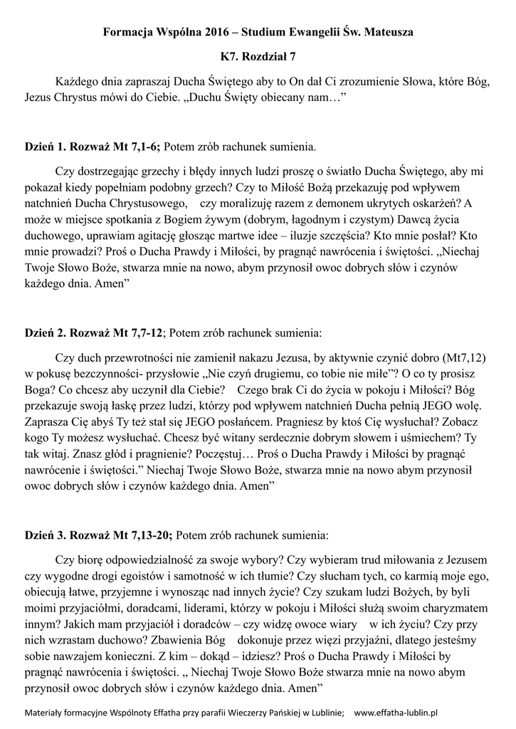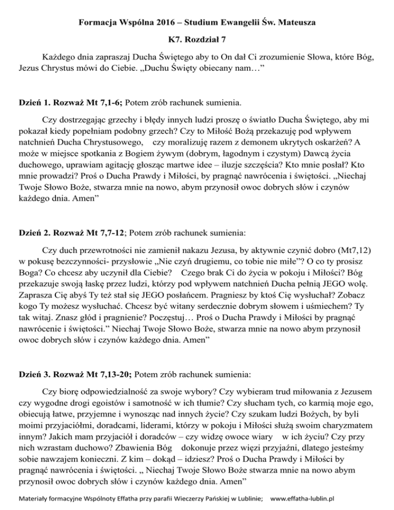 Formacja Wspólna 2016 – Studium Ewangelii Św. Mateusza K7. Rozdział 7 Każdego dnia zapraszaj Ducha Świętego aby to On dał Ci zrozumienie Słowa, które Bóg, Jezus Chrystus mówi do Ciebie. „Duchu Święty obiecany nam…” Dzień 1. Rozważ Mt 7,1-6; Potem zrób rachunek sumienia. Czy dostrzegając grzechy i błędy innych ludzi proszę o światło Ducha Świętego, aby mi pokazał kiedy popełniam podobny grzech? Czy to Miłość Bożą przekazuję pod wpływem natchnień Ducha Chrystusowego, czy moralizuję razem z demonem ukrytych oskarżeń? A może w miejsce spotkania z Bogiem żywym (dobrym, łagodnym i czystym) Dawcą życia duchowego, uprawiam agitację głosząc martwe idee – iluzje szczęścia? Kto mnie posłał? Kto mnie prowadzi? Proś o Ducha Prawdy i Miłości, by pragnąć nawrócenia i świętości. „Niechaj Twoje Słowo Boże, stwarza mnie na nowo, abym przynosił owoc dobrych słów i czynów każdego dnia. Amen” Dzień 2. Rozważ Mt 7,7-12; Potem zrób rachunek sumienia: Czy duch przewrotności nie zamienił nakazu Jezusa, by aktywnie czynić dobro (Mt7,12) w pokusę bezczynności- przysłowie „Nie czyń drugiemu, co tobie nie miłe”? O co ty prosisz Boga? Co chcesz aby uczynił dla Ciebie? Czego brak Ci do życia w pokoju i Miłości? Bóg przekazuje swoją łaskę przez ludzi, którzy pod wpływem natchnień Ducha pełnią JEGO wolę. Zaprasza Cię abyś Ty też stał się JEGO posłańcem. Pragniesz by ktoś Cię wysłuchał? Zobacz kogo Ty możesz wysłuchać. Chcesz być witany serdecznie dobrym słowem i uśmiechem? Ty tak witaj. Znasz głód i pragnienie? Poczęstuj… Proś o Ducha Prawdy i Miłości by pragnąć nawrócenie i świętości.” Niechaj Twoje Słowo Boże, stwarza mnie na nowo abym przynosił owoc dobrych słów i czynów każdego dnia. Amen” Dzień 3. Rozważ Mt 7,13-20; Potem zrób rachunek sumienia: Czy biorę odpowiedzialność za swoje wybory? Czy wybieram trud miłowania z Jezusem czy wygodne drogi egoistów i samotność w ich tłumie? Czy słucham tych, co karmią moje ego, obiecują łatwe, przyjemne i wynosząc nad innych życie? Czy szukam ludzi Bożych, by byli moimi przyjaciółmi, doradcami, liderami, którzy w pokoju i Miłości służą swoim charyzmatem innym? Jakich mam przyjaciół i doradców – czy widzę owoce wiary w ich życiu? Czy przy nich wzrastam duchowo? Zbawienia Bóg dokonuje przez więzi przyjaźni, dlatego jesteśmy sobie nawzajem konieczni. Z kim – dokąd – idziesz? Proś o Ducha Prawdy i Miłości by pragnąć nawrócenia i świętości. „ Niechaj Twoje Słowo Boże stwarza mnie na nowo abym przynosił owoc dobrych słów i czynów każdego dnia. Amen” Materiały formacyjne Wspólnoty Effatha przy parafii Wieczerzy Pańskiej w Lublinie; www.effatha-lublin.pl Dzień 4. Rozważ Mt 7,21-27; Potem zrób rachunek sumienia: Czy kocham Jezusa – słucham co mówi i z ufnością opowiadam Mu o sobie? Czy znam pragnienia Jego serca? Czy szukam tylko okazji, aby popisywać się nie swoją mocą – zabłysnąć przed ludźmi? Czy da się zaimponować tym Bogu? On do nieba(wiecznego Królestwa Miłości) zaprasza swych przyjaciół, którzy wytrwali w miłości do końca. Uczy nas jak budować dom duchowego życia, kamień po kamieniu, każde Jego Słowo, zamieniając w czyn mocą Jego Ducha. To jest wolą Boga Ojca, abyśmy naśladując Jezusa stali się JEGO dziećmi. Proś o Ducha Prawdy i Miłości by pragnąć nawrócenia i świętości. „ Niechaj Twoje Słowo Boże stwarza mnie na nowo abym przynosił owoc dobrych słów i czynów każdego dnia. Amen” Dzień 5. Rozważ Mt 7,24-29; Potem zrób rachunek sumienia: Czy słucham Jezusa – słucham co mówi Bóg, ten który ma władzę nad całym wszechświatem? Czy znam Jego plan zbawienia mnie – czy chcę go realizować? Czy ufam Jego Mądrości? Czy wypełniam Jego Słowo to zapisane w 5,6 i 7 rozdziale Ewangelii Świętego Mateusza? Przeczytaj jeszcze raz Mt 5 i wypisz w punktach, do czego wzywa Jezus. Które Jego Słowo zamieniasz w czyn mocą Jego Ducha? Napisz obok sobie ocenę na ile już umiesz naśladować Jezusa. Proś o Ducha Prawdy i Miłości, by pragnąć nawrócenia i świętości. „ Niechaj Twoje Słowo Boże stwarza mnie na nowo abym przynosił owoc dobrych słów i czynów każdego dnia. Amen” Dzień 6. Rozważ Mt 7,24-25; Potem zrób rachunek sumienia: Czy słucham Jezusa – czy znam Jego plan zbawienia mnie – czy chcę go realizować? Czy ufam Jego Mądrości i wypełniam Jego Słowo? Przeczytaj jeszcze raz Mt6 i wypisz w punktach do czego wzywa Jezus. Które Jego Słowo zamieniasz w czyn? Napisz ocenę, na ile już umiesz naśladować Jezusa. Proś o Ducha Prawdy i Miłości by pragnąć nawrócenia i świętości. „ Niechaj Twoje Słowo Boże stwarza mnie na nowo abym przynosił owoc dobrych słów i czynów każdego dnia. Amen” Materiały formacyjne Wspólnoty Effatha przy parafii Wieczerzy Pańskiej w Lublinie; www.effatha-lublin.pl