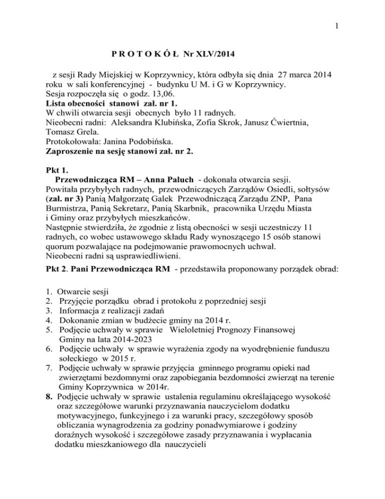 1 P R O T O K Ó Ł Nr XLV/2014 z sesji Rady Miejskiej w Koprzywnicy, która odbyła się dnia 27 marca 2014 roku w sali konferencyjnej - budynku U M. i G w Koprzywnicy. Sesja rozpoczęła się o godz. 13,06. Lista obecności stanowi zał. nr 1. W chwili otwarcia sesji obecnych było 11 radnych. Nieobecni radni: Aleksandra Klubińska, Zofia Skrok, Janusz Ćwiertnia, Tomasz Grela. Protokołowała: Janina Podobińska. Zaproszenie na sesję stanowi zał. nr 2. Pkt 1. Przewodnicząca RM – Anna Paluch - dokonała otwarcia sesji. Powitała przybyłych radnych, przewodniczących Zarządów Osiedli, sołtysów (zał. nr 3) Panią Małgorzatę Galek Przewodniczącą Zarządu ZNP, Pana Burmistrza, Panią Sekretarz, Panią Skarbnik, pracownika Urzędu Miasta i Gminy oraz przybyłych mieszkańców. Następnie stwierdziła, Ŝe zgodnie z listą obecności w sesji uczestniczy 11 radnych, co wobec ustawowego składu Rady wynoszącego 15 osób stanowi quorum pozwalające na podejmowanie prawomocnych uchwał. Nieobecni radni są usprawiedliwieni. Pkt 2. Pani Przewodnicząca RM - przedstawiła proponowany porządek obrad: 1. 2. 3. 4. 5. Otwarcie sesji Przyjęcie porządku obrad i protokołu z poprzedniej sesji Informacja z realizacji zadań Dokonanie zmian w budŜecie gminy na 2014 r. Podjęcie uchwały w sprawie Wieloletniej Prognozy Finansowej Gminy na lata 2014-2023 6. Podjęcie uchwały w sprawie wyraŜenia zgody na wyodrębnienie funduszu sołeckiego w 2015 r. 7. Podjęcie uchwały w sprawie przyjęcia gminnego programu opieki nad zwierzętami bezdomnymi oraz zapobiegania bezdomności zwierząt na terenie Gminy Koprzywnica w 2014r. 8. Podjęcie uchwały w sprawie ustalenia regulaminu określającego wysokość oraz szczegółowe warunki przyznawania nauczycielom dodatku motywacyjnego, funkcyjnego i za warunki pracy, szczegółowy sposób obliczania wynagrodzenia za godziny ponadwymiarowe i godziny doraźnych wysokość i szczegółowe zasady przyznawania i wypłacania dodatku mieszkaniowego dla nauczycieli 2 9. Podjęcie uchwały w sprawie udzielenia pomocy finansowej 10. Zapytania i wolne wnioski 11. Zamknięcie obrad sesji. Nikt nie zgłaszał chęci zabrania głosu. Kto z państwa radnych jest za przyjęciem zaproponowanego porządku? Za przyjęciem głosowało 10 radnych - jednogłośnie. W trakcie głosowania nieobecny radny Łabik. Pani Przewodnicząca RM - stwierdziła, Ŝe porządek dzisiejszej sesji został przyjęty. Pani Przewodnicząca RM - zapytała o uwagi, co do protokołów z sesji w dniach 24 stycznia 2014r. i 10 lutego 2014r.? Nikt nie zgłaszał uwag. Pani Przewodnicząca RM - zapytała, kto z państwa radnych jest za przyjęciem protokołów z sesji, które odbyły się w dniach 24 stycznia 2014 r. i 10 lutego 2014r.? Za przyjęciem głosowało 8 radnych, przy 2 głosach wstrzymujących. W trakcie głosowania nieobecny radny Łabik. Pani Przewodnicząca RM - stwierdziła, Ŝe protokoły z sesji w dniach 24 stycznia 2014 r. i 10 lutego 2014r. zostały przyjęte. Pkt 3. Informacja z realizacji zadań Pan Burmistrz – Pani Przewodnicząca, Wysoka Rado, Państwo Sołtysi, Przewodniczący ZO, Szanowni Goście, dalej powiedział, Ŝe gmina podpisała umowę na wykonanie zadania pod nazwą wymiana wodociągu Koprzywnica – Krzcin i w Krzcinie na wartość 1.150 tys. zł. Przetarg został ogłoszony, a otwarcie kopert ofertowych nastąpi w dniu 8 kwietnia. Jest zainteresowanie duŜe i duŜo pytań technicznych, na które odpowiadamy sprawnie i szybko. WaŜne jest to, Ŝe naleŜy w tym roku wykonać i rozliczyć. Ponadto gmina przygotowuje się do kolejnego konkursu, który dotyczy gospodarki wodno – ściekowej, szczegóły na kolejnej sesji. 3 Przy realizacji zadania wymiana wodociągów zostanie wykonanych szereg innych drobniejszych, ale waŜnych spraw w dziedzinie kanalizacji i uzupełnienie brakującego wodociągu tzn. uzbrojenie terenu. Pani Przewodnicząca RM - jako mieszkanka Błonia zapytała, czy jest coś wiadome w kwestii budowy świetlic, a czy nadal jest tylko nadzieja? Pan Burmistrz - powiedział, Ŝe nadzieja umiera ostatnia i dlatego trzeba Ŝyć nadzieją niemalŜe w kaŜdej dziedzinie. Dalej powiedział, Ŝe nie ma ogłoszonego konkursu. Choć Urząd Marszałkowski obiecywał ogłoszenie konkursu na „Odnowę Wsi”. Nasze środki są zbyt małe i czekamy na duŜe środki, na dzień dzisiejszy nic nie jest wiadome. Jak będzie to z pewnością sprawi nam wszystkim przyjemność i radość, Ŝe kolejne inwestycje będą powstawać. Pani Przewodnicząca RM - powiedziała, Ŝe dobrze by było, aby te środki były, a jak nie będzie to naleŜałoby jakąś inwestycję w tych miejscowościach zrobić za to, Ŝe nie będzie tych świetlic. Pan Burmistrz - powiedział, Ŝe juŜ wspomniał, iŜ został ogłoszony konkurs na inwestycję, która została zlokalizowana w Błoniu odnośnie wodociągu. Pani Przewodnicząca RM - powiedziała, Ŝe będzie to usytuowane w Błoniu, ale nie będzie dotyczyć mieszkańców Błonia tylko Sośniczan. Jako inwestycja nie wnosi nic dla mieszkańców Błonia. Nikt więcej nie zgłaszał chęci zabrania głosu. Pkt 4. Dokonanie zmian w budŜecie gminy na 2014r. Pani Skarbnik – poinformowała jeszcze o jednej małej zmianie, która polega na przeniesieniu w rozdziale promocja gminy z paragrafu materiały na paragraf dotacyjny, stowarzyszenia - Szlak Jabłkowy. Ma być realizowany projekt Góry Świętokrzyskie Naszą Przyszłością będzie to promocja ziemi sandomierskiej, jest to 1500 zł od gminy. Nikt nie zgłaszał chęci zabrania głosu. Pani Przewodnicząca RM - odczytała projekt uchwały w sprawie dokonania zmian w budŜecie gminy na 2014r. W N I O S E K - kto z państwa radnych jest za podjęciem przedstawionego projektu uchwały zgodnie z zał. nr 4? 4 Za wnioskiem głosowało 9 radnych, przy 1 głosie przeciwnym i 1 głosie wstrzymującym. Pani Przewodnicząca RM stwierdziła, Ŝe uchwała została podjęta. UCHWAŁA NR XLV/